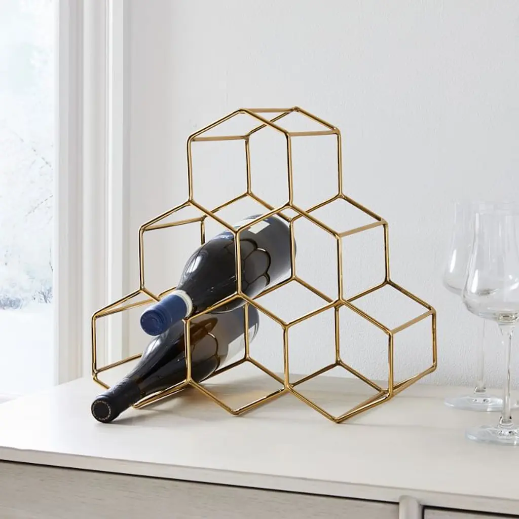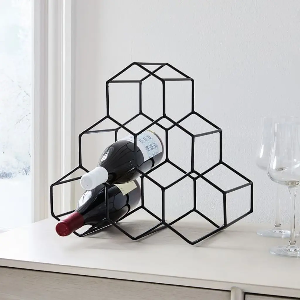 13.25"w x 6.75"d x 12.75"h. Mild steel. Holds up to 6 wine bottles. Sold individually. Made in India.