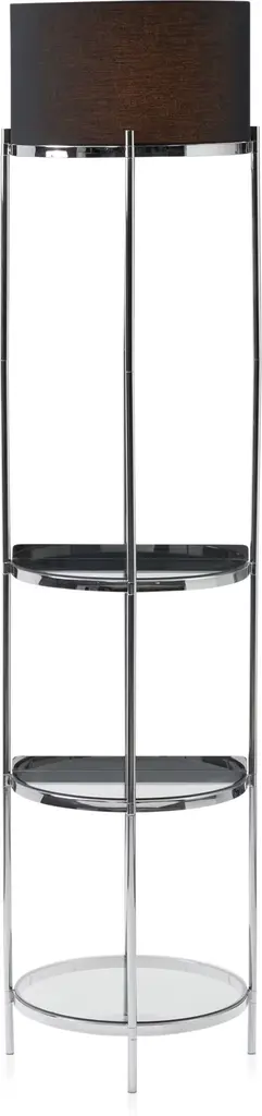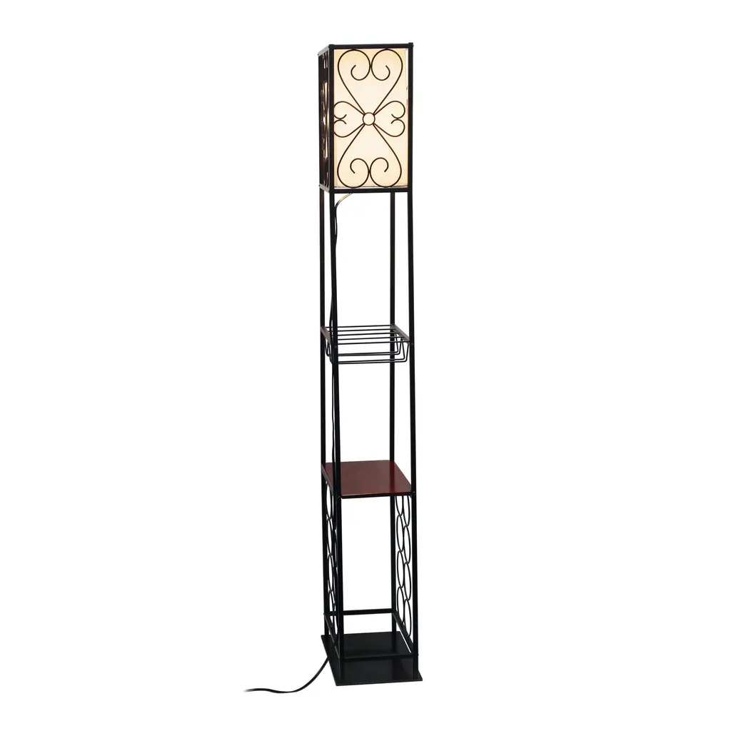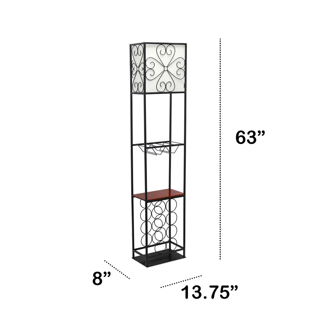 Add a touch of elegance and functionality to your living space with the wood accented floor lamp with wine rack and storage display. This unique floor lamp features a sleek finish and it is is accented with wooden details that complements any decor style. In addition to providing ample lighting, this floor lamp also features a built-in wine rack and storage display, perfect for showcasing your favorite bottles and decor items. Whether placed in the living room, dining area, or home bar, this floor lamp is sure to be a conversation starter and a stylish addition to your home.