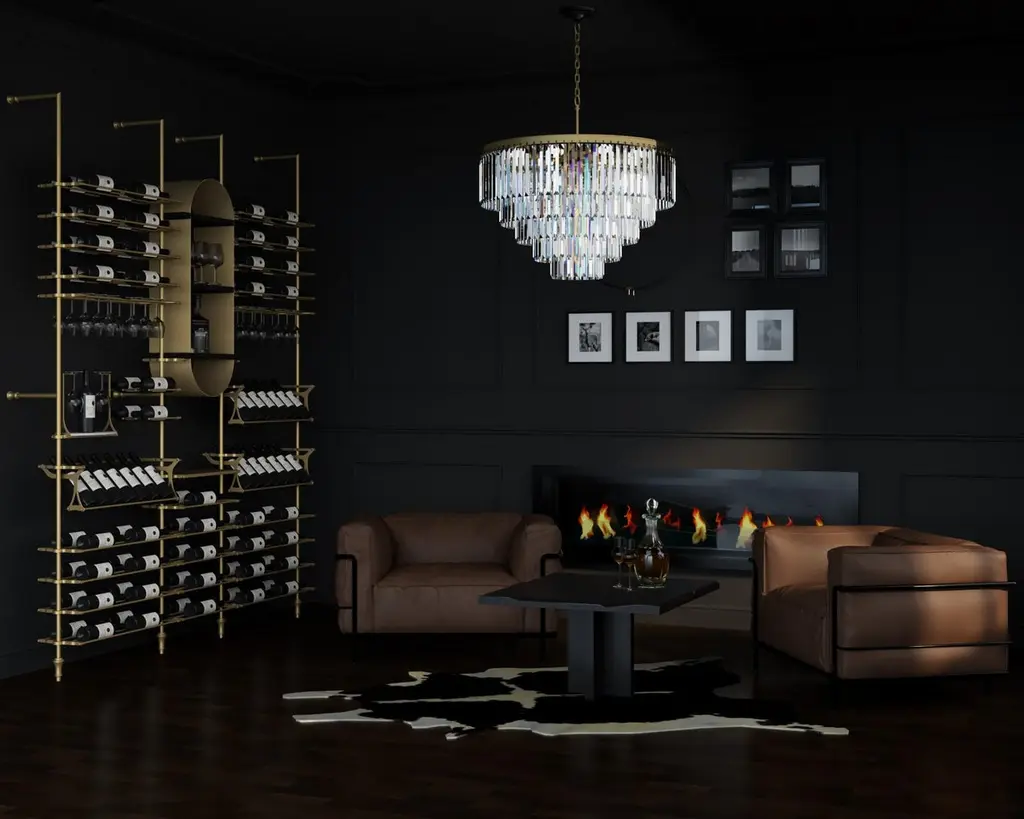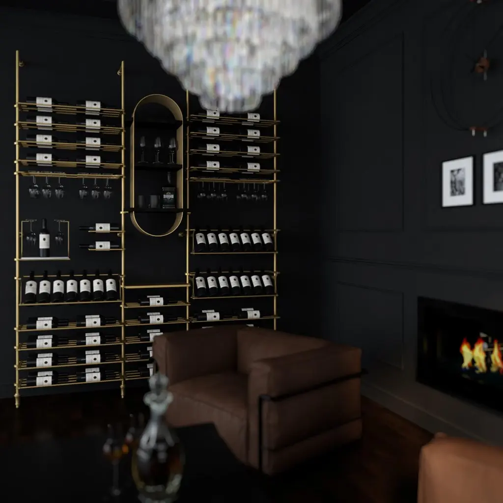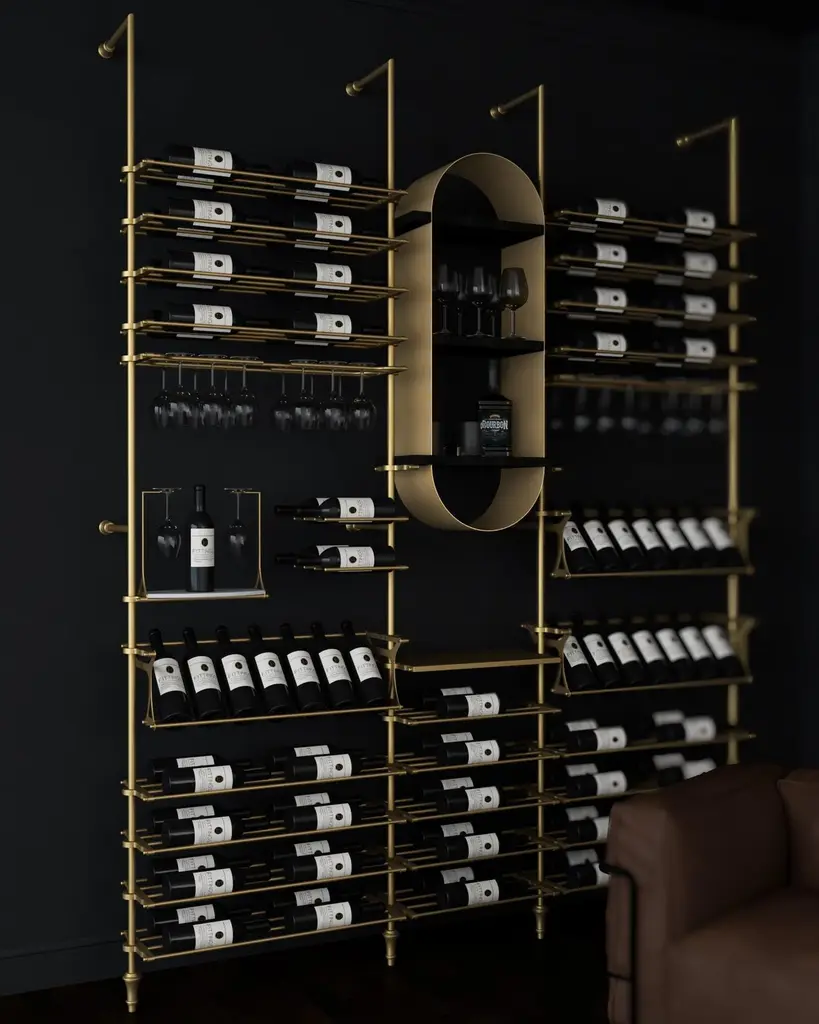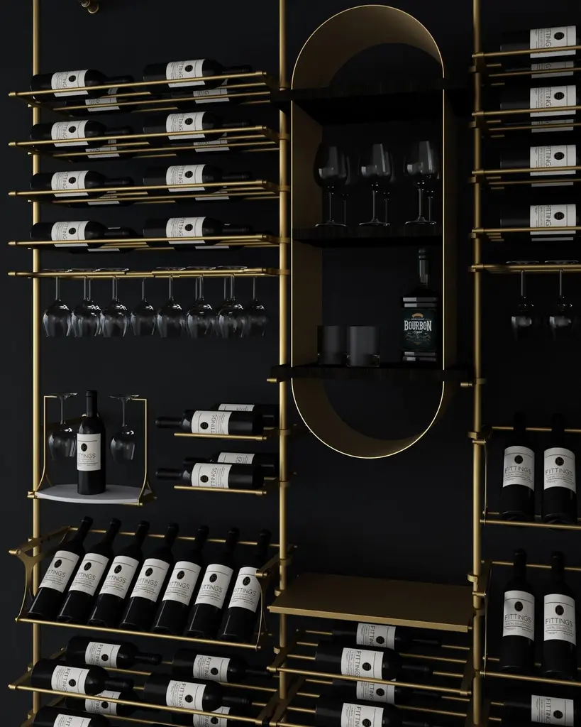 Where wine storage meets artistic expression—the Lombardy Wine Wall Display transforms your collection into a stunning centerpiece. Meticulously handcrafted to your specifications with a 103-bottle capacity, this elegant storage solution features:2-deep Label-Out Wine Racking for easy identificationAngled Wine Displays to showcase your finest selectionsLinear Stemware Holders for proper glass storageSignature 18" Capsule Shelf and Wine Stemware Duo ShelfEach made-to-order piece artfully combines bottle racking, display shelving, and ample storage capacity into one cohesive, handcrafted design.Specifications:Size: 76" W x 96" HBottle Capacity: 103 (based on 12" bottles with 3-1/4" diameter)Central wall stability supports includedBlocking required at all mounting locationsFittings Metal Collection’s artfully designed wine walls allow you to seamlessly integrate a stylish wine cellar right into your living space. Whether you want to build your own unique design or select from our pre-designed wine wall assemblies, Fittings offers elegant solutions to beautifully showcase your wine collection.