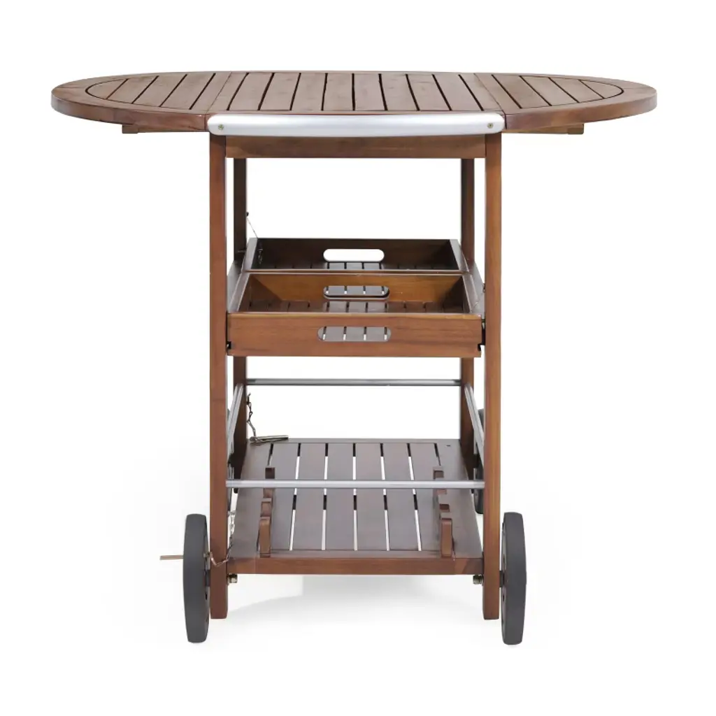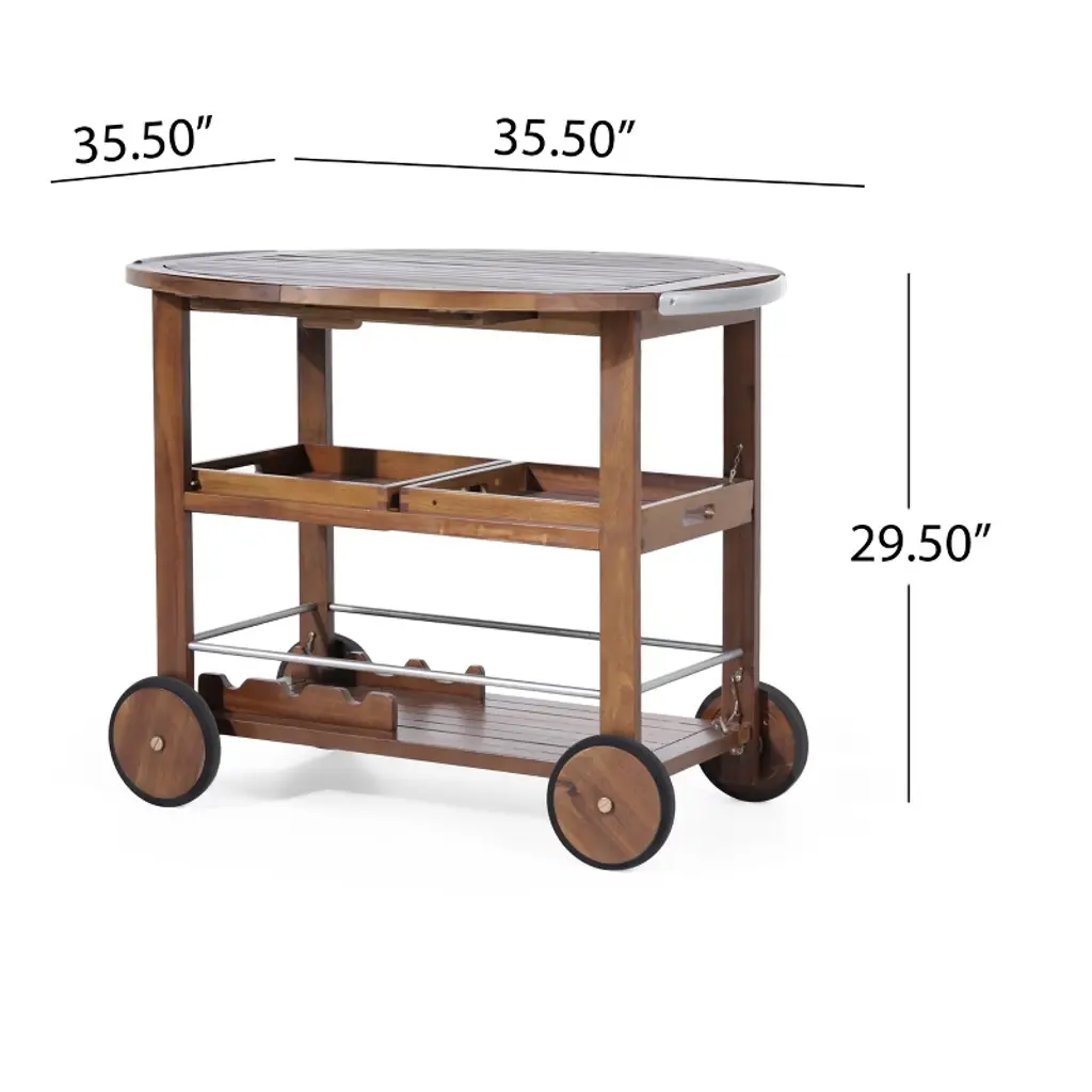 The Modern Industrial Bar Cart is the ultimate entertaining essential, designed to elevate your hosting experience with smart functionality and stylish versatility. Crafted from rich wood and sleek aluminum accents, this cart blends modern industrial charm with practical storage solutions. The adjustable drop-leaf top transforms from a compact rectangle to a spacious circle, while removable serving trays and built-in wine bottle holders keep everything organized for seamless entertaining. Locking wheels provide stability when stationary and easy mobility when needed, making it perfect for both indoor and outdoor use. Designed to withstand mild weather conditions, this bar cart is your go-to for al fresco dining, cocktail parties, or everyday storage—all while keeping your main table free for conversation.