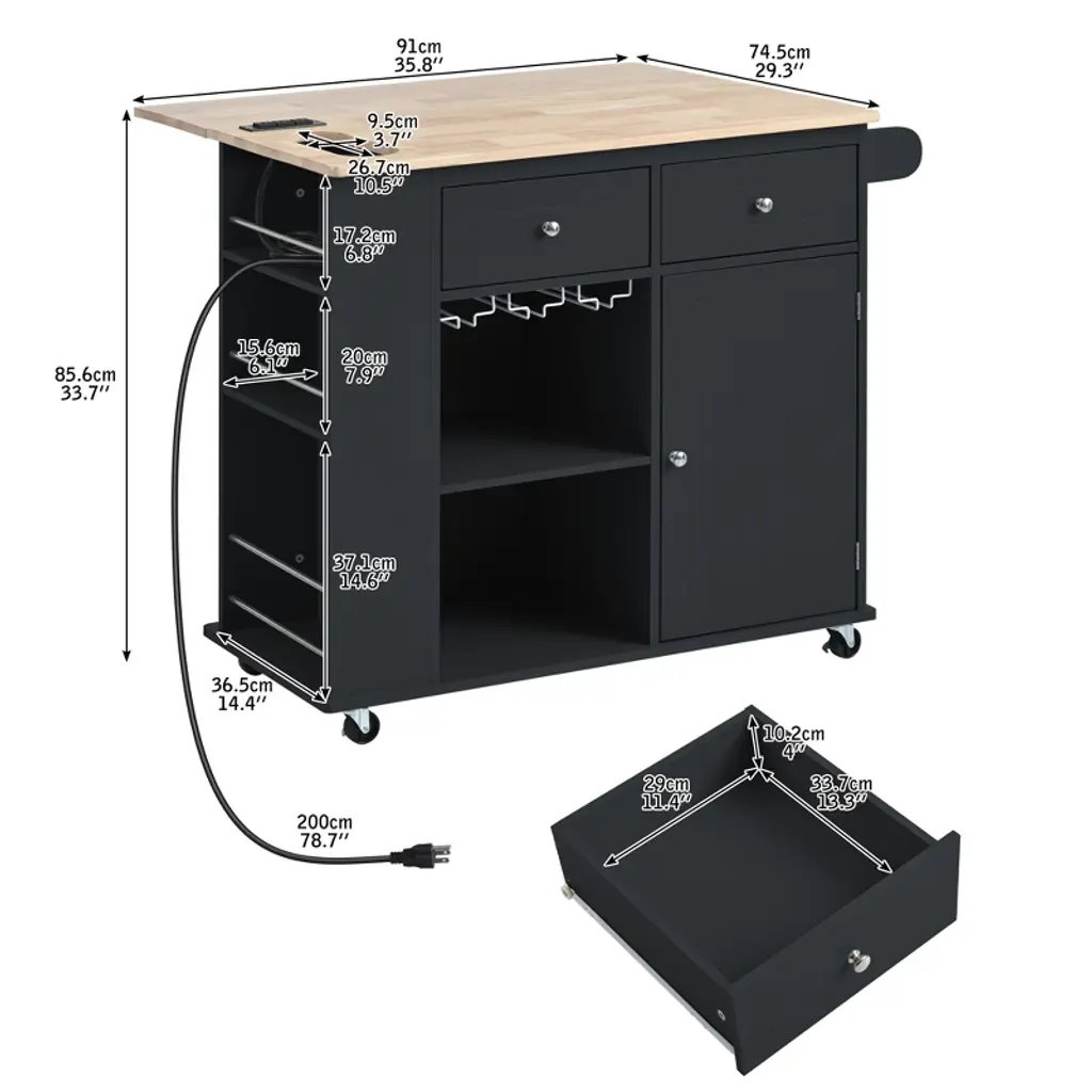 This versatile 40-inch kitchen island combines smart functionality with rustic charm, featuring a convenient drop-leaf design that expands your workspace when needed and folds away to save space. The solid wood tabletop offers durability with an easy-to-clean surface, while thoughtful additions like a built-in wine glass holder and side storage with guardrails keep essentials organized. A 2-meter power cord with desktop outlets provides convenient access to electricity for small appliances, and the flexible desktop hole accommodates taller items with ease.