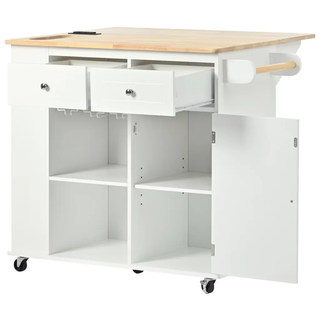 Maliang Kitchen Island With Power Outlet, Kitchen Storage Island With Drop Leaf, Open Storage And Wine Rack, 5 Wheels, White