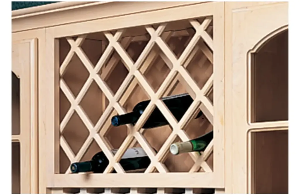 Omega National unfinished wood wine rack lattice. Glued and mechanically fastened at joints. Bottle openings are 4" square.