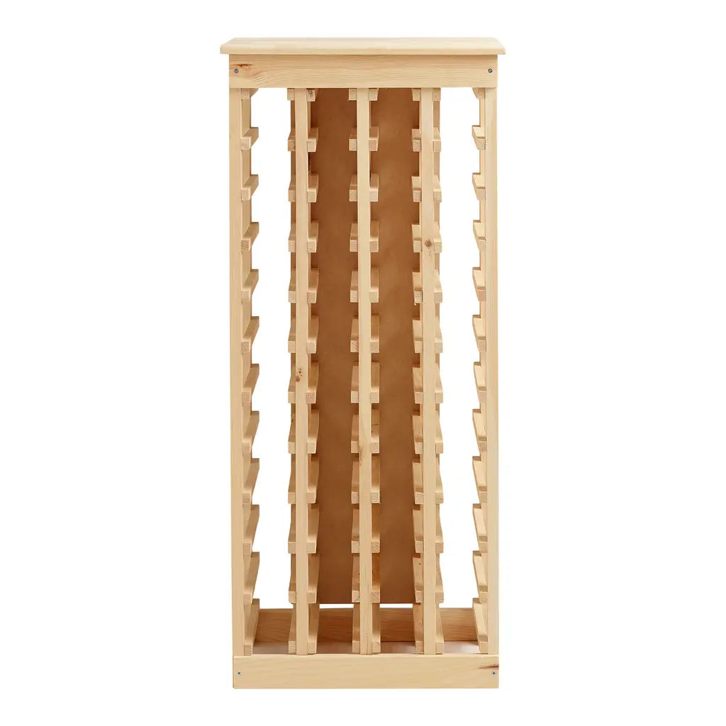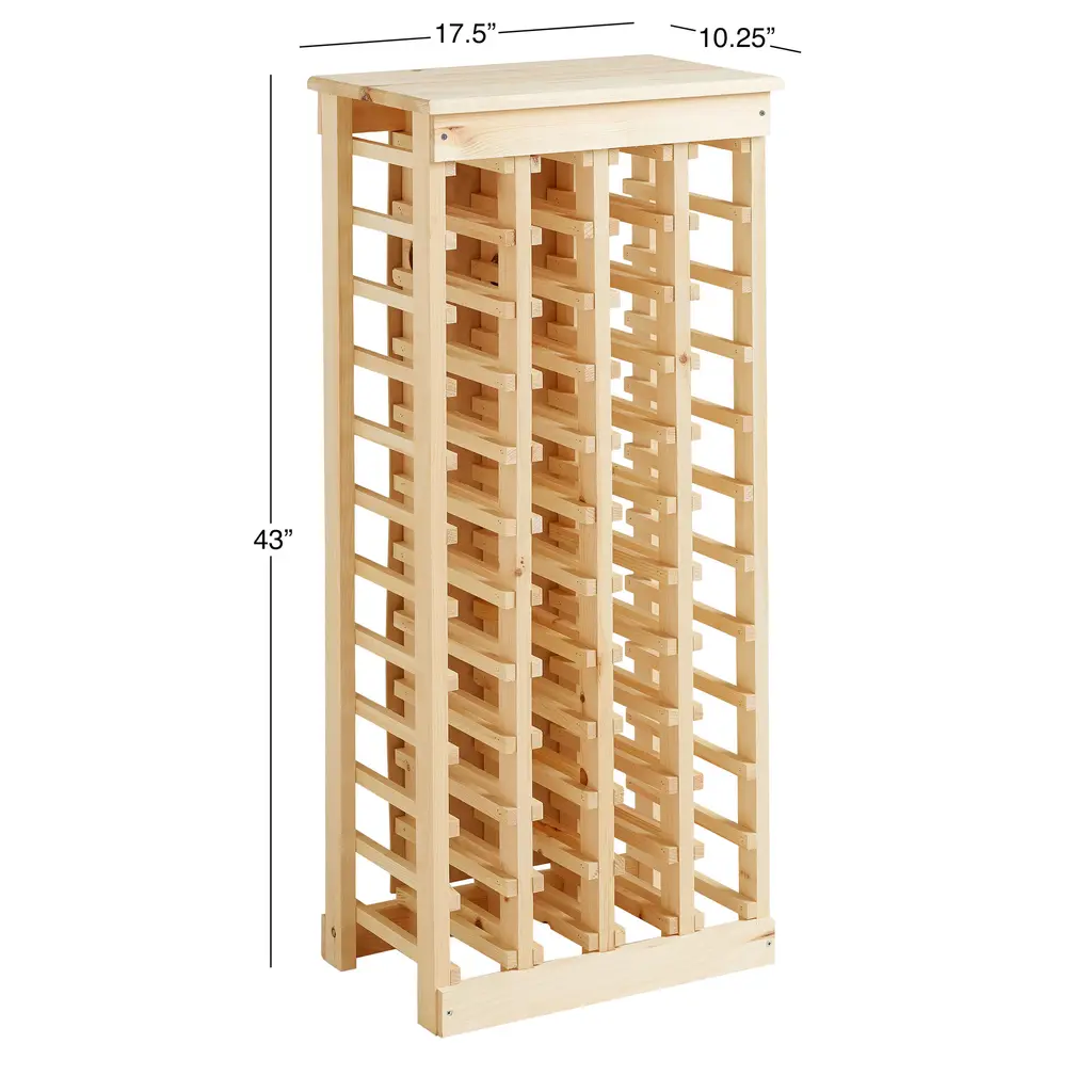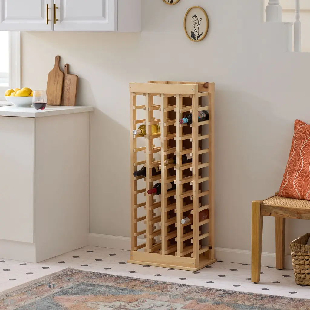 This tall, solid pinewood wine rack is a no-nonsense display piece and a perfect solution for wine storage on a larger scale. Safely organize and store up to 44 of your favorite bottles in this sturdy bar accessory without taking up a lot of floor space.