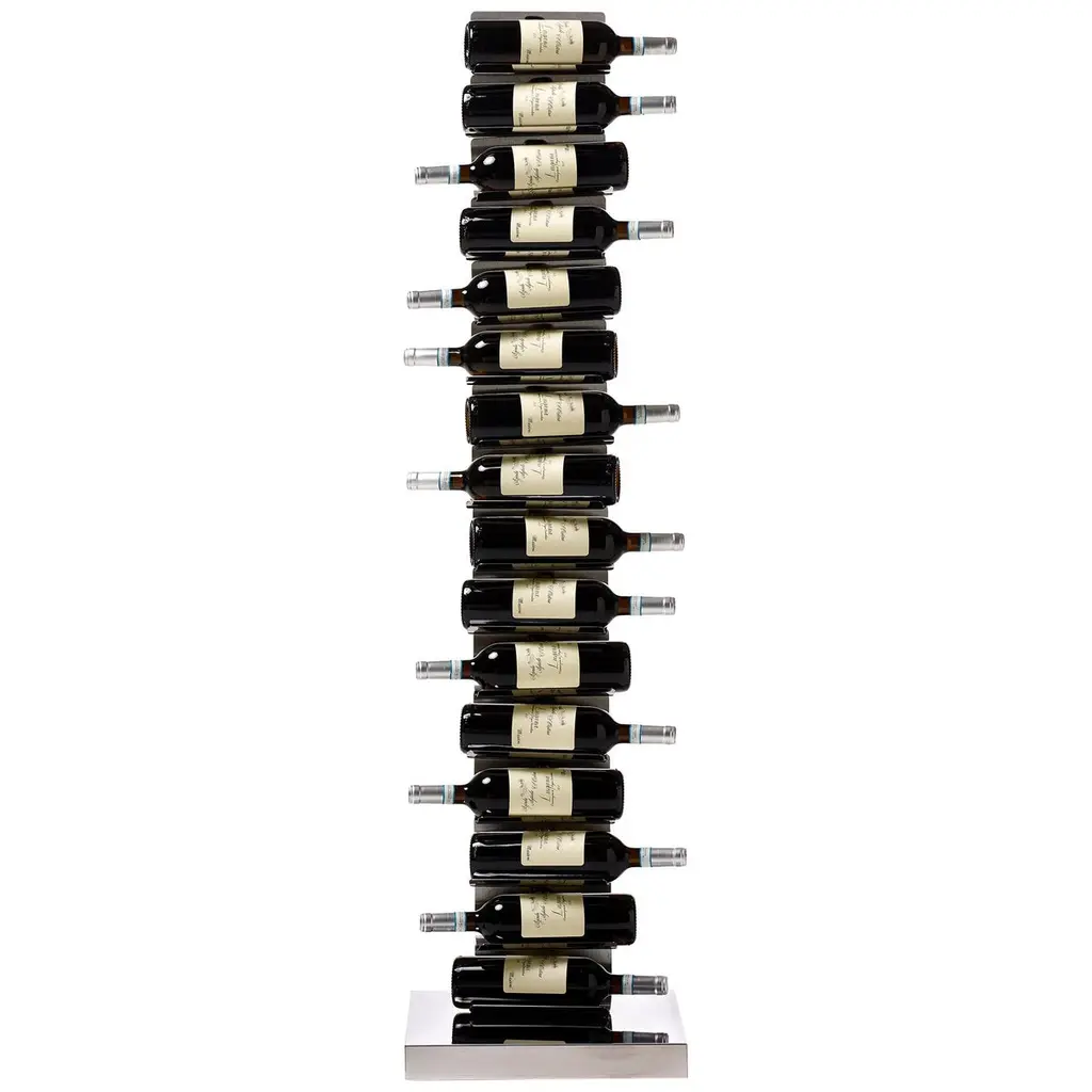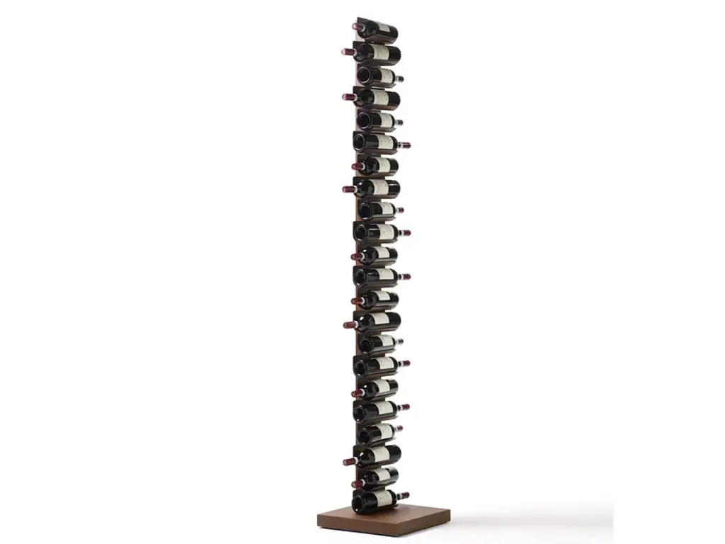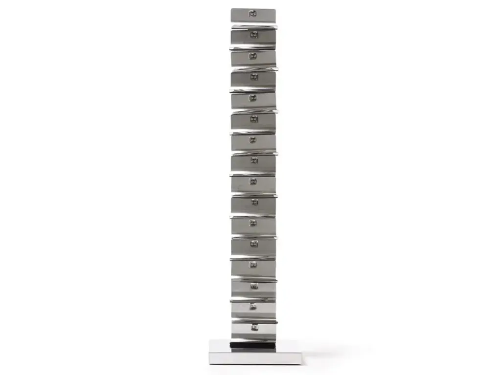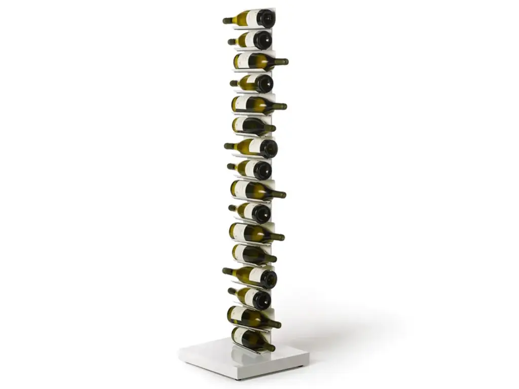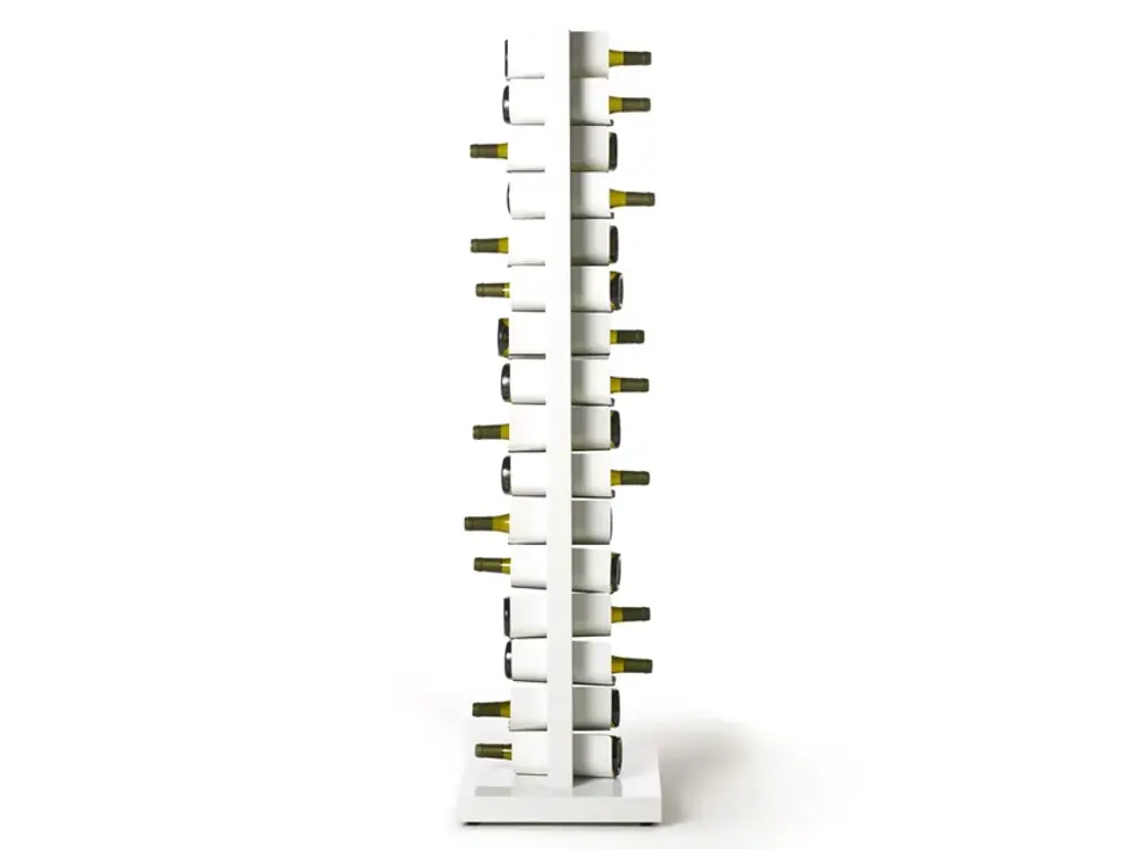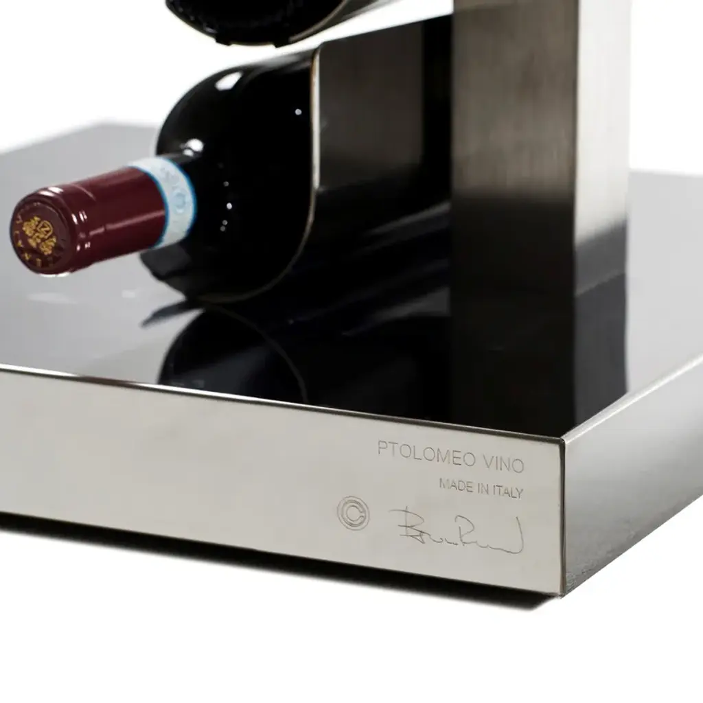 Ptolomeo Vino is a vertical free standing stainless steel bottle holder. The designer's signature is engraved on the base. Two sizes. To hold different types of wine bottles and to store and naturally age the wine. Technical features:Column and shelf finishes: matt - black lacquered, matt Corten effect. Glossy - white lacquered RAL 9003, stainless steel mirror with a satin finish for the inner shelving. Base finishes: matt - lacquered black, Corten effect. Glossy - lacquered white RAL 9003, stainless steel mirror. Accessories: all shelves are equipped with practical and washable slip-proof elastics. Notes: holds up to 16/22 bottles depending on size. Also available in a wall-mounted version
