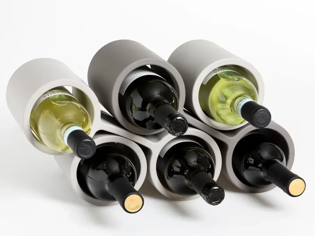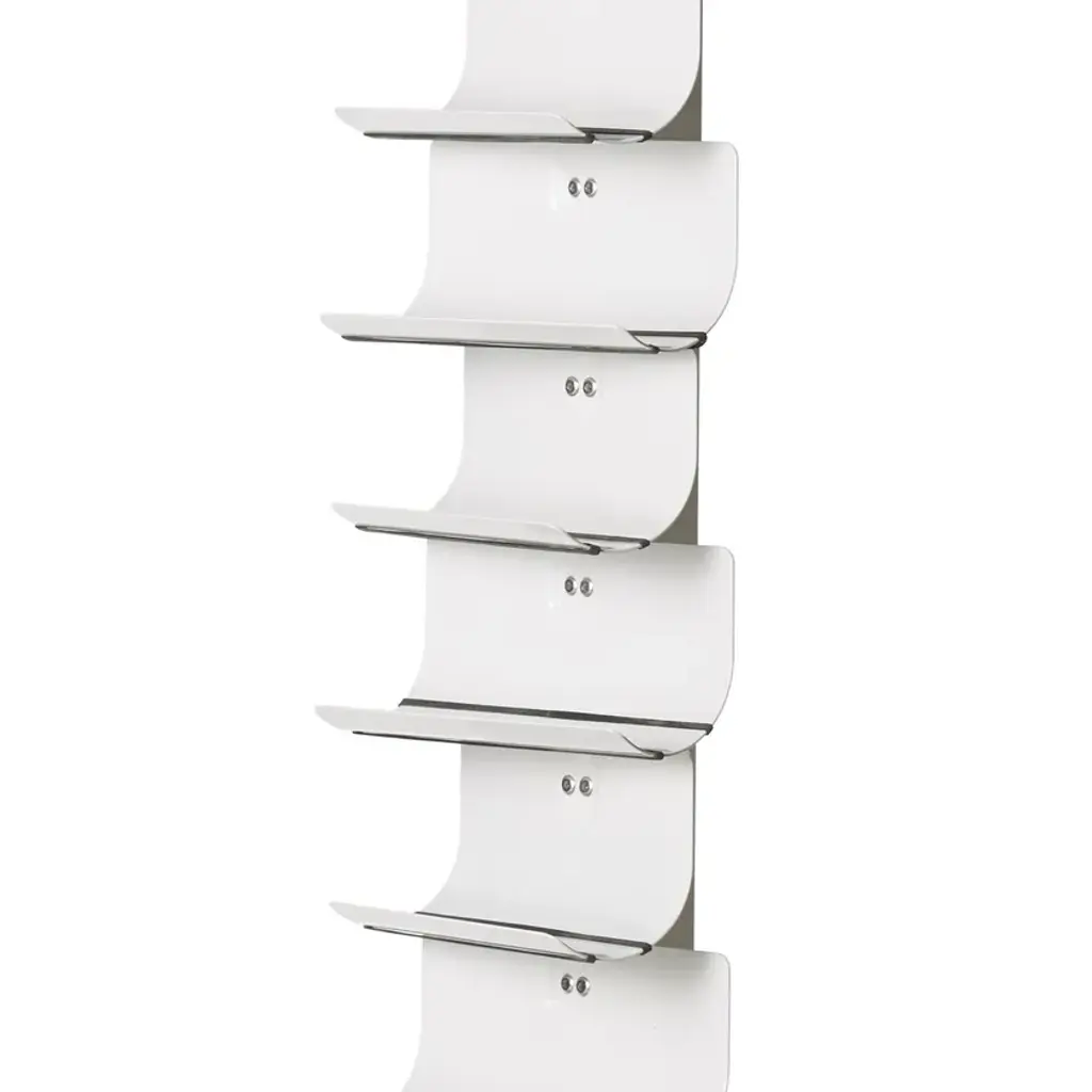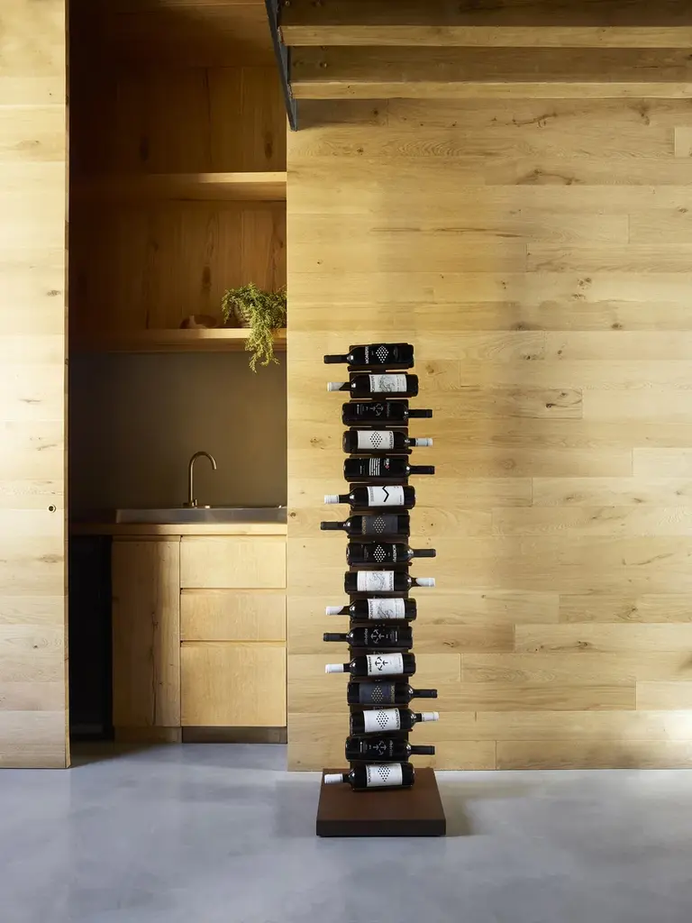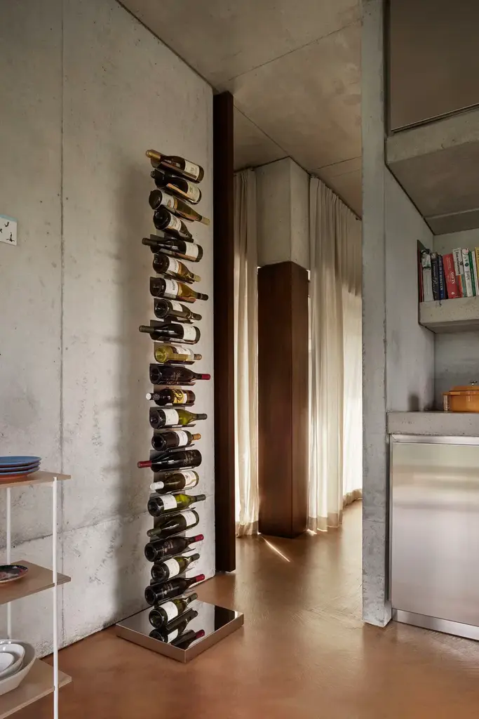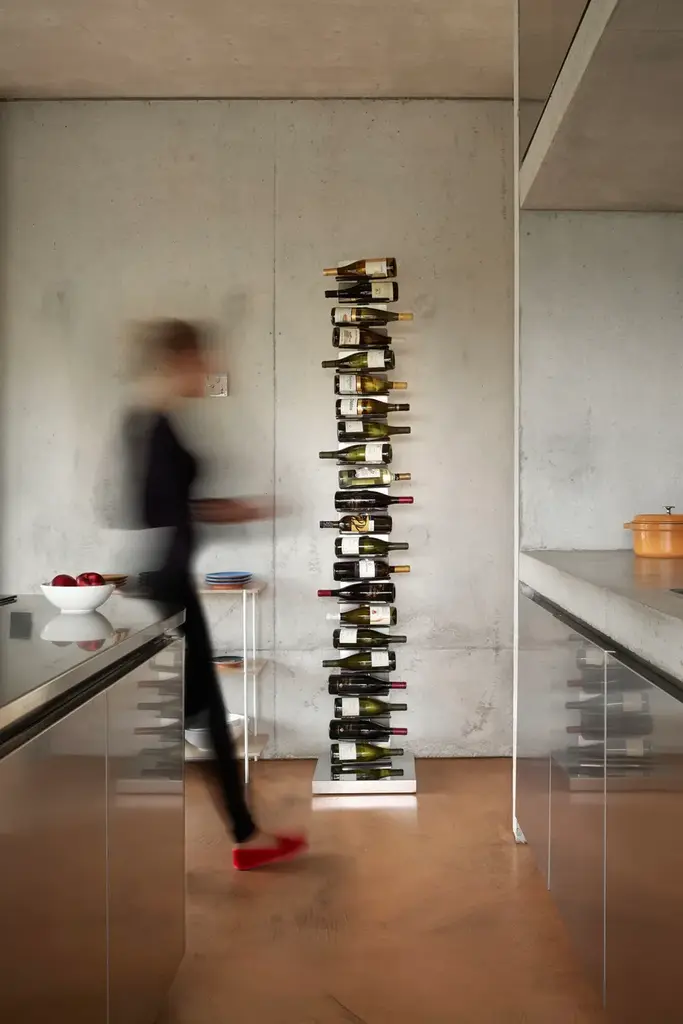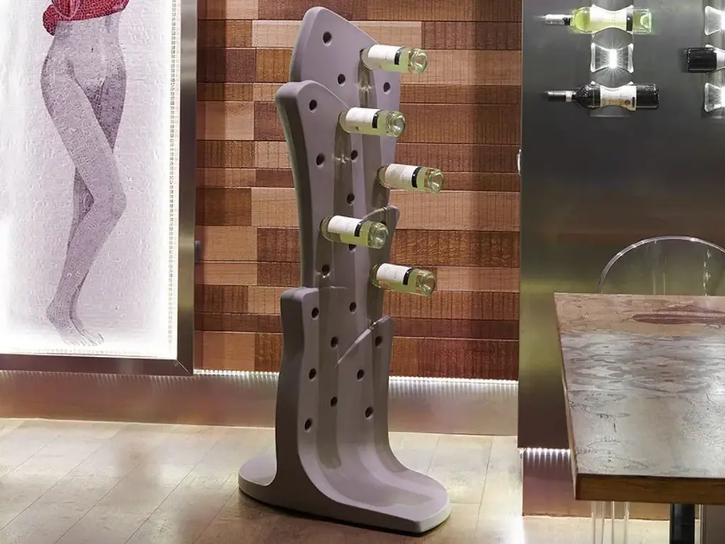 Ptolomeo Vino is a vertical free standing stainless steel bottle holder. The designer's signature is engraved on the base. Two sizes. To hold different types of wine bottles and to store and naturally age the wine. Technical features:Column and shelf finishes: matt - black lacquered, matt Corten effect. Glossy - white lacquered RAL 9003, stainless steel mirror with a satin finish for the inner shelving. Base finishes: matt - lacquered black, Corten effect. Glossy - lacquered white RAL 9003, stainless steel mirror. Accessories: all shelves are equipped with practical and washable slip-proof elastics. Notes: holds up to 16/22 bottles depending on size. Also available in a wall-mounted version