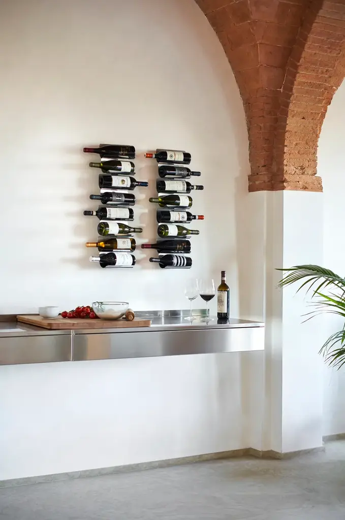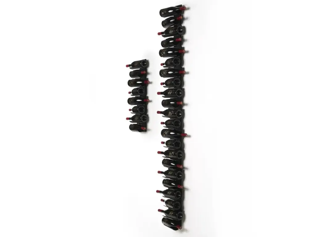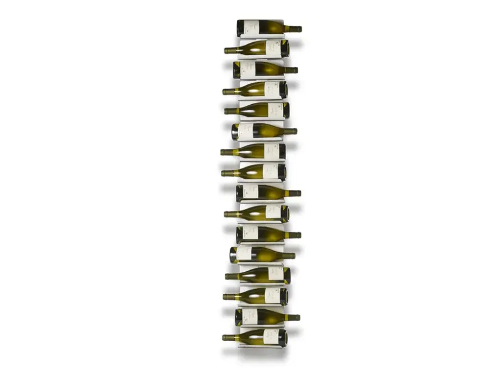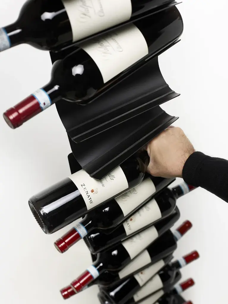 Ptolomeo Vino is the bottle holder version of Original Ptolomeo, the famous free-standing bookshelves designed by Bruno Rainaldi, winner of the Compasso d’Oro 2004 and soon became an icon of contemporary design.A glass of our favourite wine and that book that we are engrossed in. Very often our moments of greatest relax are imagined in the company of a good book and an excellent glass of wine. Launched at the 2018 Salone del Mobile, Ptolomeo Vino becomes the “summa” of this suggestive idea, representing the transformation of the famous Original Ptolomeo bookshelf into a scenographic bottle holder.In Ptolomeo Vino the container once again stands aside allowing the limelight to go to its content. The wine bottles are the main protagonists, appearing to float in the air, their labels becoming a strongly decorative feature.Conceived on the drafts left by Bruno Rainaldi, Ptolomeo Vino is a metal column connected to a system of ledges that can contain a great variety of different wine bottles. The supports have been designed to be as imperceptible as possible, to give the beholder the idea that the bottles are “suspended”.Slim, elegant and essential, it is the perfect solution for both domestic environments and the contract world, including hotels, restaurants, wineries, wine shops and wherever wine is more than just a passion. Also available in a free-standing version, Ptolomeo Vino Wall can be made in three different sizes and four different finishes, from pure white to shiny stainless steel, from the traditional black to an antique Corten effect.