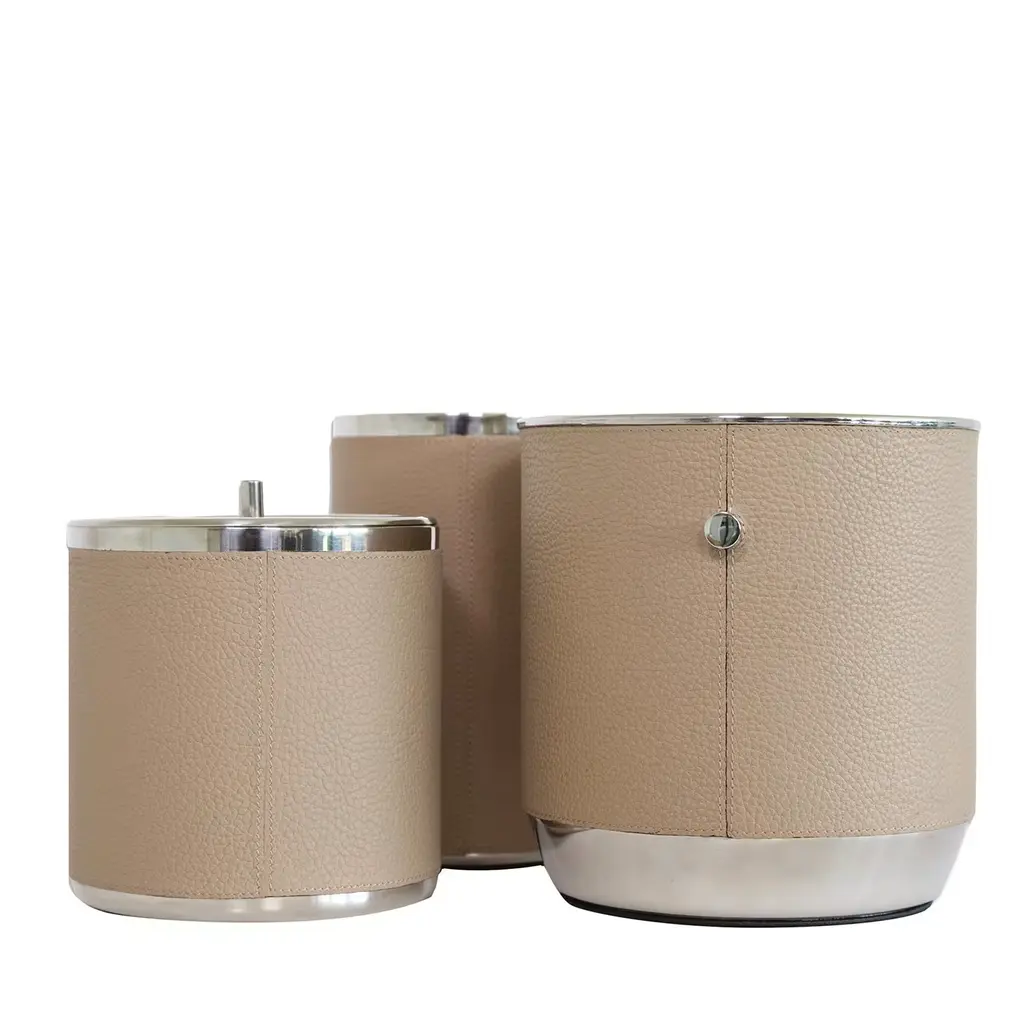 Thermal bottle holder has a stainless steel body wrapped in soft and water resistant calf leather. Sized to hold a single bottle wine cooler stands elegantly on a formal or casual table to keep the wine chilled to optimum temperature.