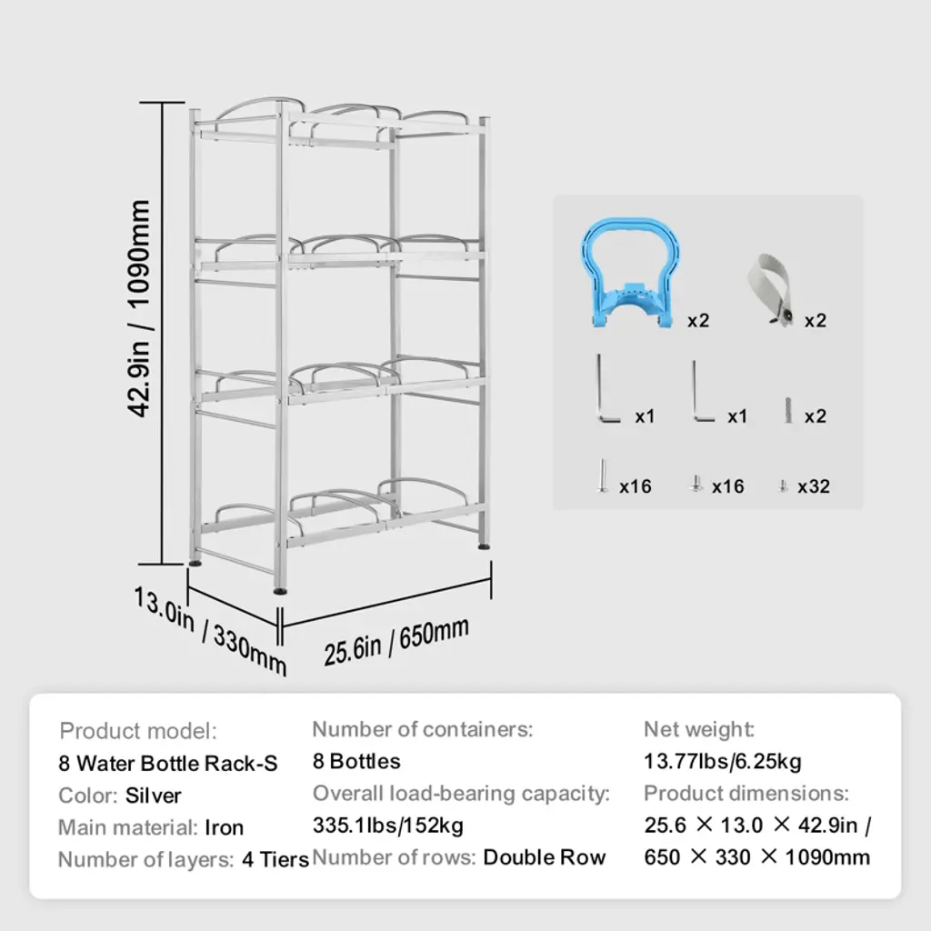 Feature: Adjustable Slots: This water jug holder is 25.6 x 13 x 42.9 in and holds up to 8 bottles, supporting up to 335.1 lbs. It fits both 3-gallon and 5-gallon bottles and keeps them organized in a compact space. Its industrial design matches various interiors, making it perfect for any room. Heavy-Duty Cast Iron: Made from thick cast iron with a powder-coated finish, this water bottle rack is stylish and highly durable. It resists corrosion, rust, and water damage, ensuring long-lasting use. Easy Installation: Our water jug rack features laser-cut holes for precise and easy assembly. The rack can be assembled with the desired number of tiers and comes with a manual for quick setup. Thoughtful Design: The water gallon holder includes high guardrails to prevent taller buckets from falling, shelf grooves to keep bottles secure, and adjustable feet to protect floors and stabilize the rack on uneven surfaces. Handles make bottles placement easy. Versatile Use: The water jug stand is ideal for living rooms, storage rooms, kitchens, garages, food pantries, closets, laundry rooms, gyms, and offices. This rack helps you organize and maximize space efficiently. Package Content 1 x Water Jug Holder