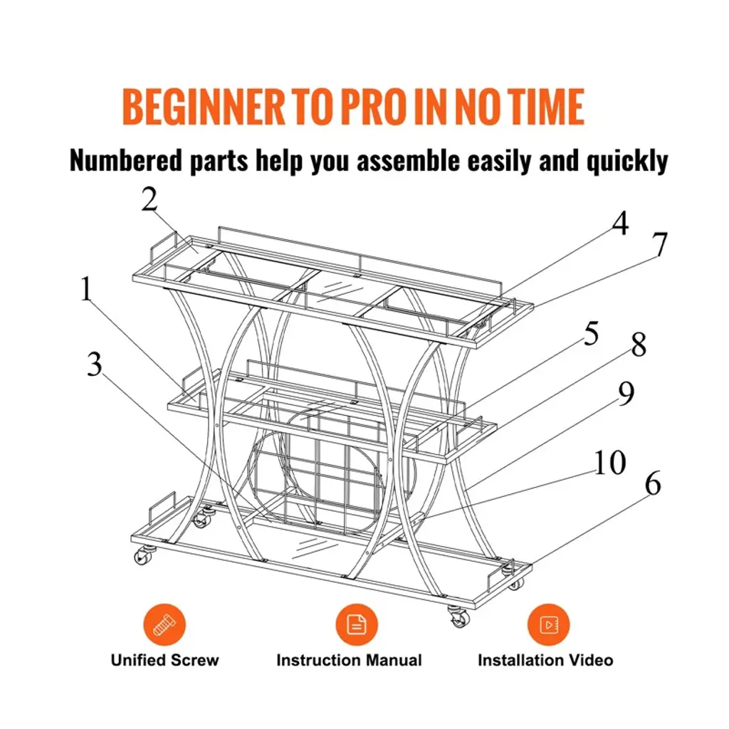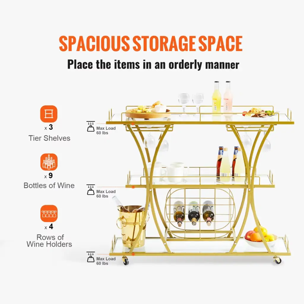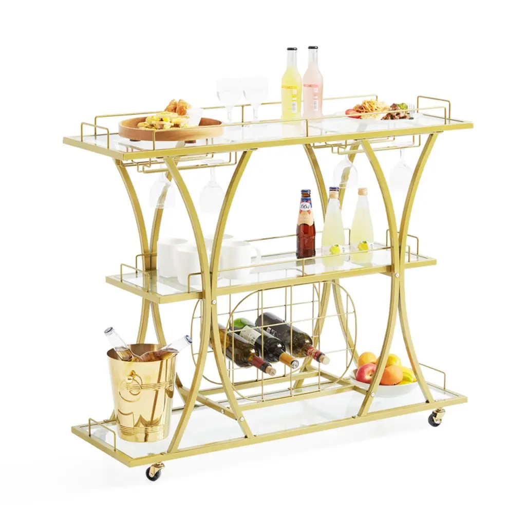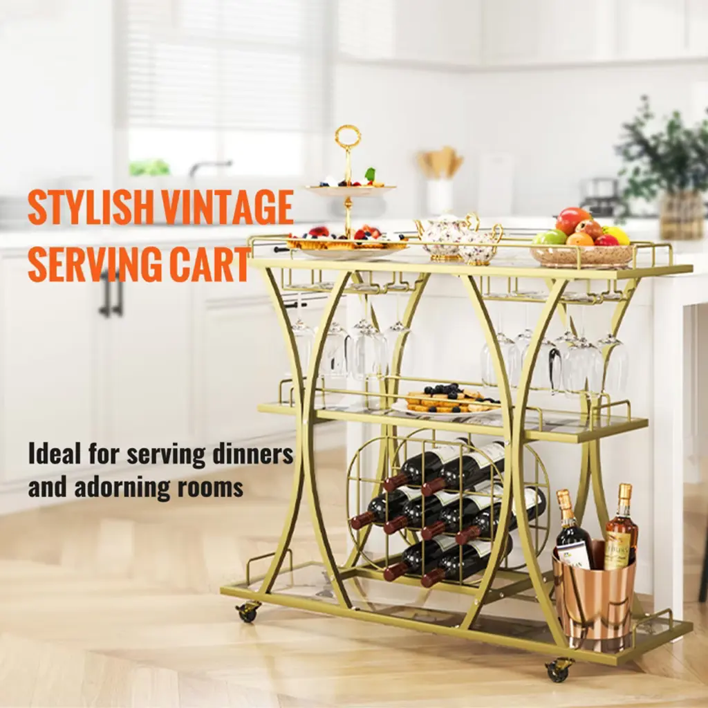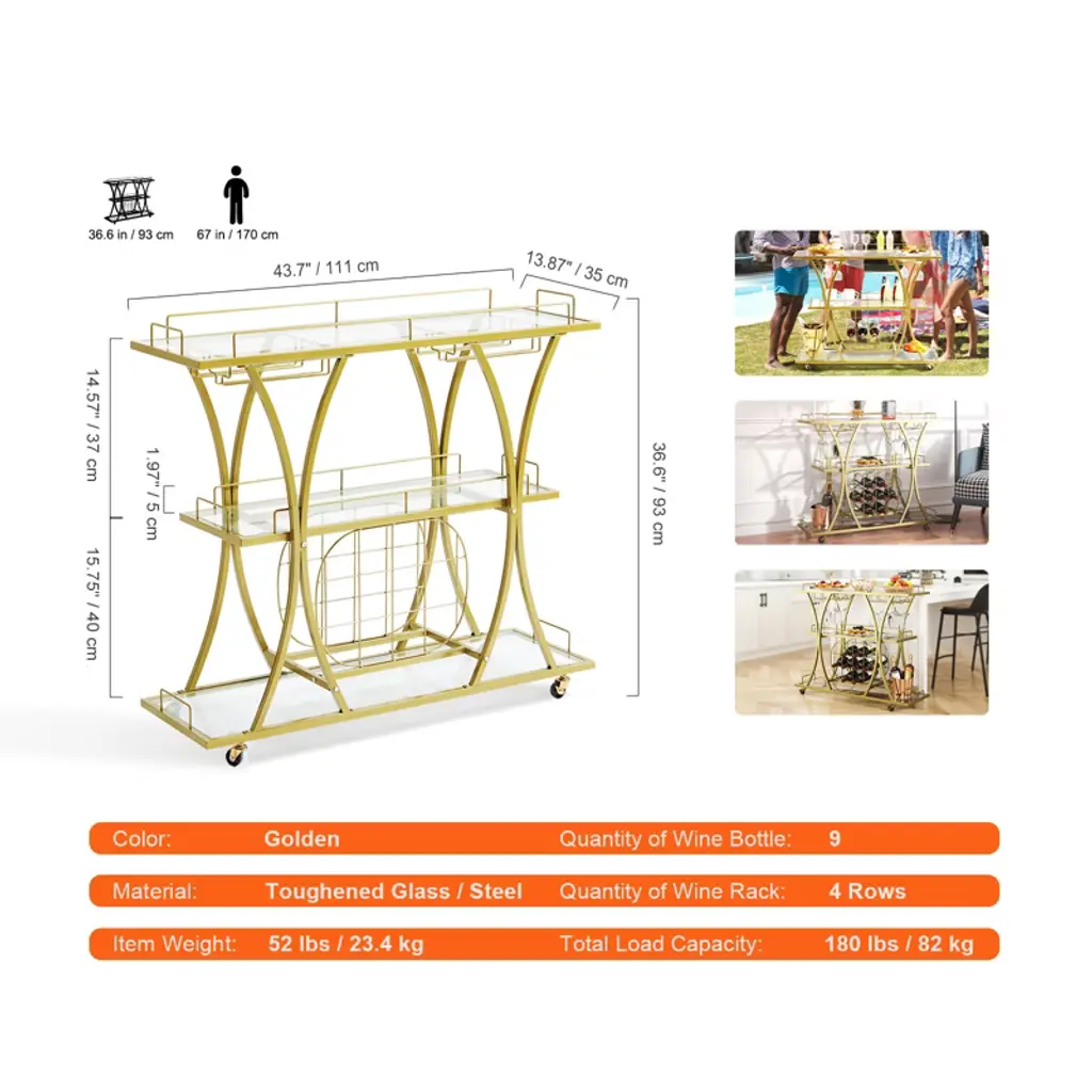 Feature: 3-Tier Vintage Cart: Our glass bar cart is the perfect combination of a wine holder, tabletop, and glass holder. It can efficiently serve food and save energy. Ideal for kitchens, restaurants, hallways, bars, or outdoor barbecues. Get ready to do more! Take Control of your Space: Measures 43.7x13.8x36.4 inches. This gold wine cart on wheels can fit in various places and hold up to 180 lbs. That is a lot of weight! It has an open storage compartment, a wine rack, and hanging glass storage. Get ready to holds 9 wine bottles and 4 rows of wine glasses for any special occasion. Cheers to you! Movable & Lockable: Stop and move seamlessly! Features four 360° swivel casters and two casters with brakes. The gold bar cart can be freely moved throughout your kitchen, dining room, or garden. It moves smoothly without noise. Roll it where your party needs it, or park it next to your sofa to serve coffee after the party. Master-Level Craftsmanship: Get ready for quality materials that are built to stand out above the rest! Made of toughened glass and a golden steel frame, this wine cart has excellent sturdiness and a long service time. You can arrange the storage space freely with the removable wine/glasses rack. Carefree Assembly: The liquor cart provides all necessary accessories and detailed instructions. It comes with unified screws and clear and brief instructions. All parts are provided with labeled numbers, and each assembly step is listed clearly. You can easily understand the assembly process, wasting little time and energy. Start preparing your favorite wines and dishes! Package Content 1 x Bar Serving Cart 1 x User Manual