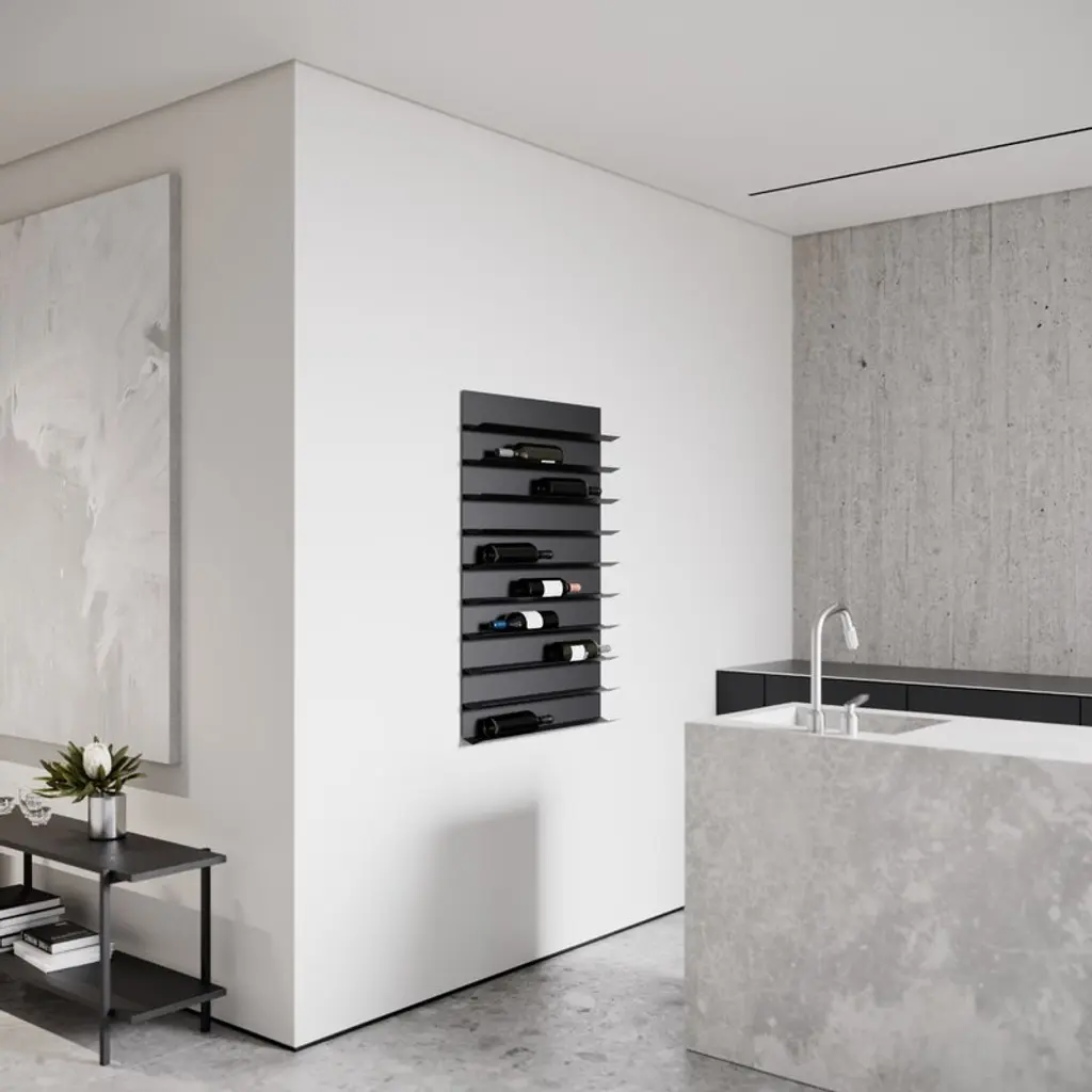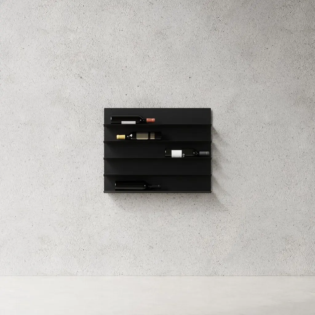 Nichba's black wine rack is a modern storage solution for your favorite wine bottles and sparkling wines. The bottle rack is so minimalist and airy that it looks like it's only floating on the wall, almost defying gravity. Designed by Nichlas Bjørn Andersen, the wine rack is made of steel and fits perfectly in the wine cellar, kitchen or dining room. It's also a great gift idea for other wine enthusiasts! The wine rack has five shelves and space for ten wine bottles.