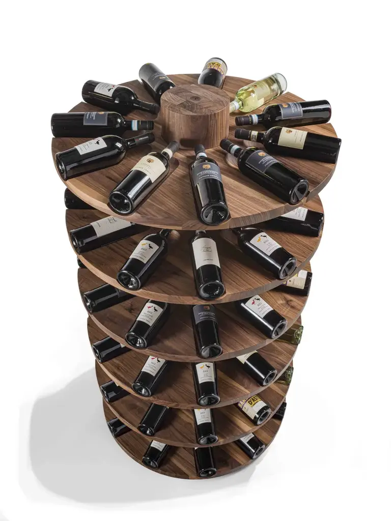 Wineround: Product completely made of solid wood available in two versions:1) all shelves with bottles in lying position (maximum capacity 66 bottles)2) all shelves with bottles in lying position except the last shelf at the bottom with standing bottles (maximum capacity 80 bottles)Possibility to add glass holders AVAILABLE FINISHES:A1: walnut without knots, walnut with knotsA2: oak without knots, oak with knots, cherry
