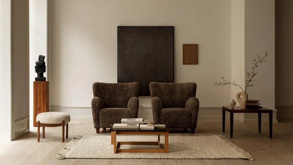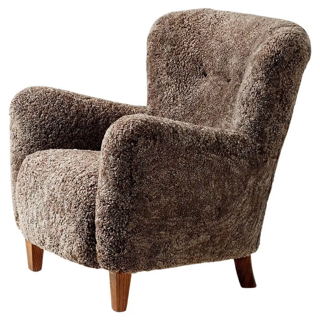 Dagmar Design - Karu lounge chairThe Karu chair is a contemporary update of a classic design first produced in Finland by the Haimi Oy company in the early 1950s. The inviting curved arms and subtle winged back are the epitome of the post-war Nordic aesthetic. Karu offers perfect proportions for a bedroom or living room chair. The frame is made from solid beechwood with a fully sprung seat. This chair is available to be upholstered in a range of luxurious fabrics and shearlings. Example shown is upholstered in Sahara brown sheepskin with oiled oak legs. Each chairs measures:Height of back 85 cmWidth at arms 84 cmTotal depth 90 cmSeat height 43cm.