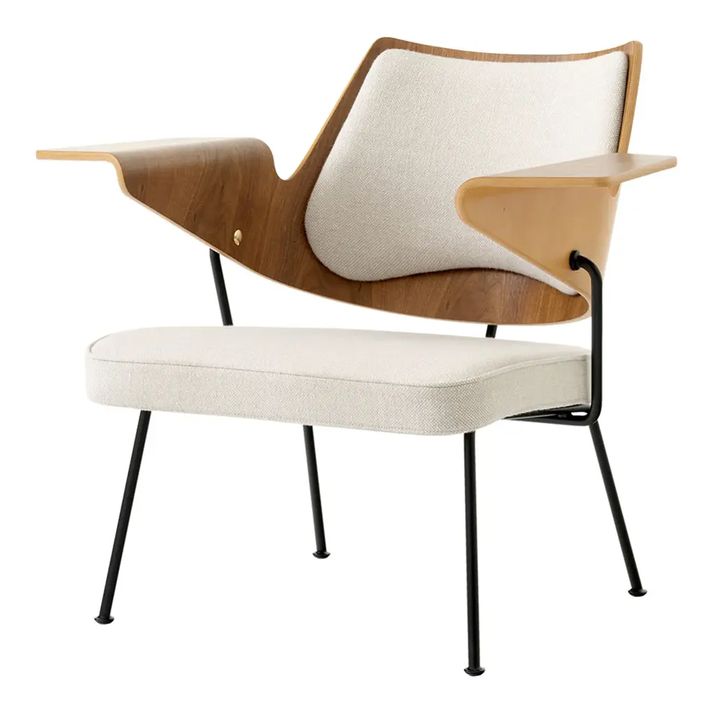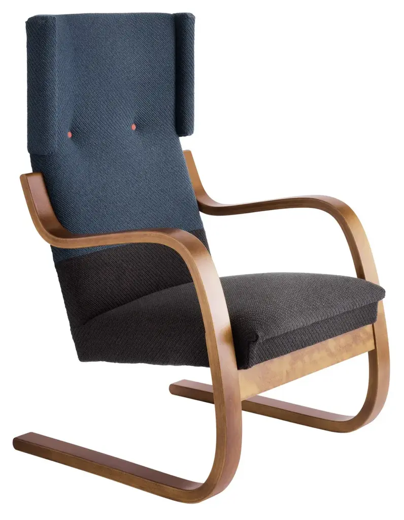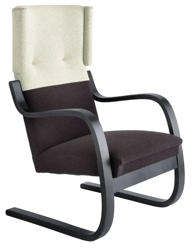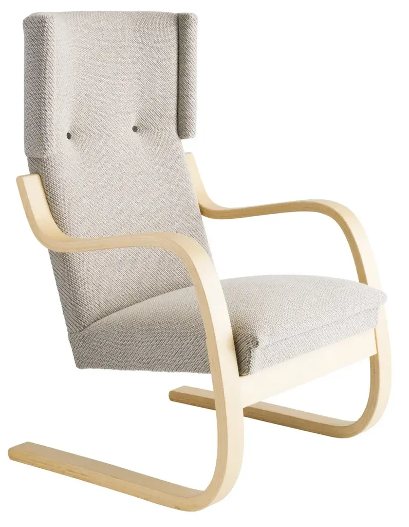 The high-back cantilever Armchair 401 offers maximum comfort. The frame contains a sprung seat, while the back is slightly tilted to provide support for the head and neck. The minimalist wings adjoining the headrest contribute to the distinctive design. Since wood changes over time, the armrests are formed from a single piece that is then split in half, ensuring that as the chair ages, it remains perfectly balanced.Both armrests are cut from the same piece of form-bent birch lamella, ensuring an even warping over timeFrame: Form-bent solid birch lamellaSeat and back:Solid birch, birch plywoodFabric upholstery, steel springs, PU foam and polyester paddingLeather upholstery, steel springs, PU foam and polyester padding