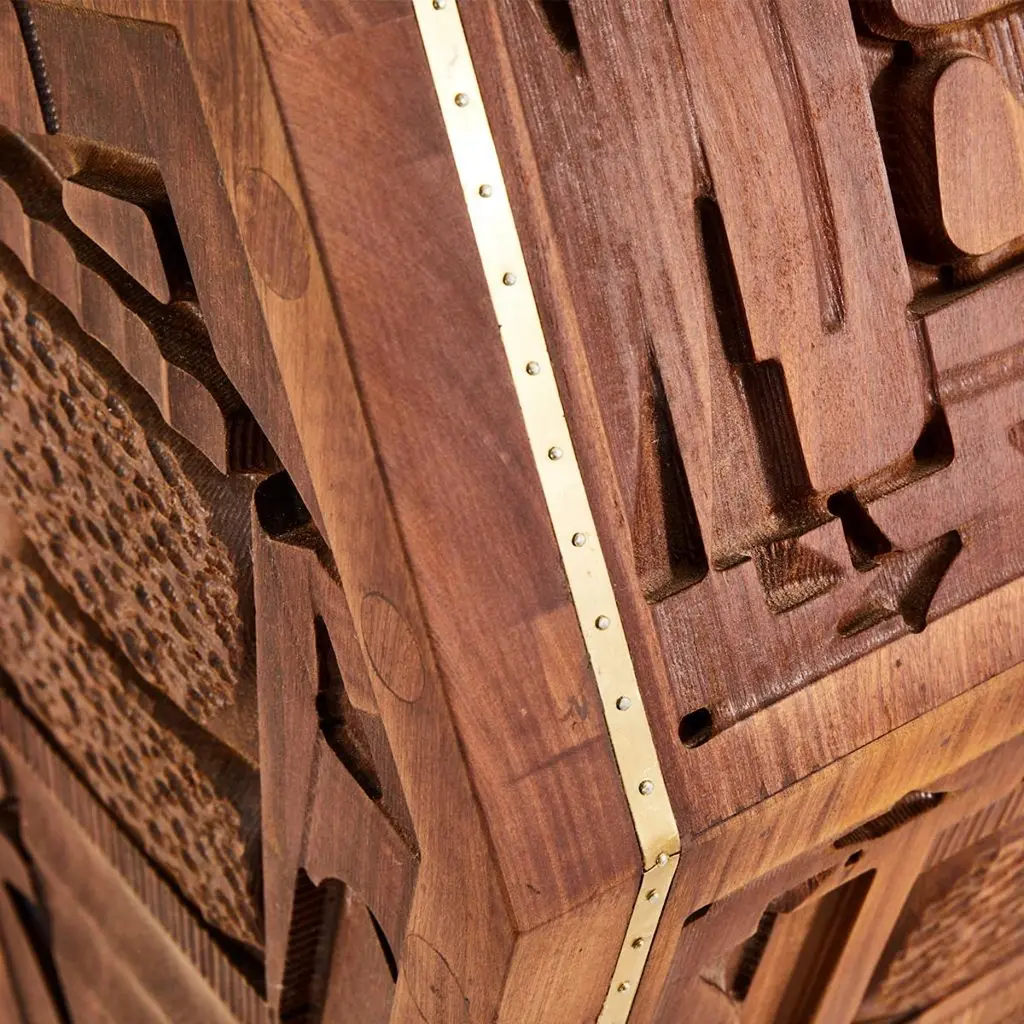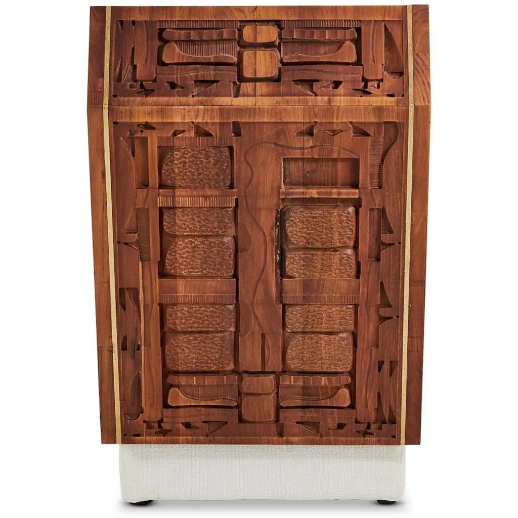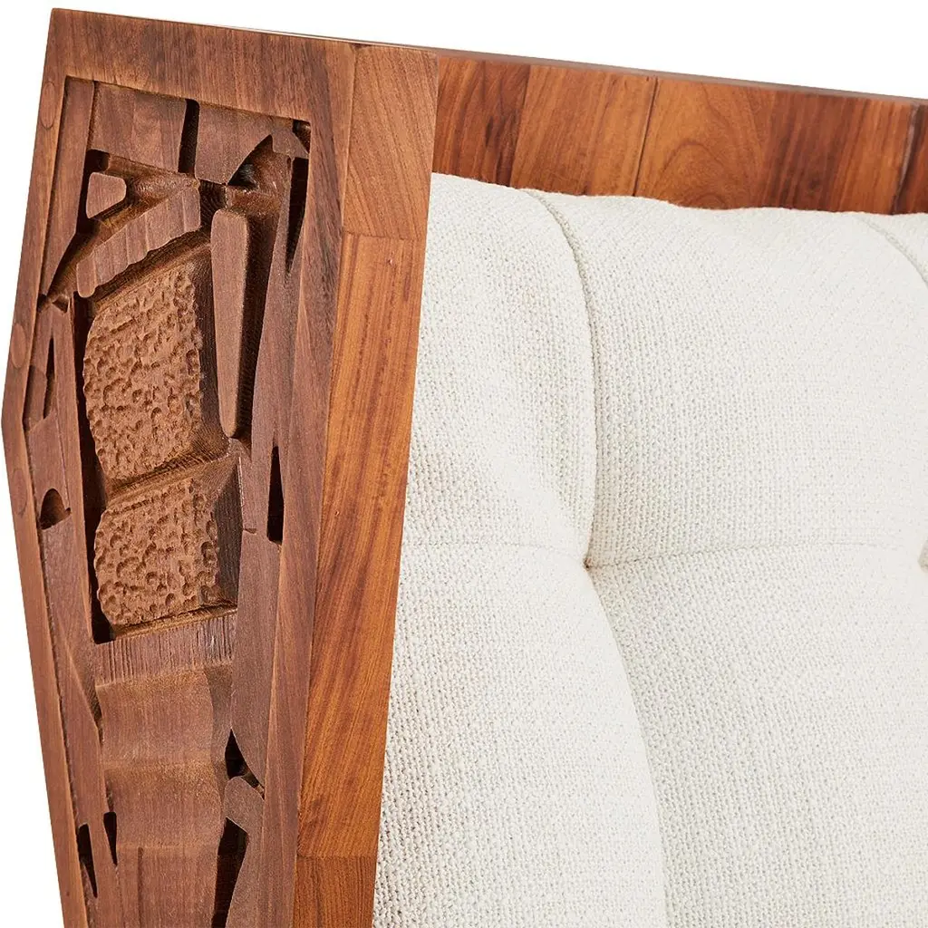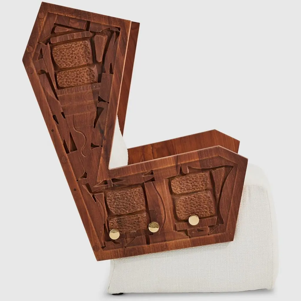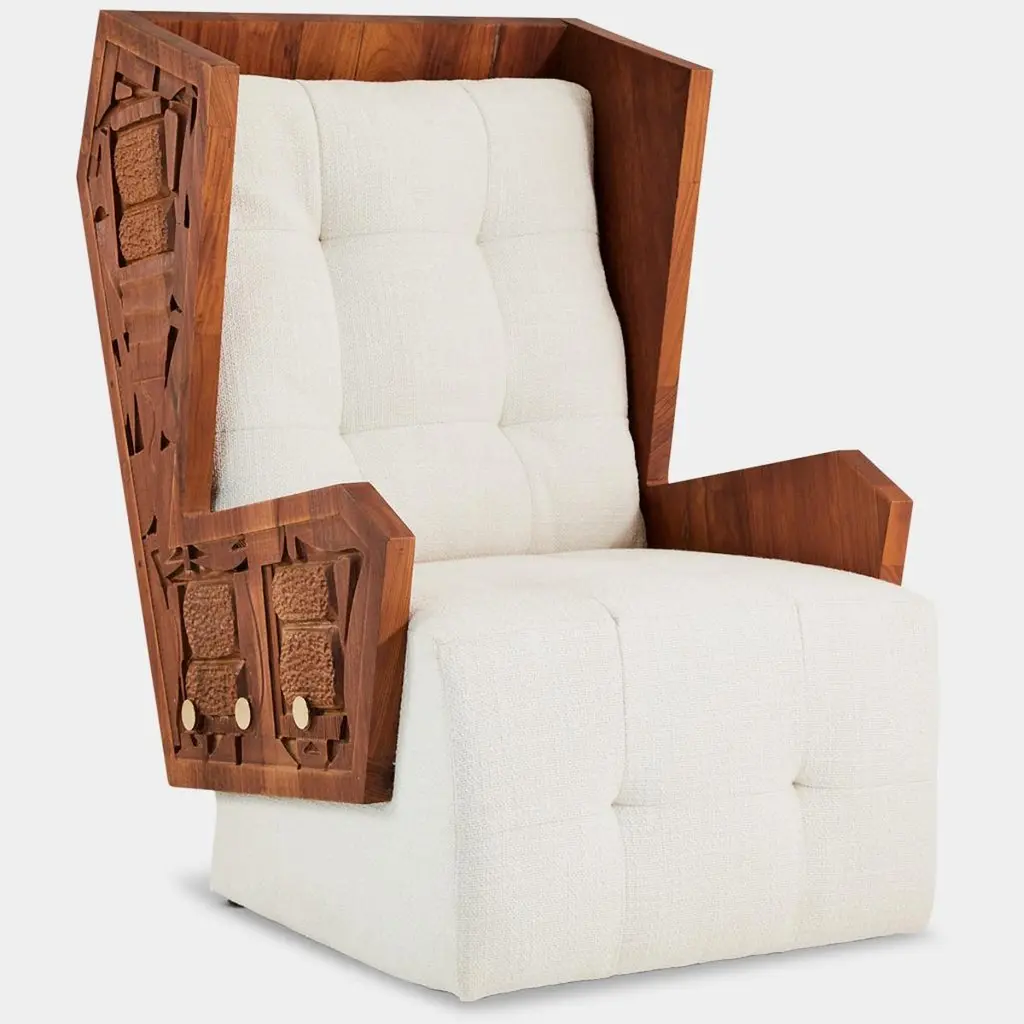 This bespoke, luxurious, wingback lounge chair is part of the Oromo collection designed by Egg Designs and manufactured in South Africa. The Oromo collection is inspired by 70's surface design, the backrest of this chair has a tactile, sculpted surface that is meticulously, mechanically carved, the entire process taking over 50 hours. This nod to 70's furniture and surface design fused with sensual curves and a minimal aesthetic results in a highly individual unique design.The Oromo wingback is upholstered in a cream boucle, this upholstery together with the carved walnut timber backrest gives the chair a distinct mid century modern vibe which will complement most interior design styles.The walnut timber backrest is connected to the chair by way of four polished, solid brass buttons. The modern sharp wingback shape creates a cocooning almost space age aesthetic.