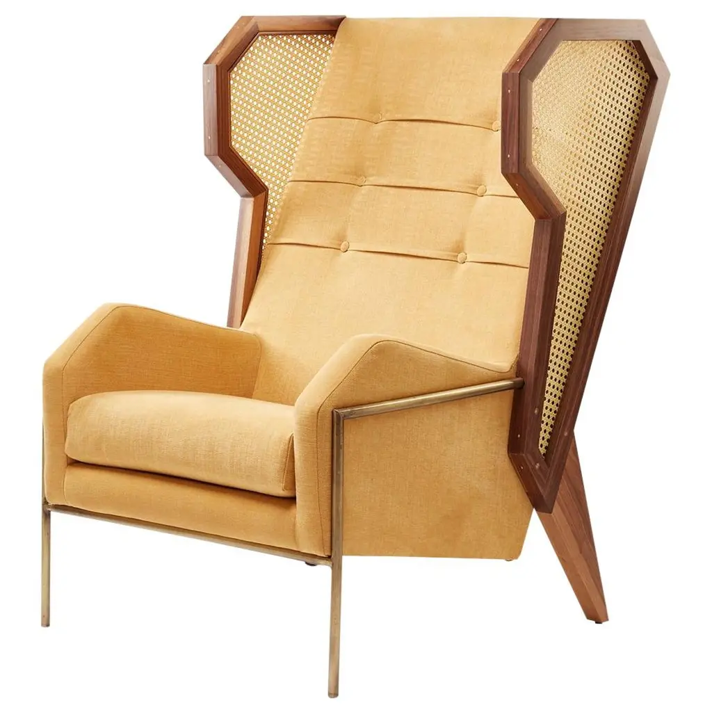 70's Inspired Modern Boucle, Brass & Carved Walnut Oromo Wingback By Egg Designs