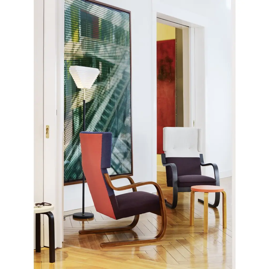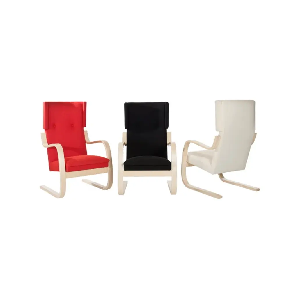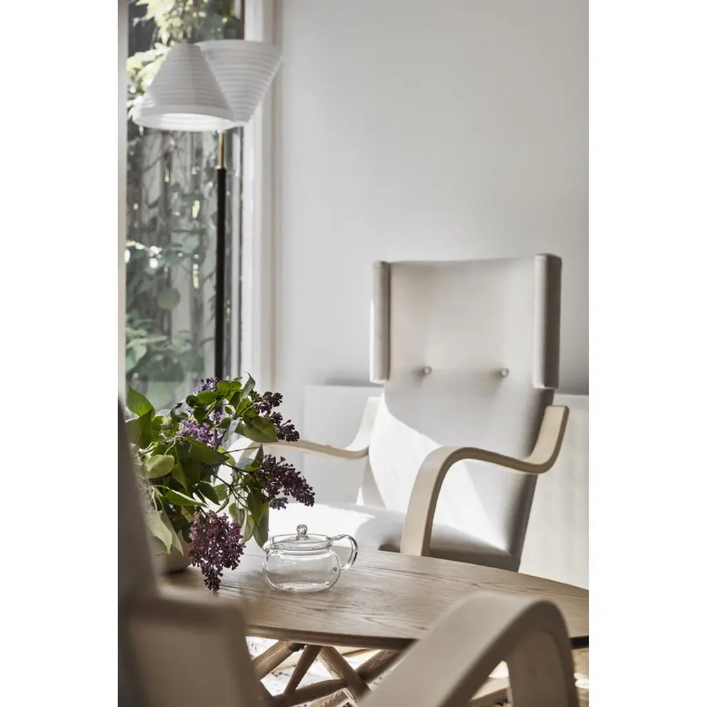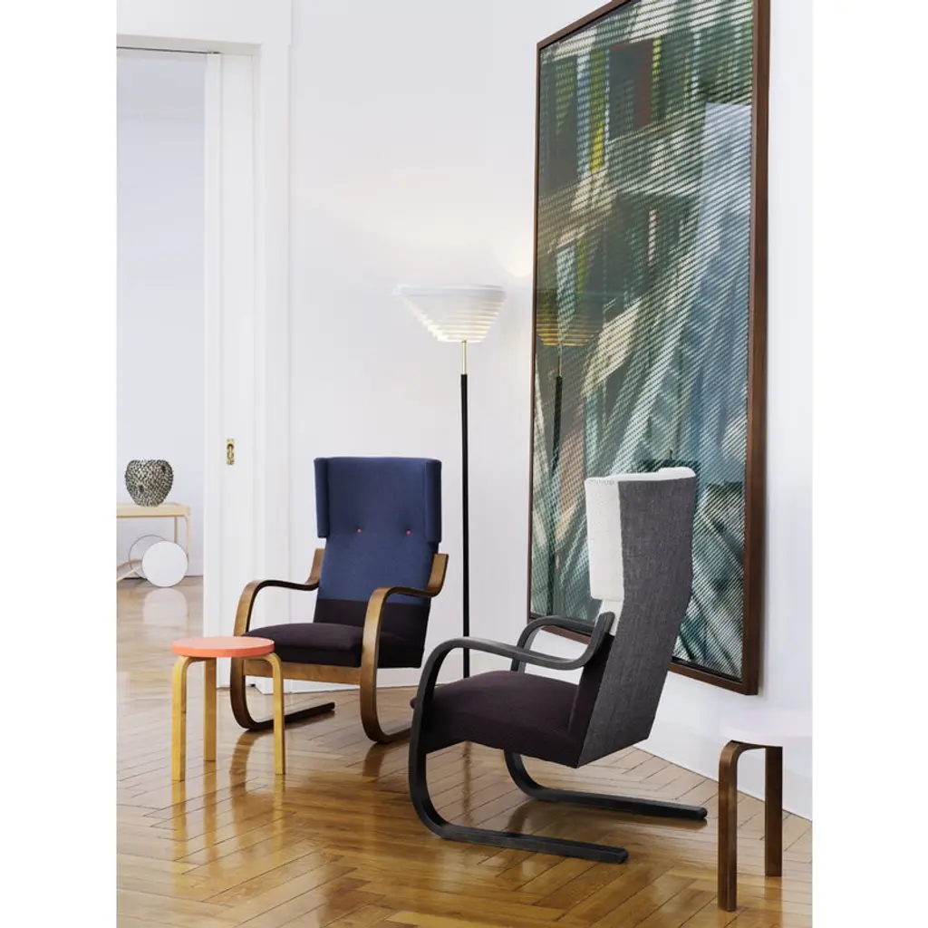 The armchair 401 was designed by Alvar Aalto for Artek in 1933. As many other Aalto classics, the lightweight and streamlined armchair 401 was designed for the Paimio Sanatorium. Its calm appearance was well suited for the Sanatorium, and the high back and small wings adjoining the headrest offered privacy for the patients. Both armrests of the chair have been cut from the same piece of form-bent birch lamella, ensuring that the armchair will stay stable over time. A sprung seat makes the chair pleasant to sit on. Still crafted from Finnish birch in traditional methods, the upholstered armchair 401 has been a part of Finnish interiors for many decades, and in the 21st century, it continues to charm new generations.