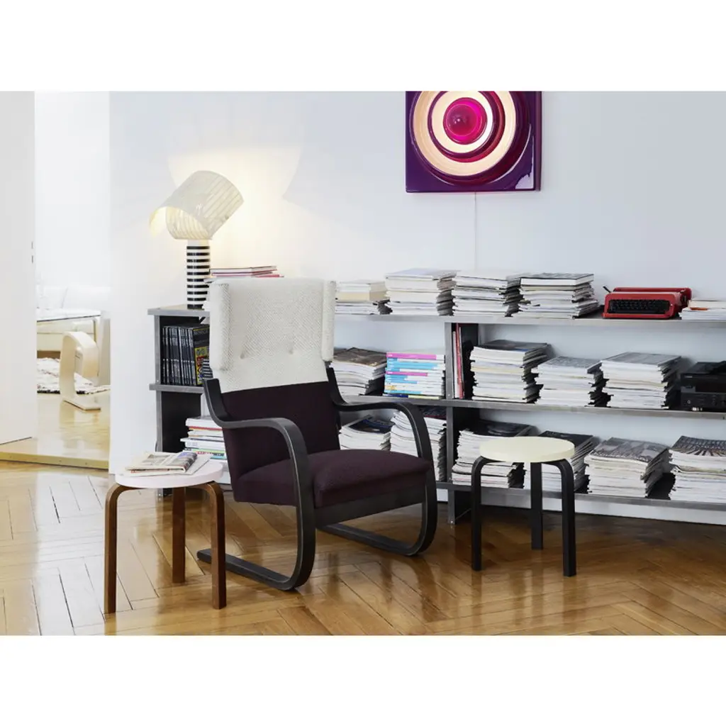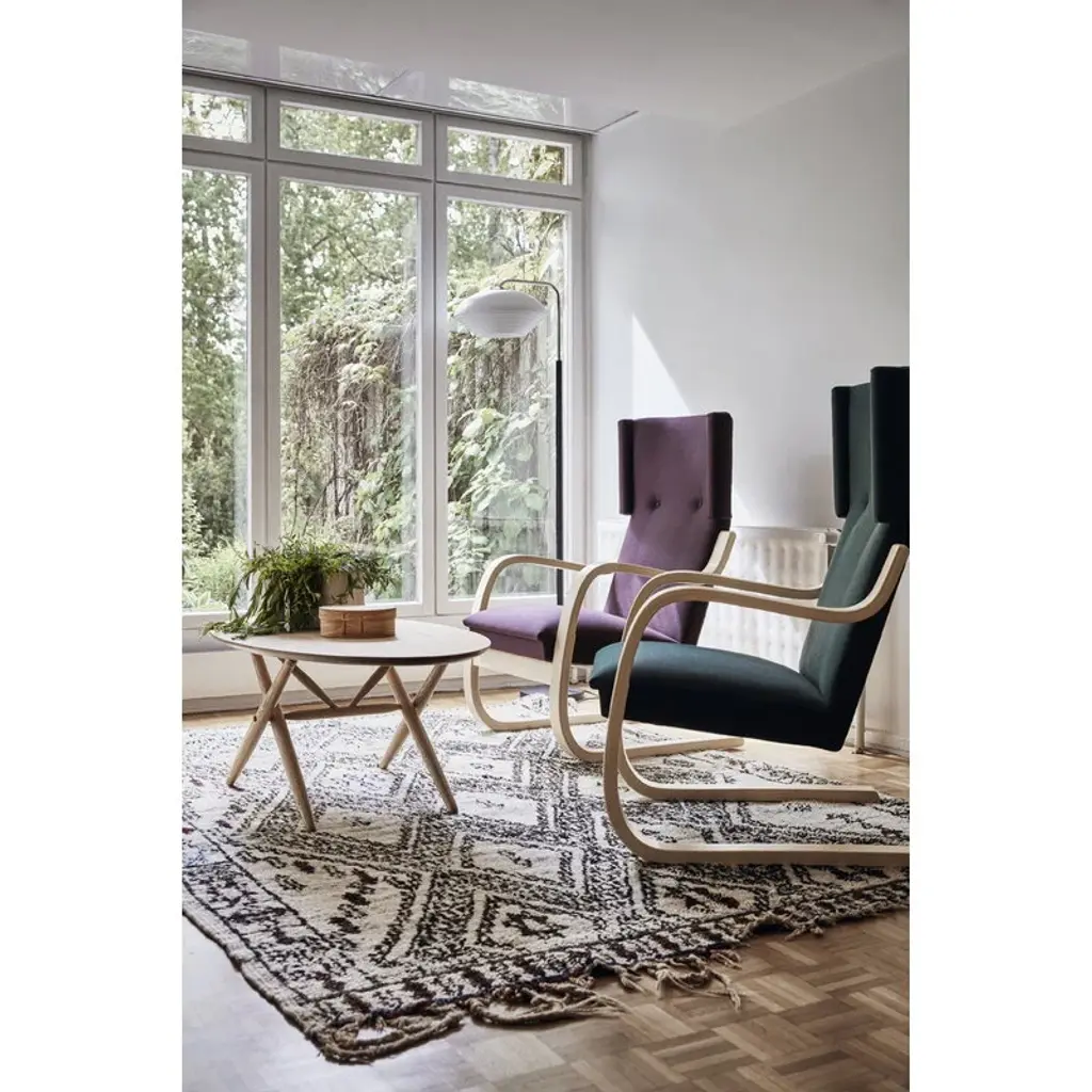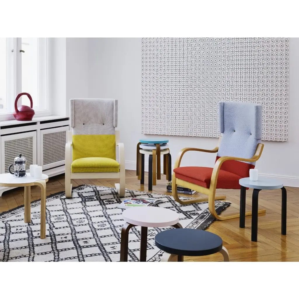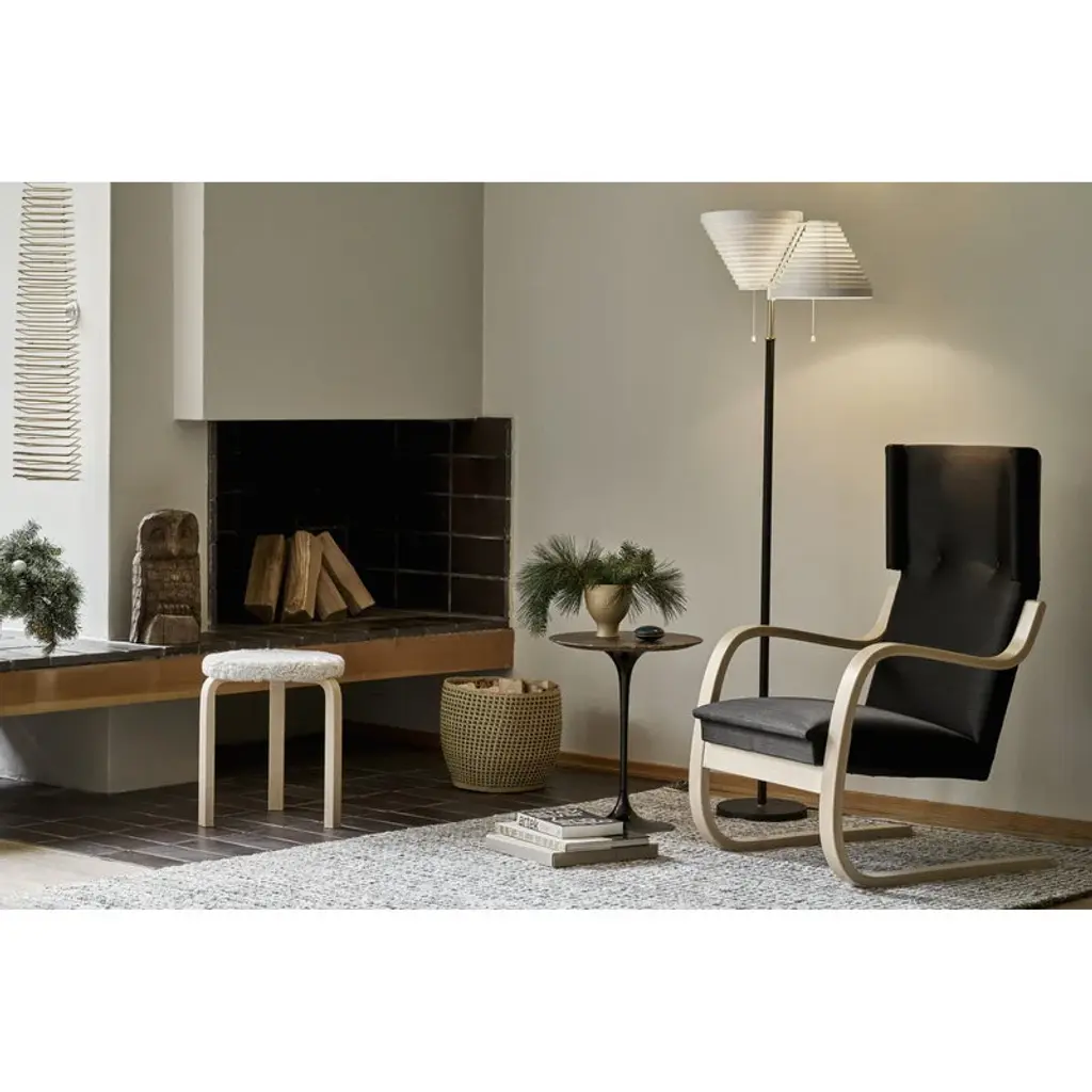 The armchair 401 was designed by Alvar Aalto for Artek in 1933. As many other Aalto classics, the lightweight and streamlined armchair 401 was designed for the Paimio Sanatorium. Its calm appearance was well suited for the Sanatorium, and the high back and small wings adjoining the headrest offered privacy for the patients. Both armrests of the chair have been cut from the same piece of form-bent birch lamella, ensuring that the armchair will stay stable over time. A sprung seat makes the chair pleasant to sit on. Still crafted from Finnish birch in traditional methods, the upholstered armchair 401 has been a part of Finnish interiors for many decades, and in the 21st century, it continues to charm new generations.