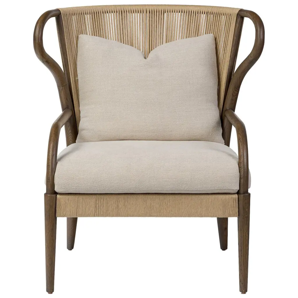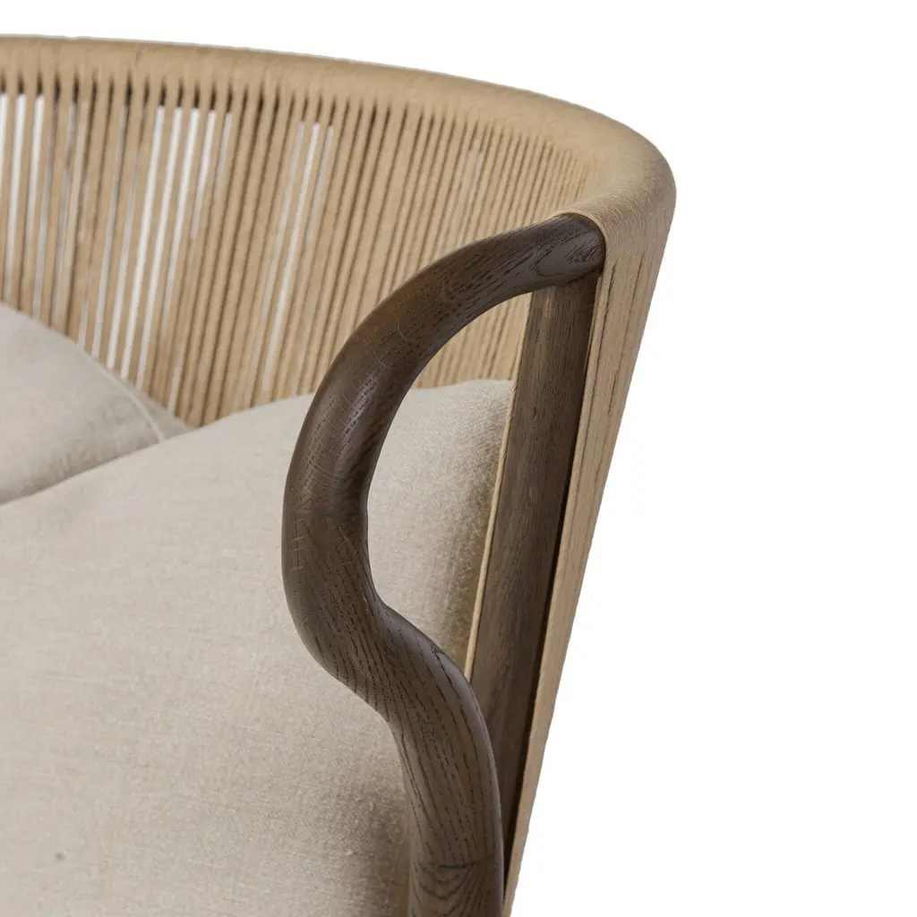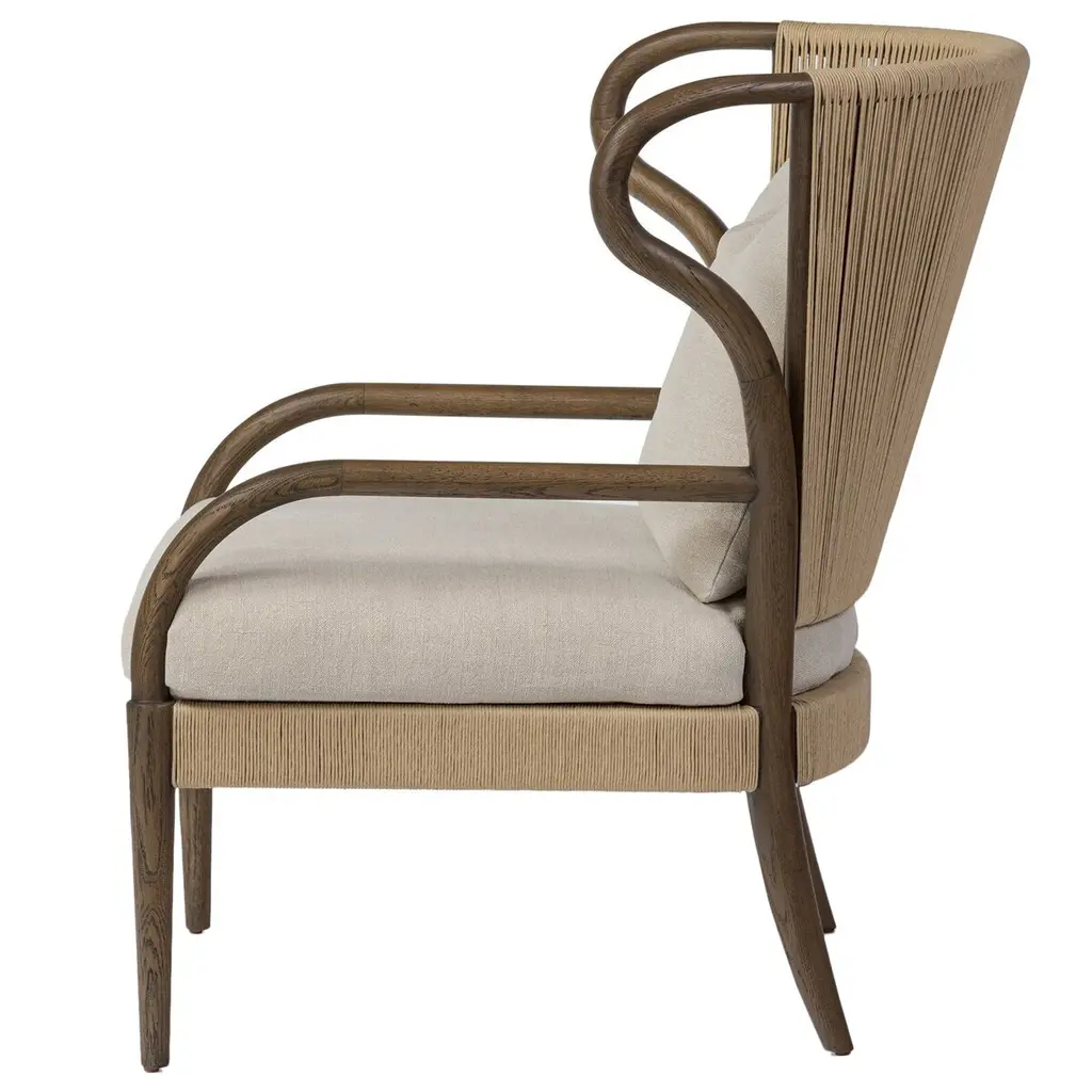 Inspired by the traditional wingback chair but with an art nouveau twist. The wing's organic curved frame creates a mixed media moment with the woven seat back and upholstery. A rope fixed to the back of the seat cushion is both functional and aesthetic, creating a more relaxed, comfortable look.