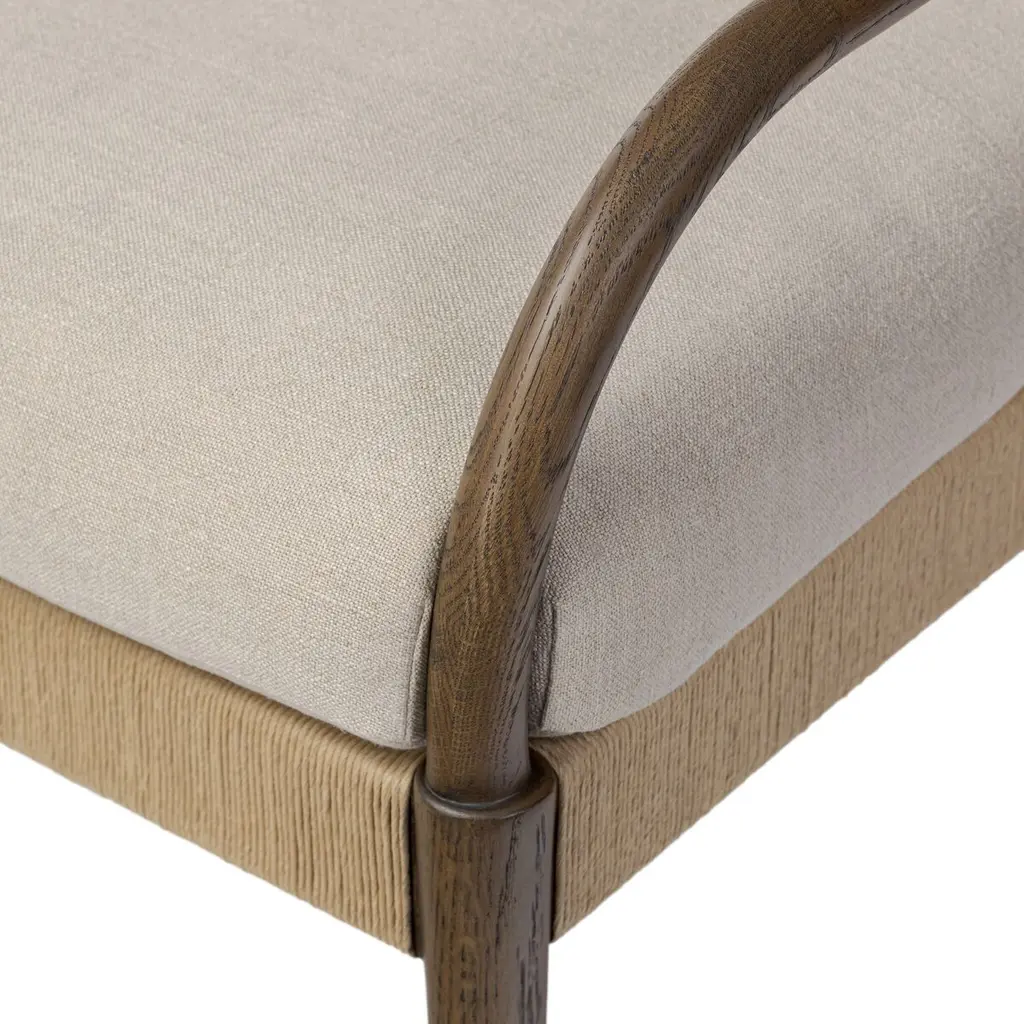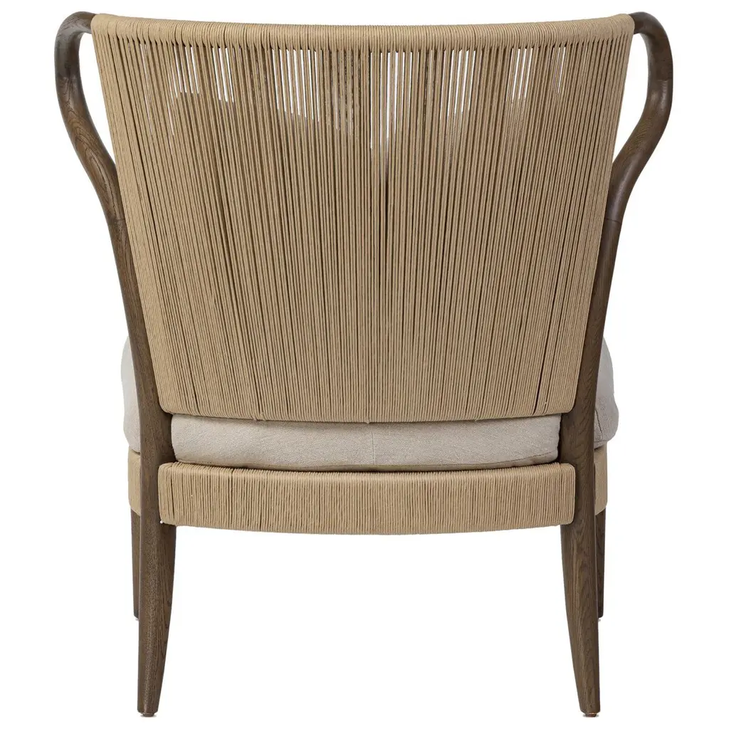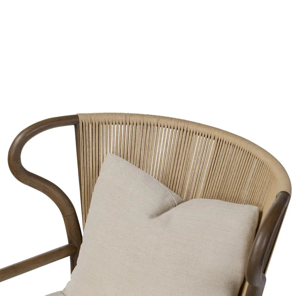 Inspired by the traditional wingback chair but with an art nouveau twist. The wing's organic curved frame creates a mixed media moment with the woven seat back and upholstery. A rope fixed to the back of the seat cushion is both functional and aesthetic, creating a more relaxed, comfortable look.