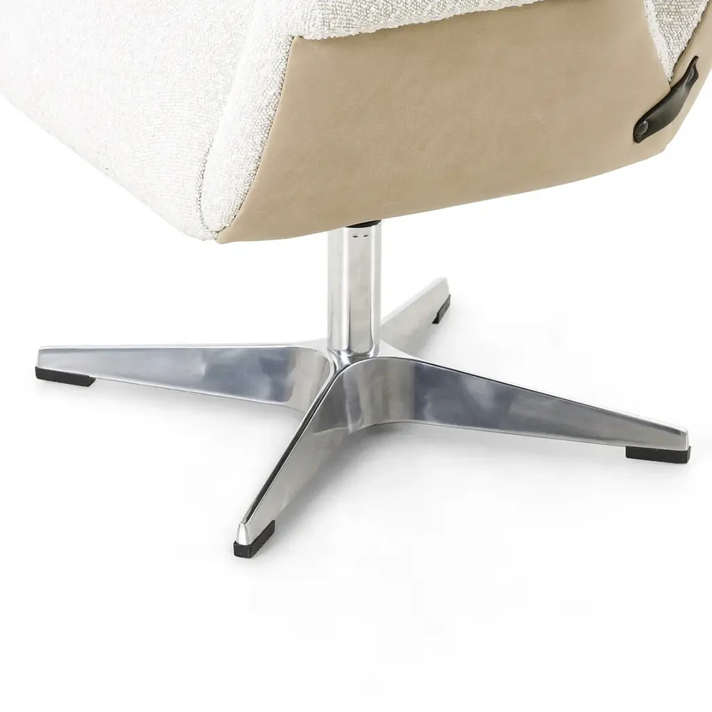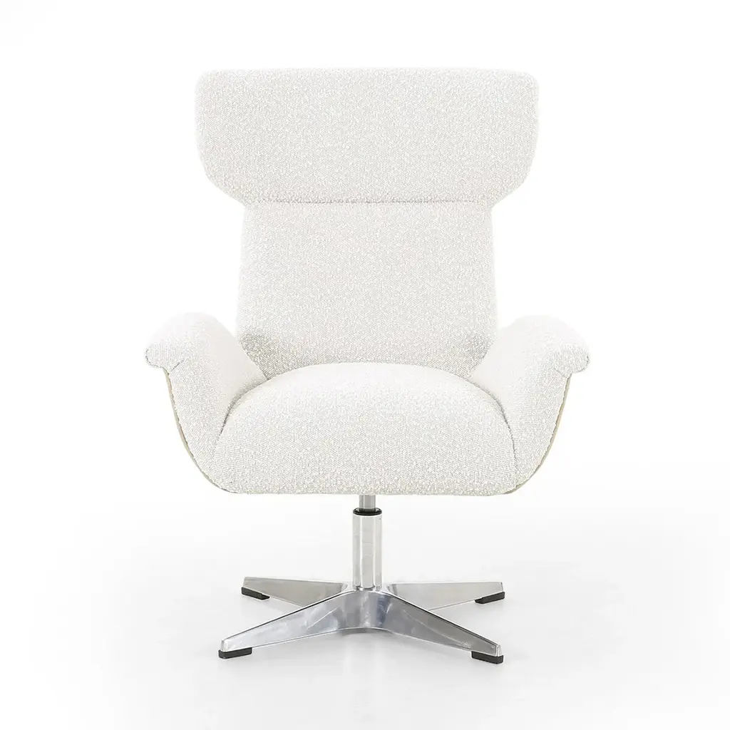 Turn up the drama. A strikingly sculpted wing chair mixes materials to modern effect, with boucle upholstered seating cradled by top-grain leather. All atop an adjustable pewter-polished aluminum base. Ships In 10-14 Business Days Adjustable height Swivel base Performance fabric This image is for illustrative purposes only. The colors shown are accurate within the constraints of lighting, photography, and the color accuracy of your screen.