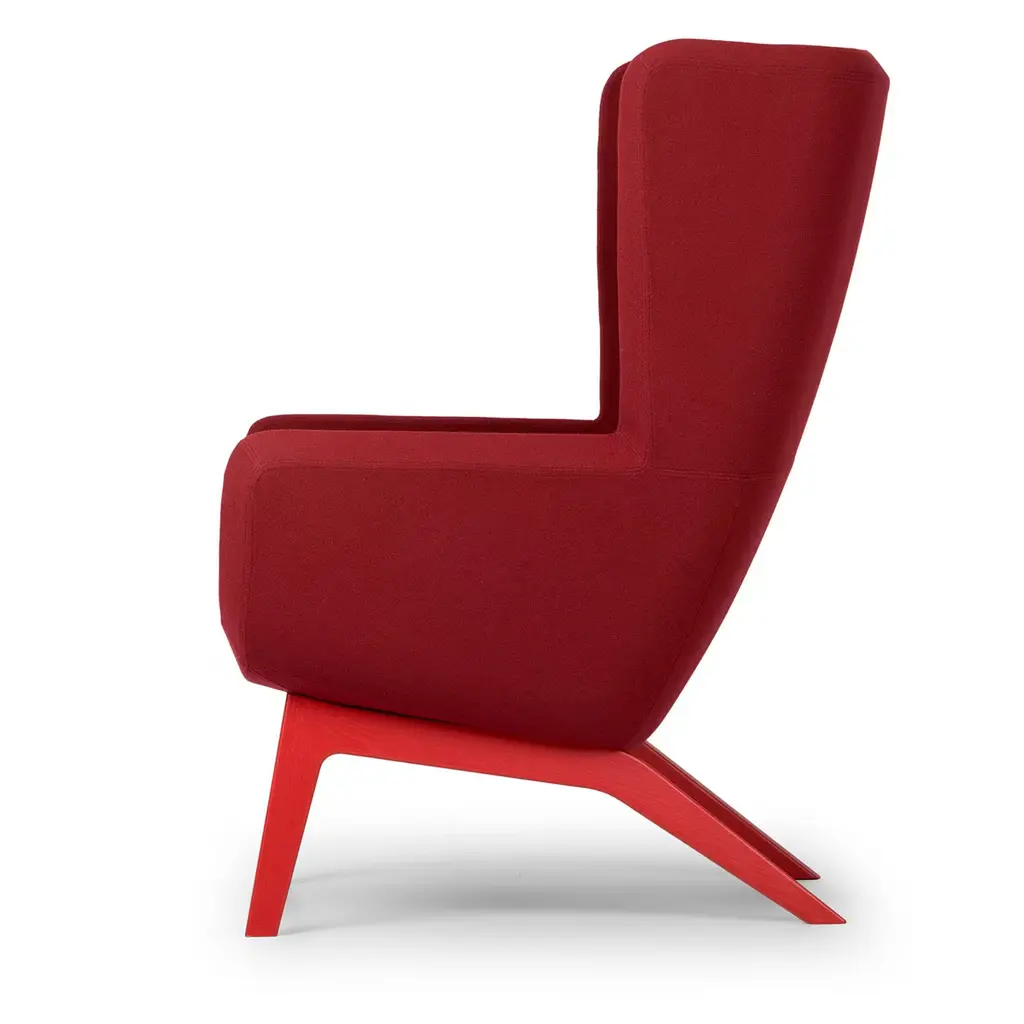 A remake of the classic wingback style, this armchair is the lounge version of the Arca armchair and boasts a comfortable and welcoming design. Padded with cold-molded polyurethane foam, the steel core frame delineates a tall back and embracing armrests, covered in an elegant shade of red fabric. The solid wood legs are in matching finish, the ones in the back distinguished for their sharply angled inclination which enhances the lounging experience. Contract and commercial certifications available upon request.