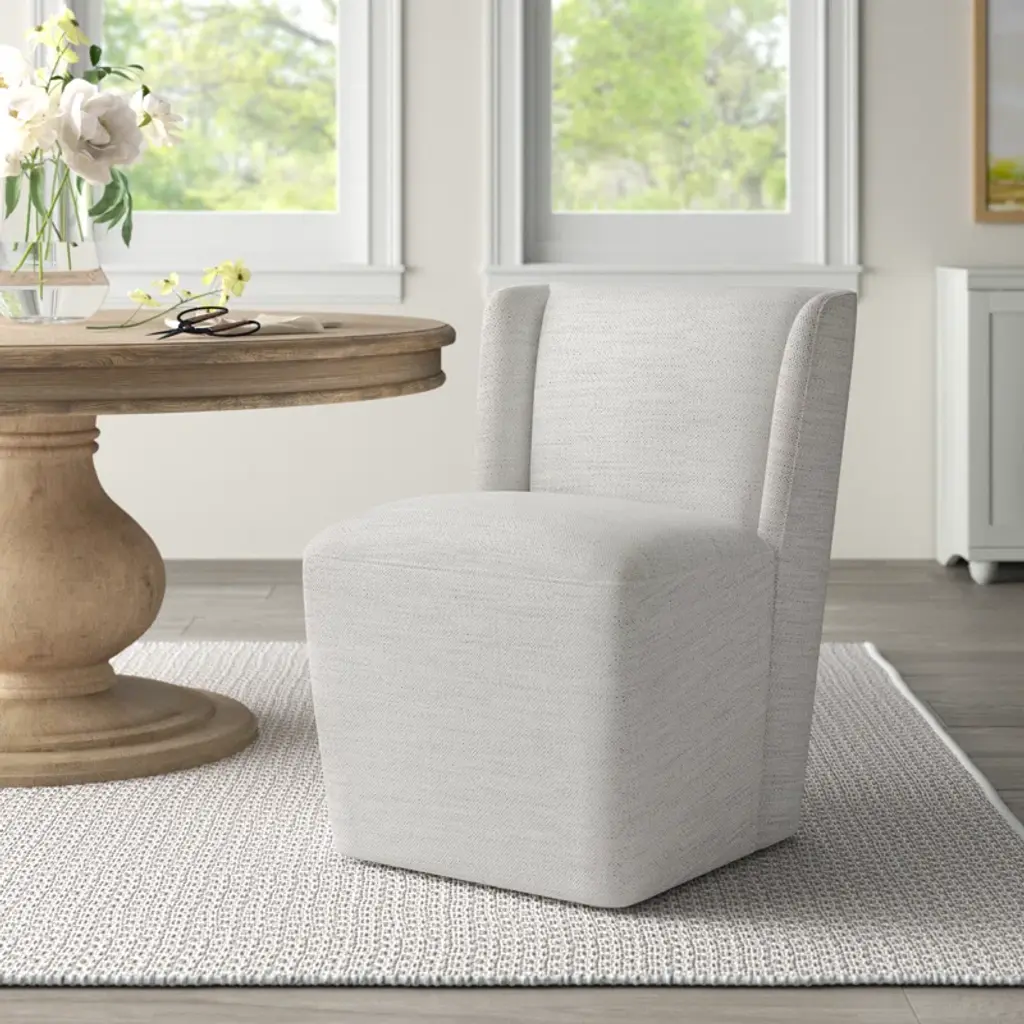 This wingback side chair is a versatile addition to any room, offering both comfort and style. Upholstered in a durable fabric, it features a cozy foam-filled seat and an elegant wingback design. The chair is supported by mortise and tenon joinery, ensuring a reliable seating option for your home. With smooth-rolling casters, you can easily move it around to find the perfect spot. Plus, it's easy to maintain – simply spot clean with a dry cloth. Please note, this chair is intended for residential use and has a weight capacity of 250 lbs.