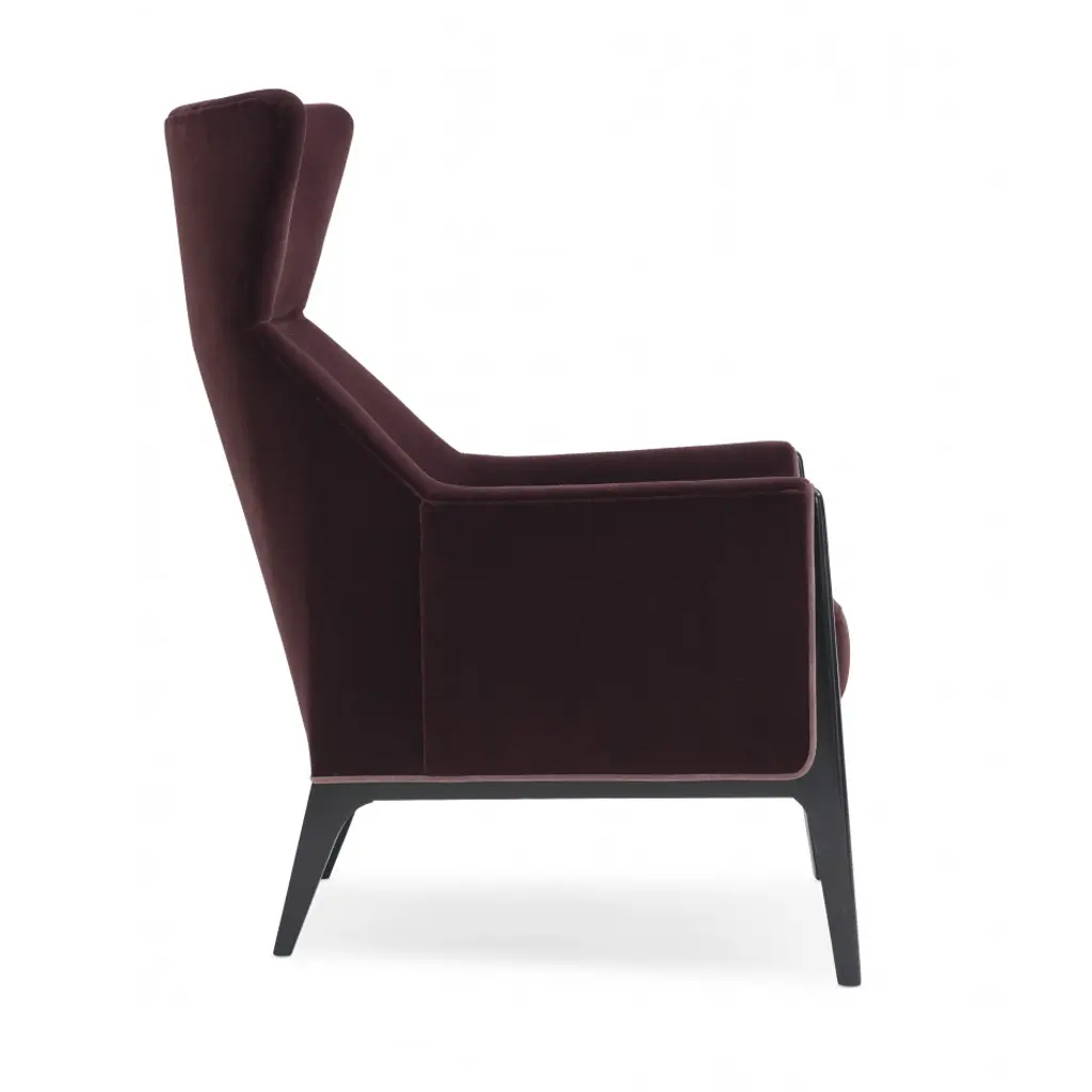 Featuring style that knows no boundaries, this unique chair is rich in color, material and presence. It represents an artist’s interpretation of the classic wing chair and is destined to shine in any setting. Its bold mo-velvet cover is featured in a rich shade of eggplant that shimmers and shines when it catches the light. A coordinating amethyst velvet welt adds another layer of distinction and is complemented with a Satin Ebony finish on the chair’s wood trim. With the power to instantly modernize a space, this distinctive chair works beautifully on its own or as a pair across from a sofa or fireplace.