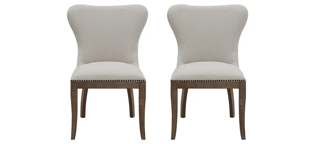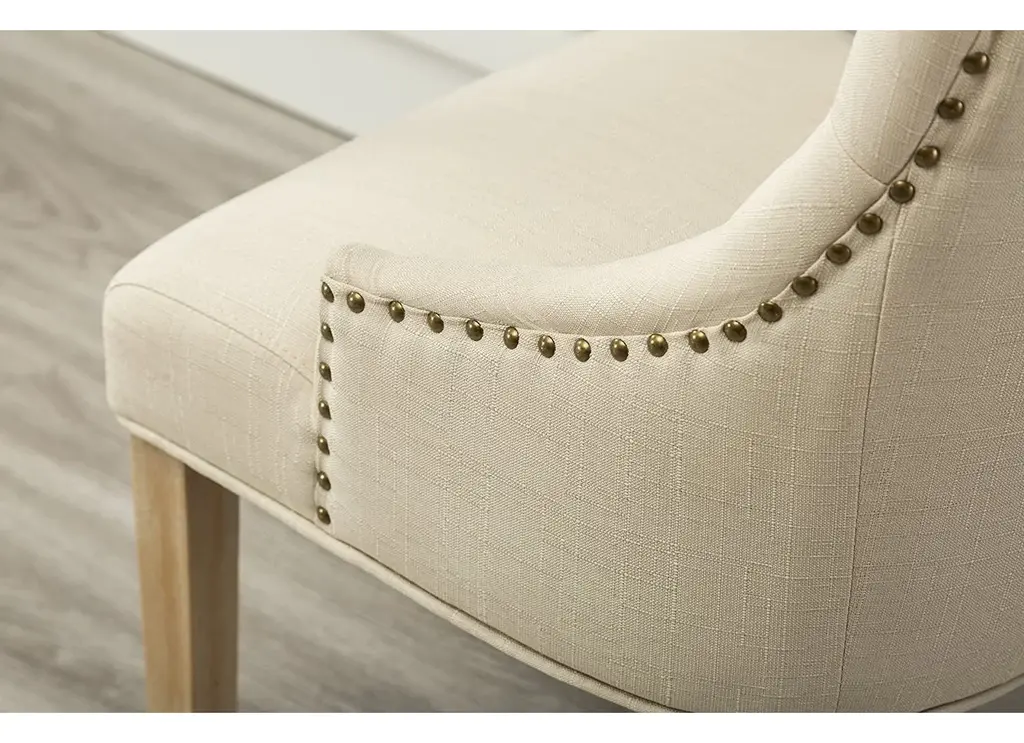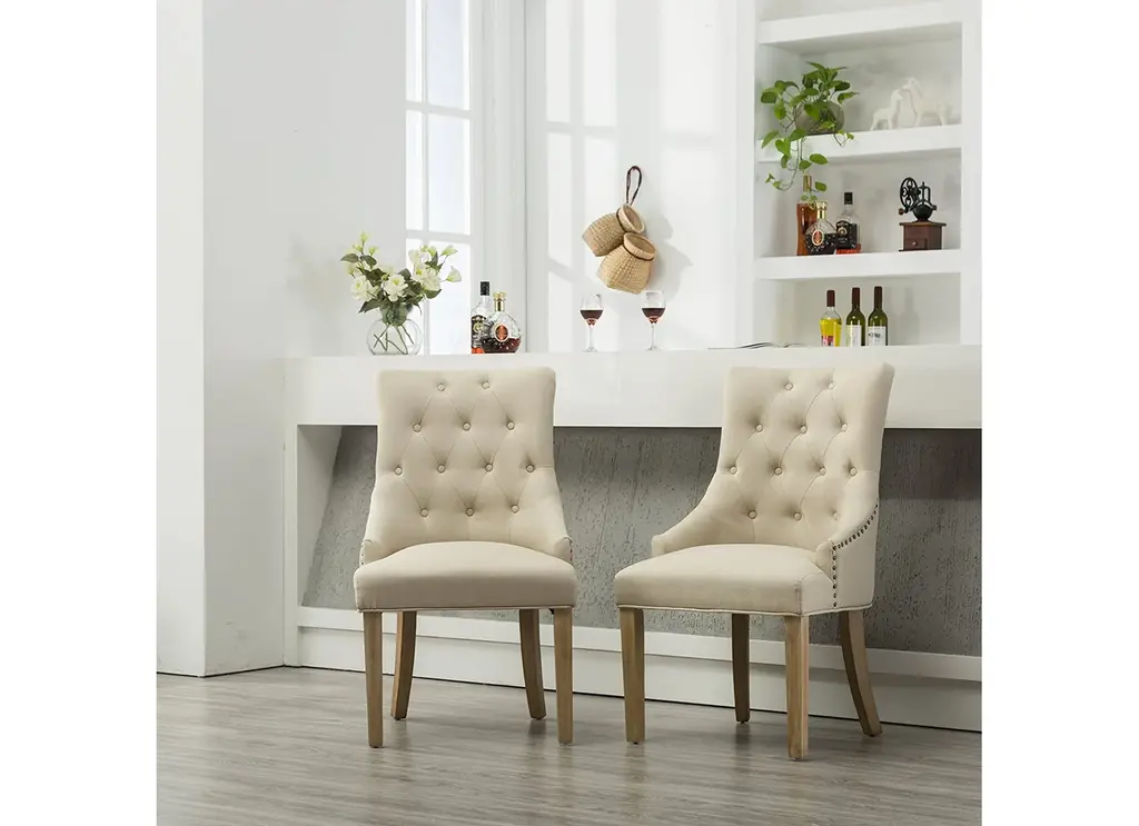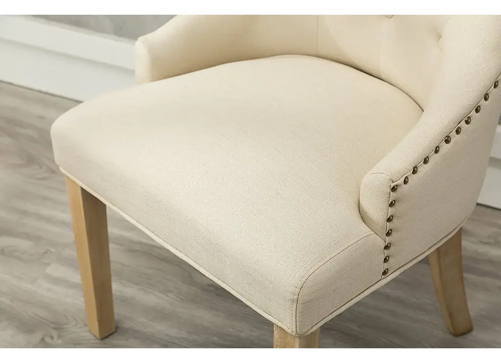 Give your dining room a touch of rustic elegance with these linen-look upholstered dining chairs. Traditionally inspired details like a wingback design and button tufting give a formal air, while a natural wood grain finish, and simplified contours keep the look understated. Choose between three colors upholstery options to find your perfect style.Button tufting creates a plush inviting lookFeatures coordinating gold nail heads and rustic wood finishSet includes 2 chairs ship in one box, some assembly required, all parts and instructions included.Seat cushion thickness: 5"; Seat dimensions: 22"W x 17"D x20"H; Overall dimensions: 22"Wx 24"D x 39"H