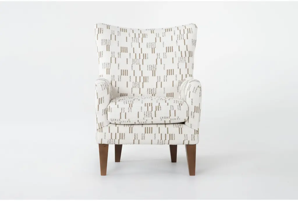 The Camille White Fabric Modern Wingback Arm Chair with Dark Walnut Finish is a stylish addition to any living space. Its modern design and neutral beige color make it a versatile piece that complements various room decors. Made in the USA, this chair features a comfortable wingback design with supportive arms.