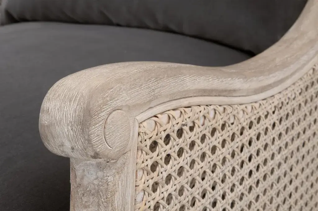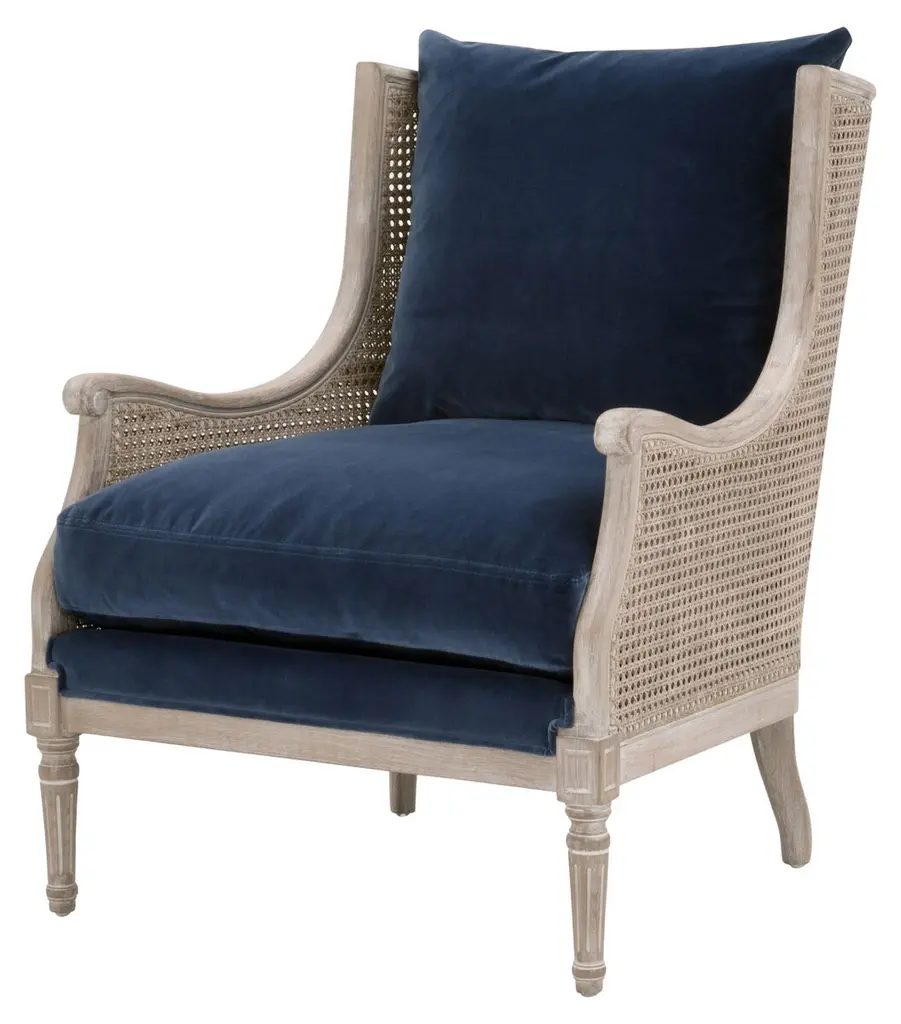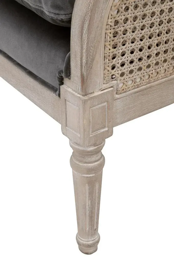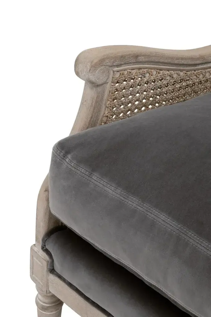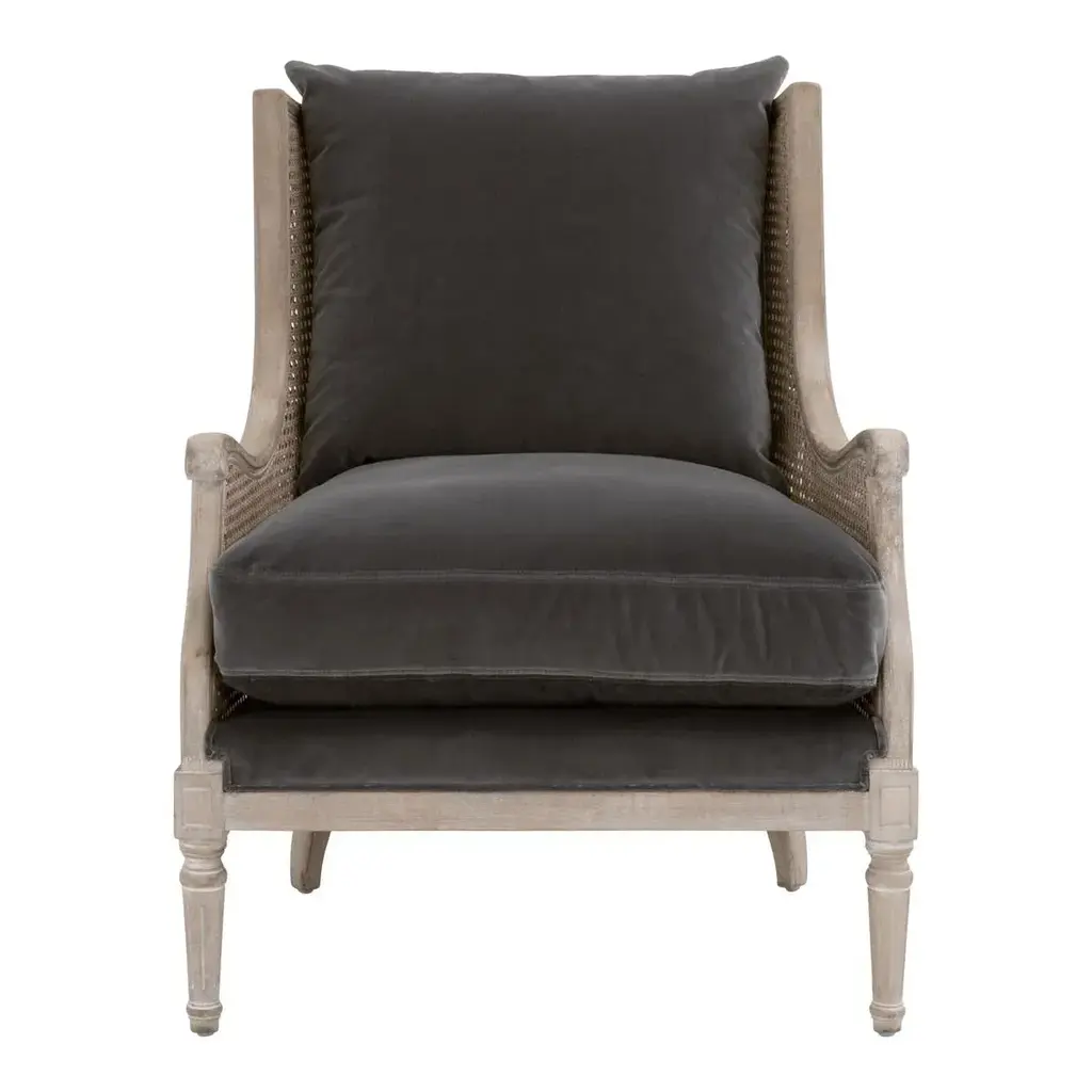 This timeless club chair will elevate your living space with its transitional style and neutral tones. The chair back and sides are constructed with a classic rattan cane material for a traditional and ageless look. The seat and back cushions are removable and upholstered with a rich, dark gray velvet that nicely contrasts the natural gray tones of the wood and cane. The wingback sides seamlessly curve into armrests with scroll detailing at the edge of the arms. The front legs are carved with fine detailing that gives this accent chair a tinge of old-world charm. It will be the perfect finishing touch to many living room styles. Base Dimensions: W:29" D:30" H:36" FEATURES & BENEFITS: Cane Chair Frame Removable & Reversible Seat and Back Cushions Seat Cushion Fill: Down & High Density Foam MORE DETAILS: Materials: Solid Birch Wood, Rattan, 89.1% Cotton/10.9% Polyester Velvet, Foam, Down Blend Seat Height: 20" Seat Width: 25" Seat Depth: 26" Arm Height: 23.5" Leg Height: 8.5"