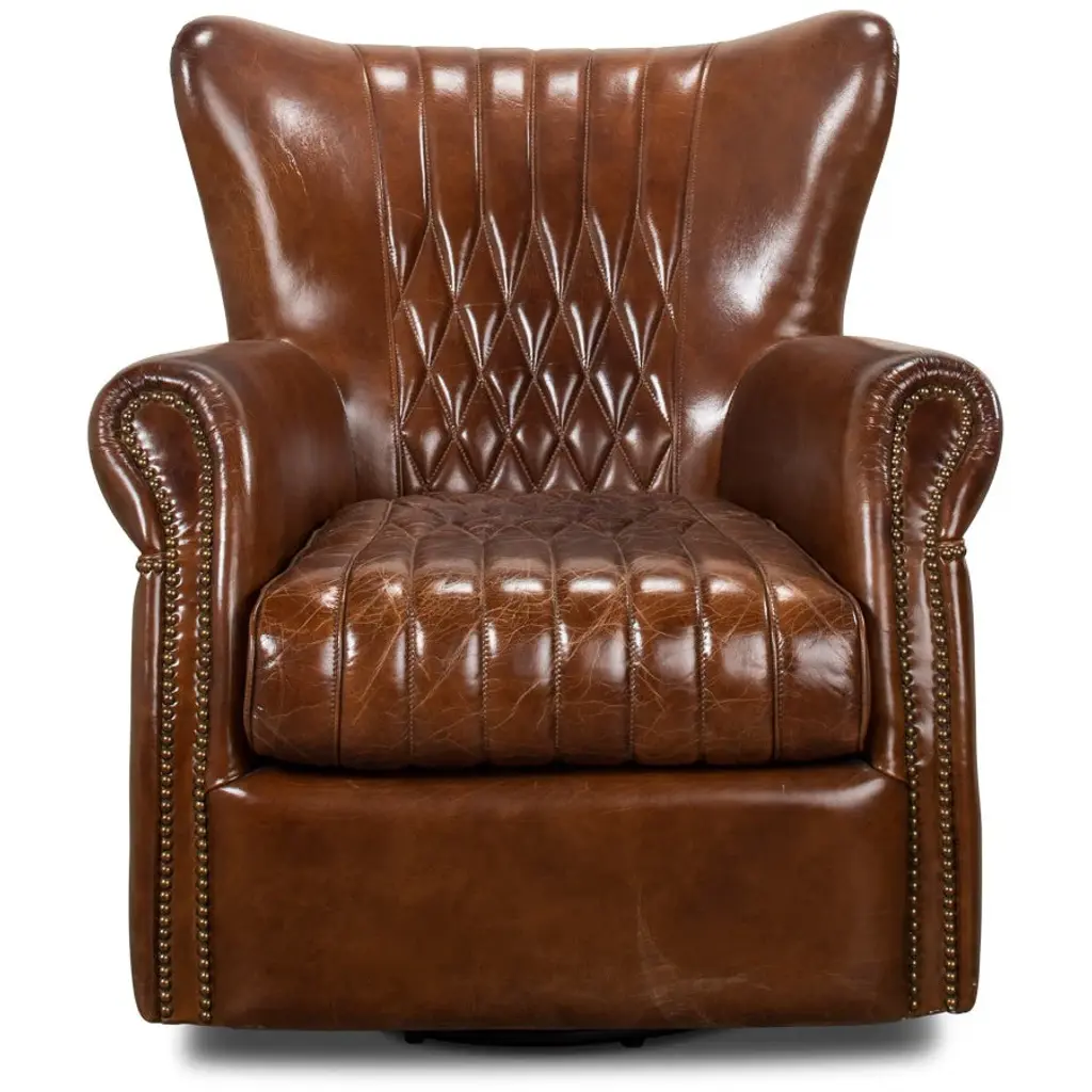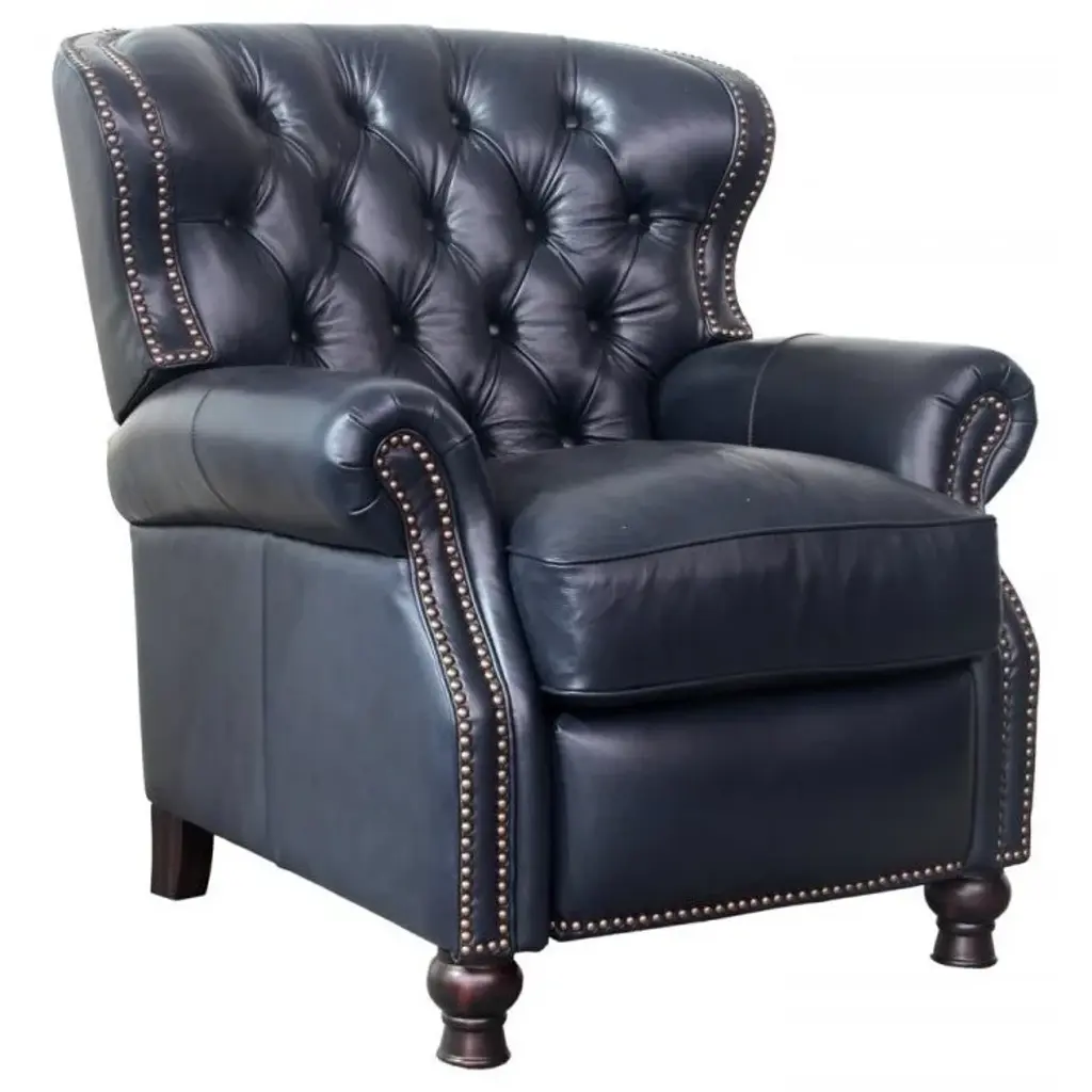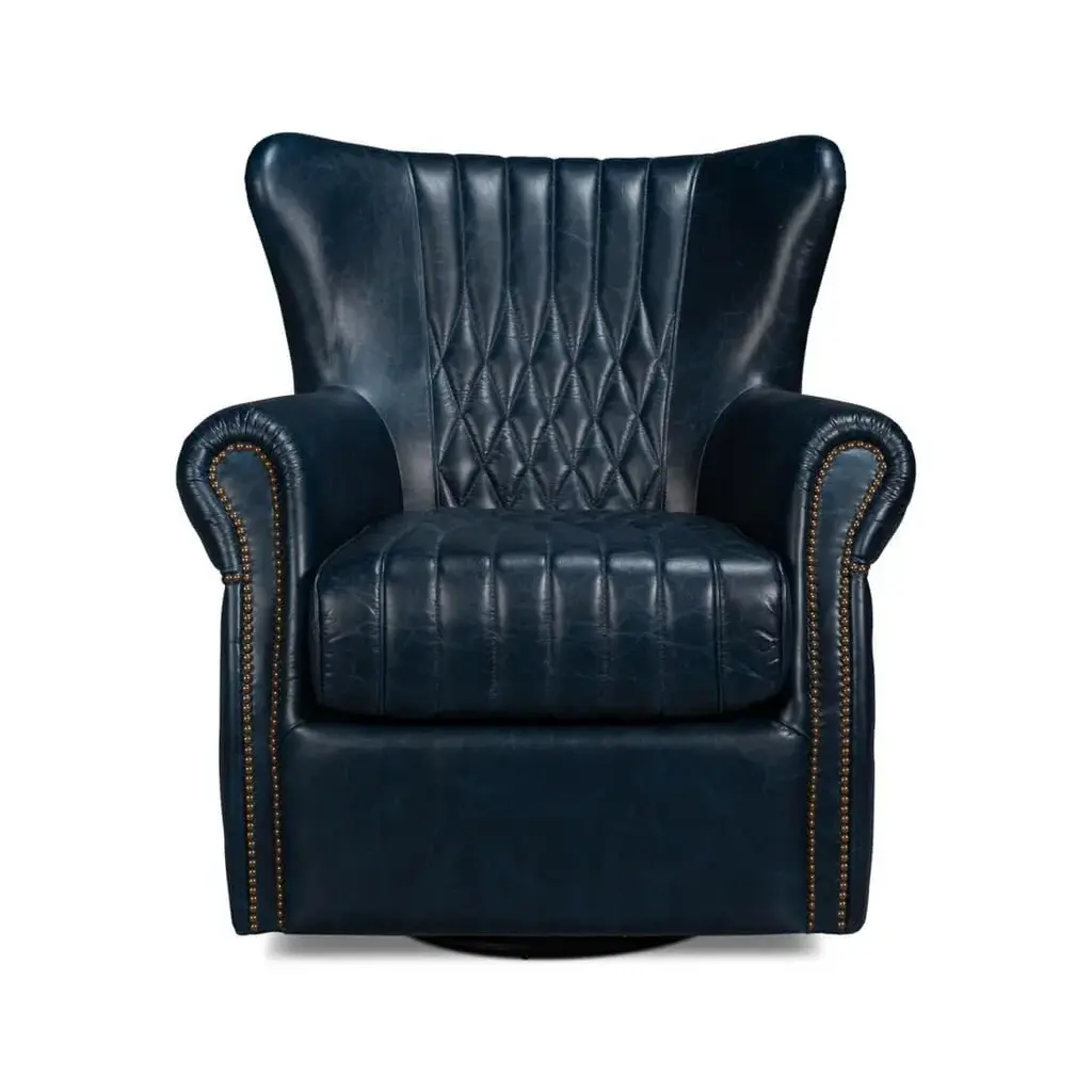 A masterpiece that encapsulates timeless charm and contemporary comfort. Crafted with high-quality Chateau Blue leather, it boasts iconic diamond quilting and channels that bring an air of aristocratic elegance to any room. With a high winged backrest, and padded rolled arms detailed with intricate brass nailhead trim. Ideal for a sophisticated home library, an elegant living room, or as a standalone statement piece, this chair invites you to indulge in its luxurious comfort while elevating your interior decor to a new level of sophistication. Dimensions: 32" W x 29" D x 33" H Seat - 19" H x 20" W x 22" D Arm - 23" H