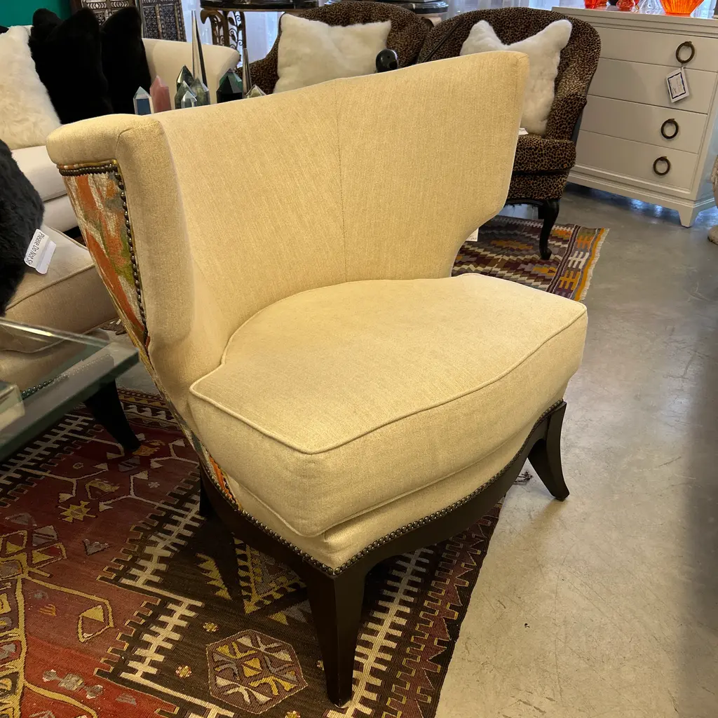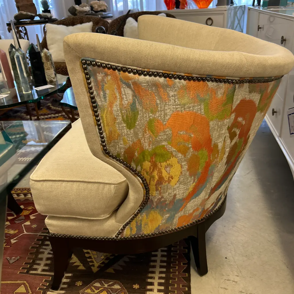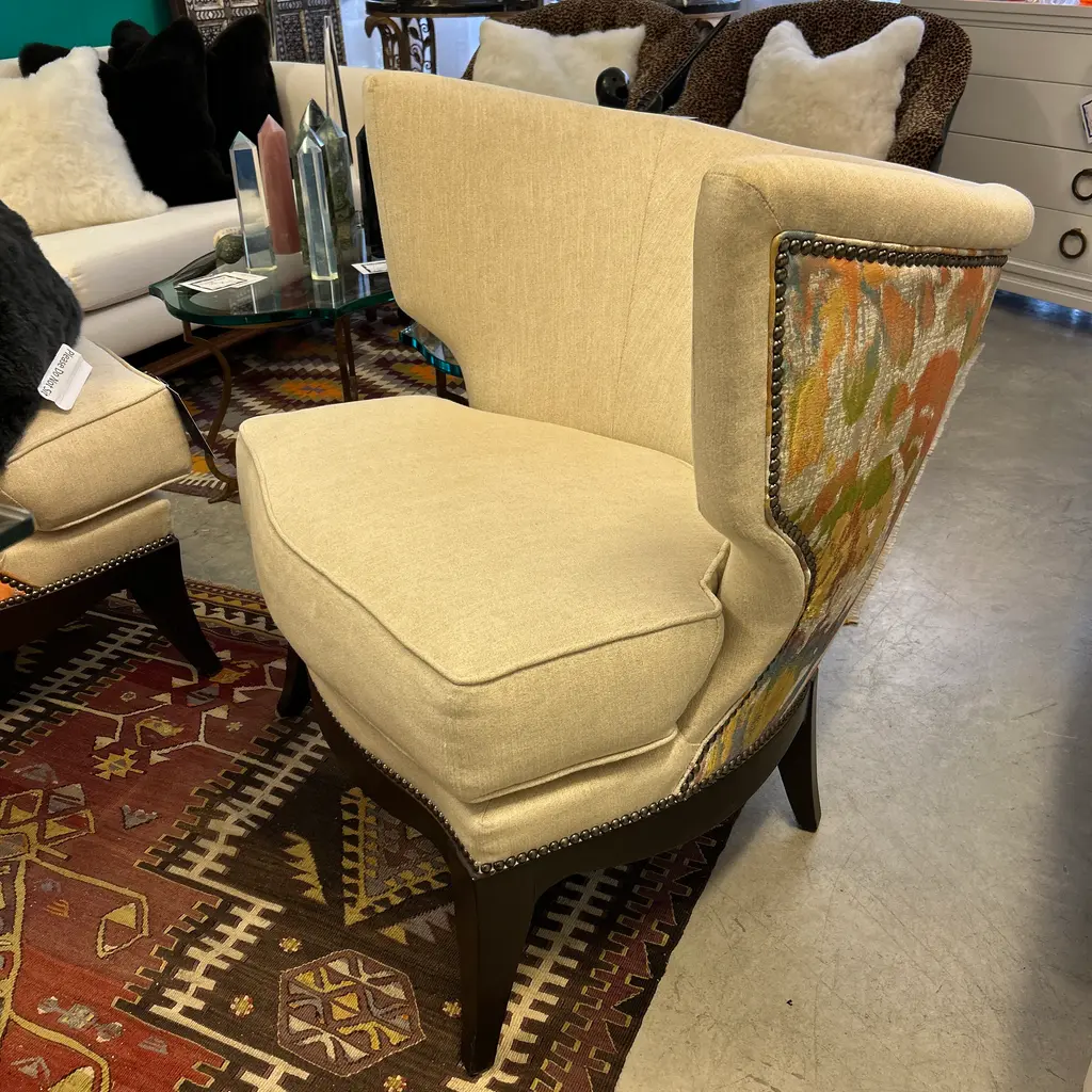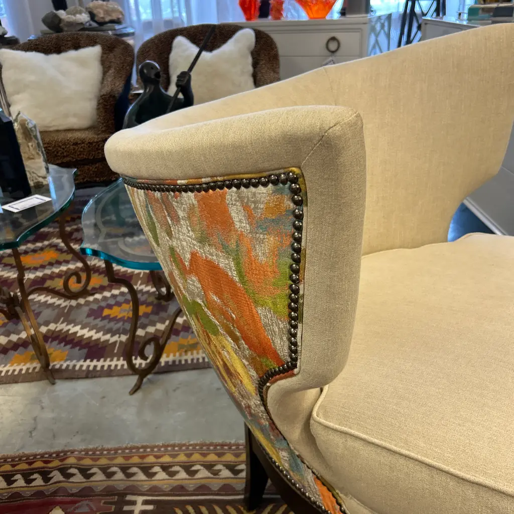Large super comfortable wing chair in cream woven fabric and multicolored upholstery on the back. The chair has brass or bronze tacks.
