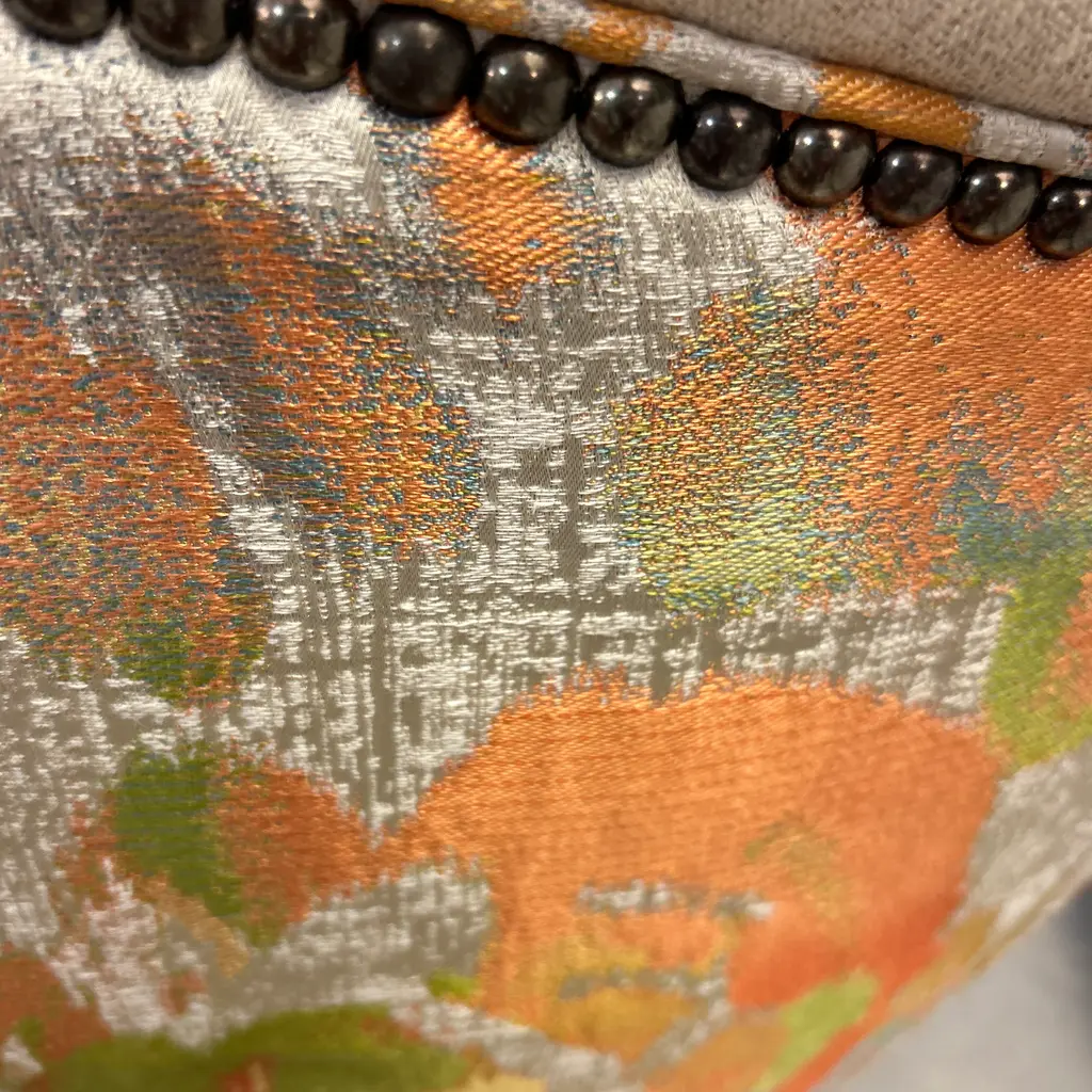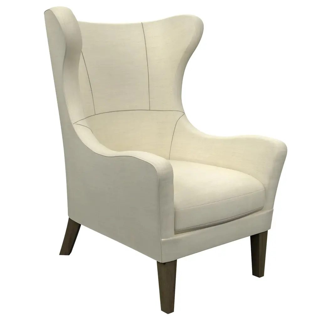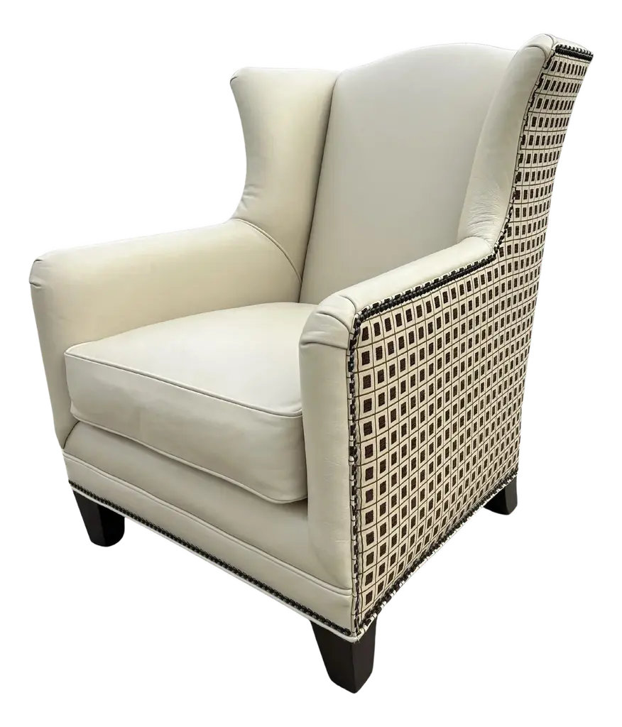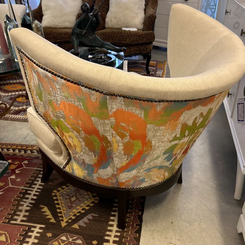 Large super comfortable wing chair in cream woven fabric and multicolored upholstery on the back. The chair has brass or bronze tacks.