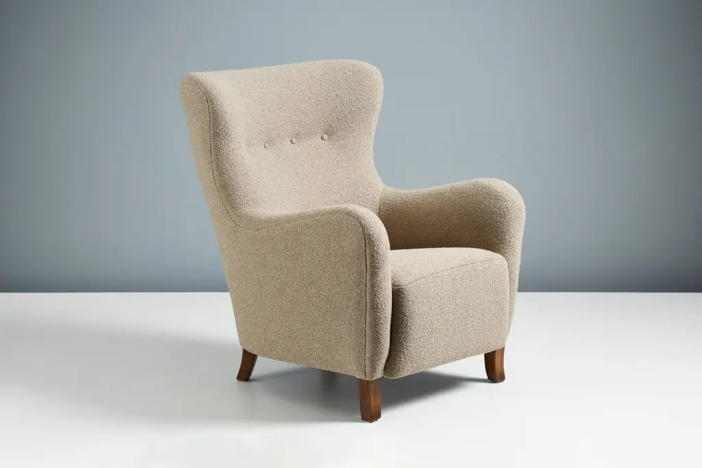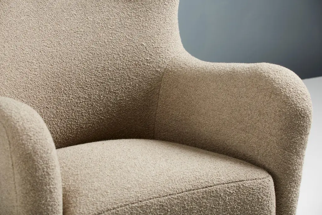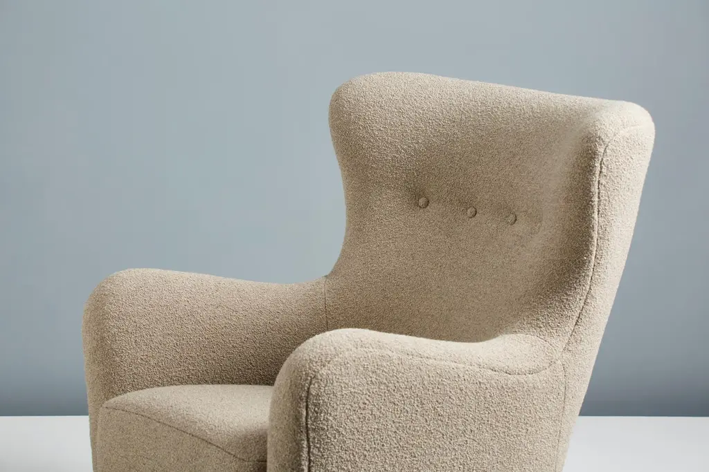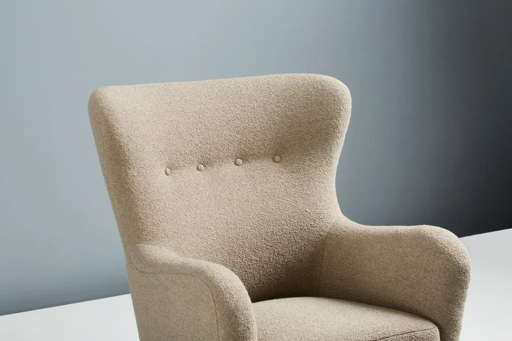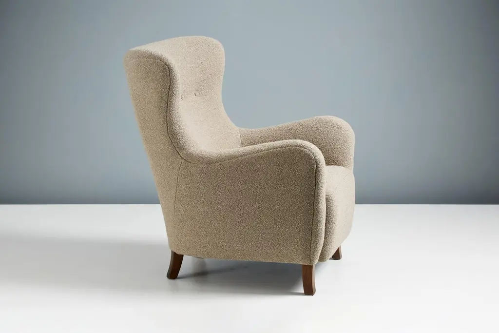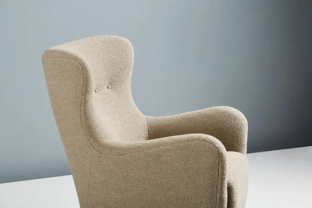 Dagmar design Sampo wing chairA custom-made wing chair developed & produced at our workshops in London using the highest quality materials. The frame is built from solid tulipwood with a fully sprung seat. This example is upholstered in a warm, stone-grey boucle fabric with fumed oak legs. The Sampo chair is available to order upholstered in a range of different fabrics, velvets and sheepskins and with a choice of 4 leg finishes.Measures: H 98 cm, D 80 cm, W 78 cm, SH 43 cm.