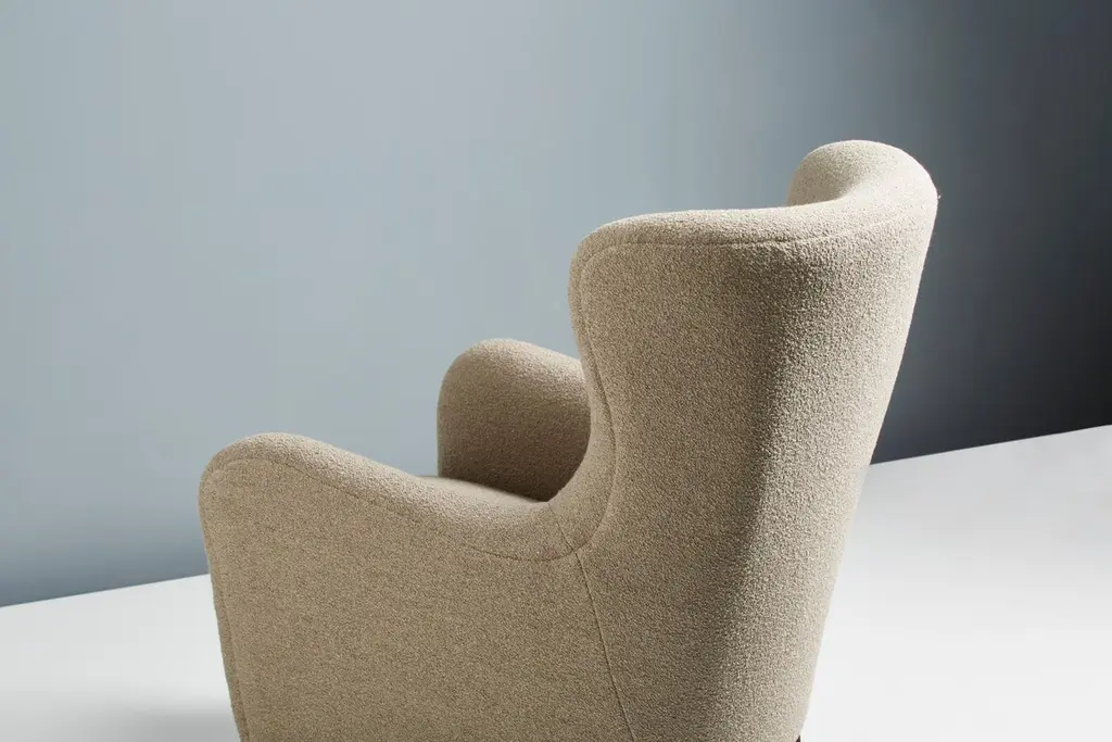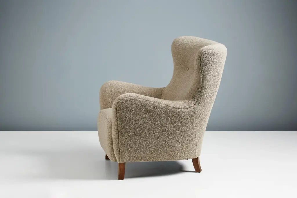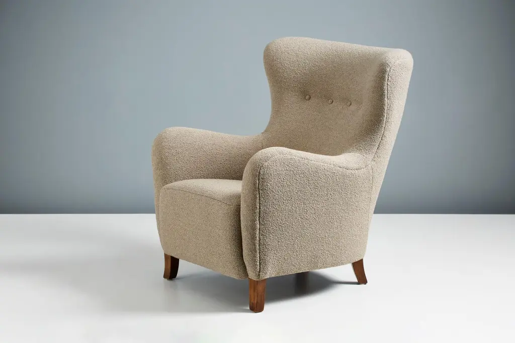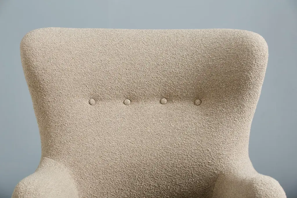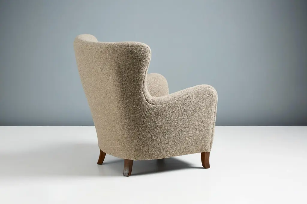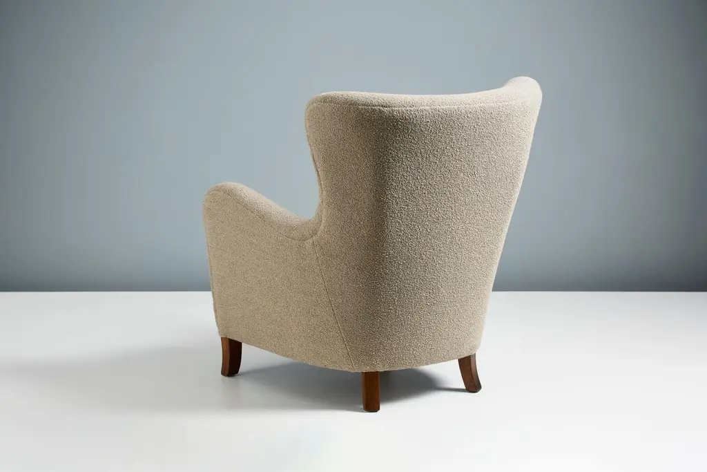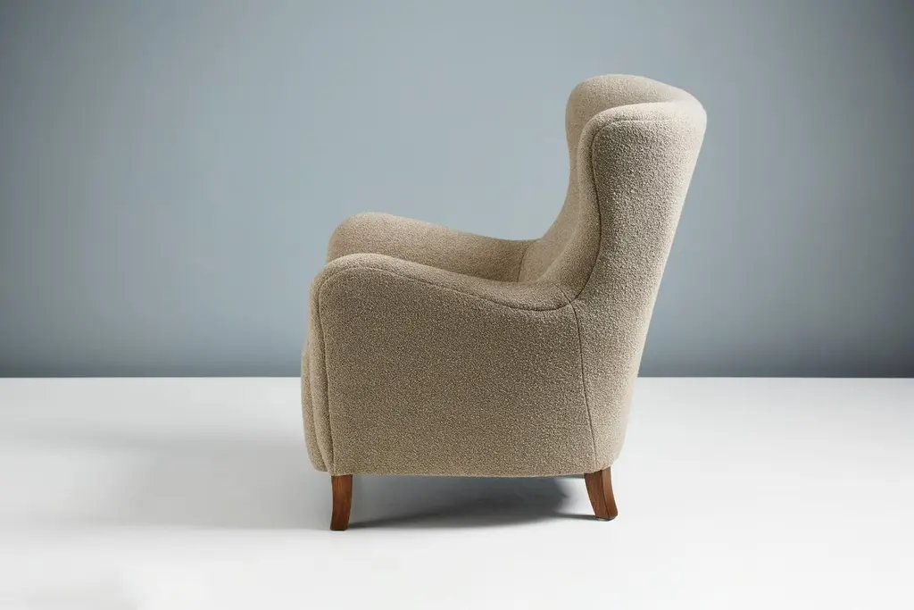 Dagmar design Sampo wing chairA custom-made wing chair developed & produced at our workshops in London using the highest quality materials. The frame is built from solid tulipwood with a fully sprung seat. This example is upholstered in a warm, stone-grey boucle fabric with fumed oak legs. The Sampo chair is available to order upholstered in a range of different fabrics, velvets and sheepskins and with a choice of 4 leg finishes.Measures: H 98 cm, D 80 cm, W 78 cm, SH 43 cm.