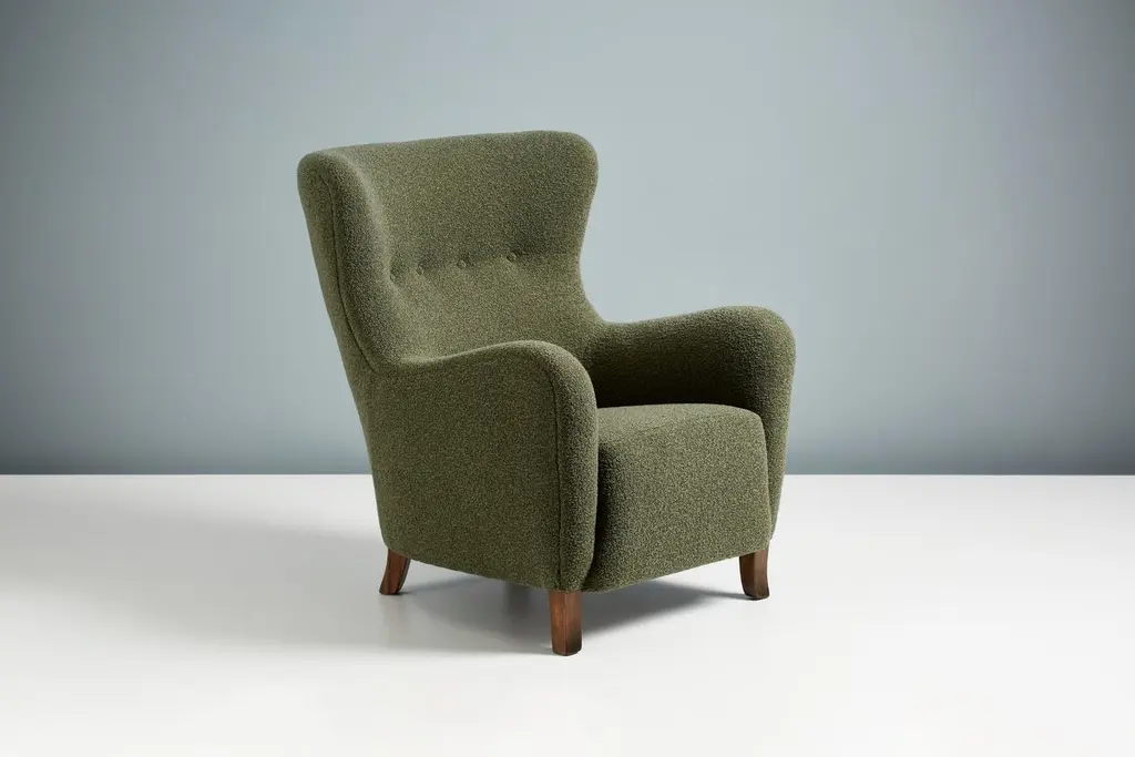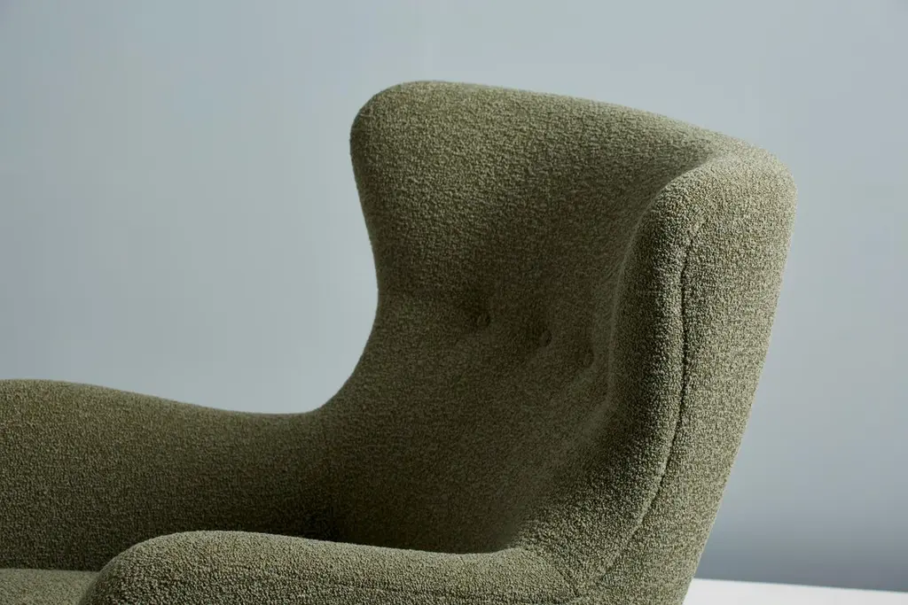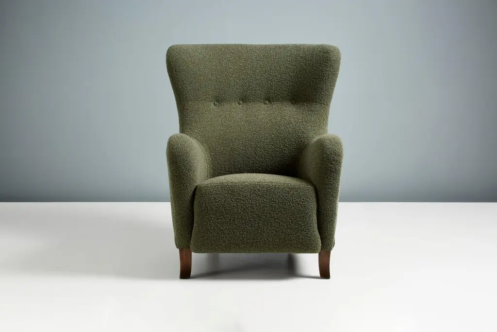 Dagmar Design - Sampo Wing Chair to be upholstered in Dedar Nimbus boucle fabricA custom-made wing chair developed & produced at our workshops in London using the highest quality materials. The frame is built from solid tulipwood with a fully sprung seat. This example is upholstered in nimbus boucle fabric from Dedar with fumed oak legs. The Sampo chair is available to order upholstered in a range of different fabrics, velvets and sheepskins and with a choice of 4 leg finishes.This model is also available as a single chair or with matching ottomans by request.Measures: H 98 cm, D 80 cm, W 78 cm, SH 43 cm.