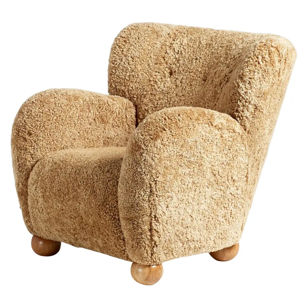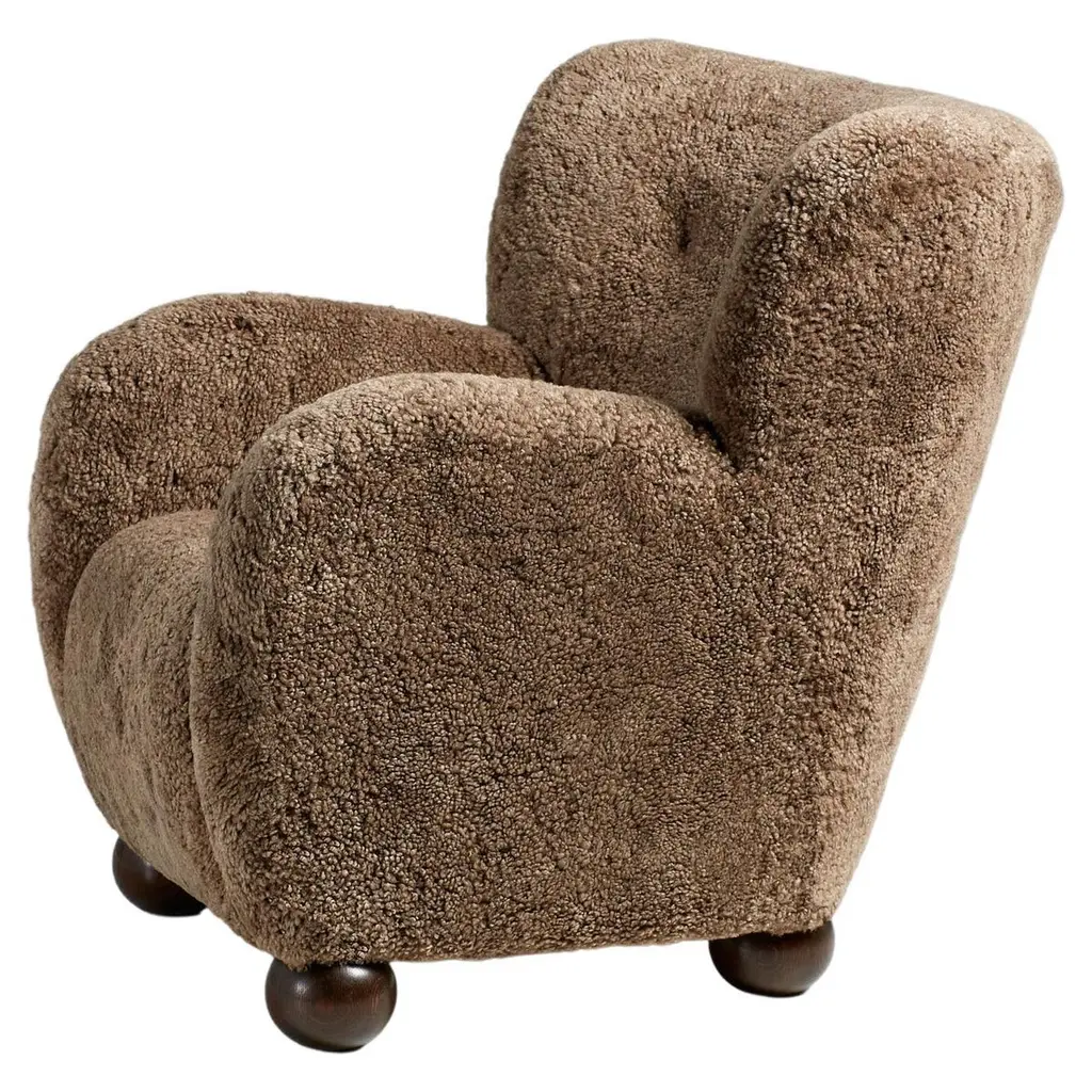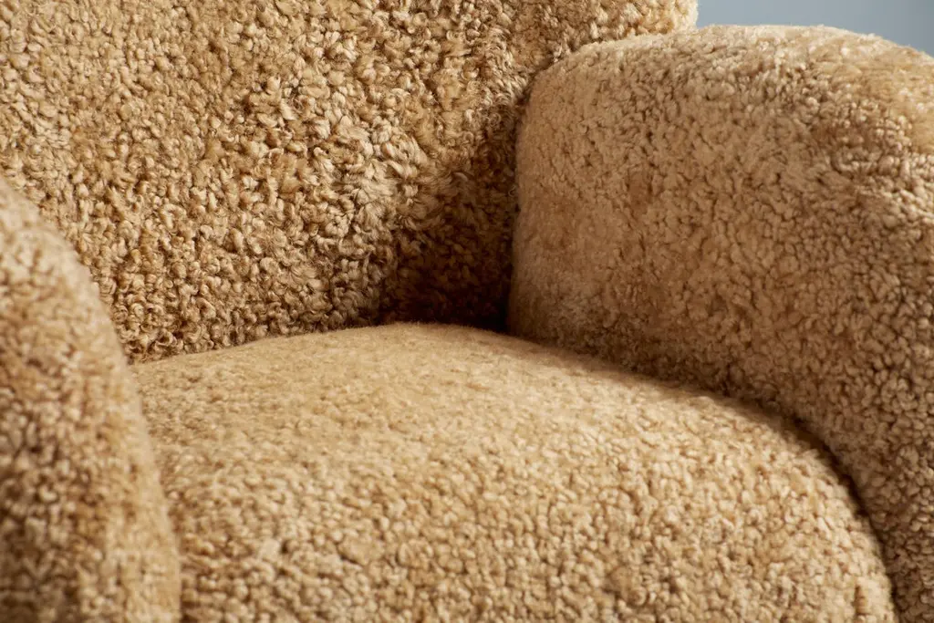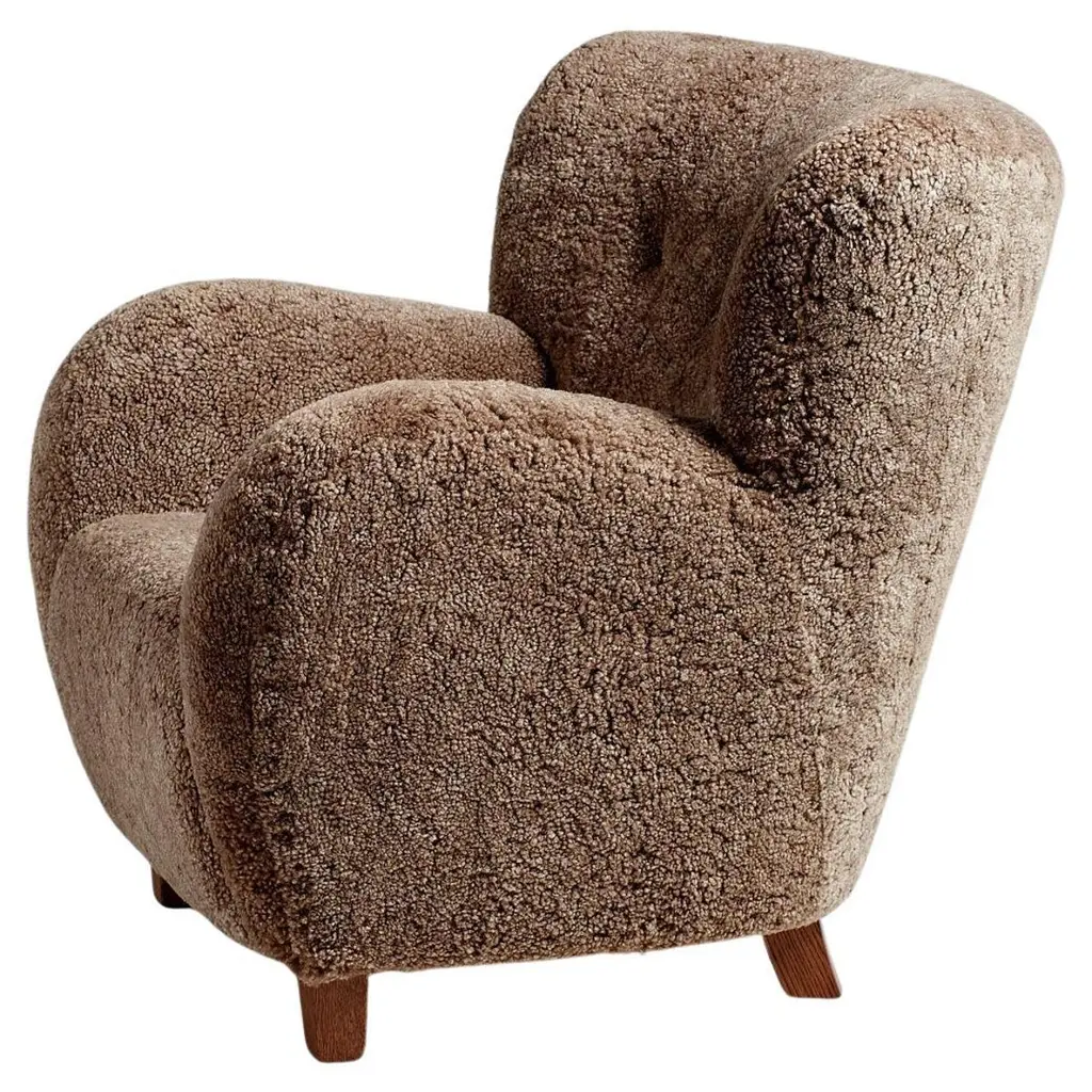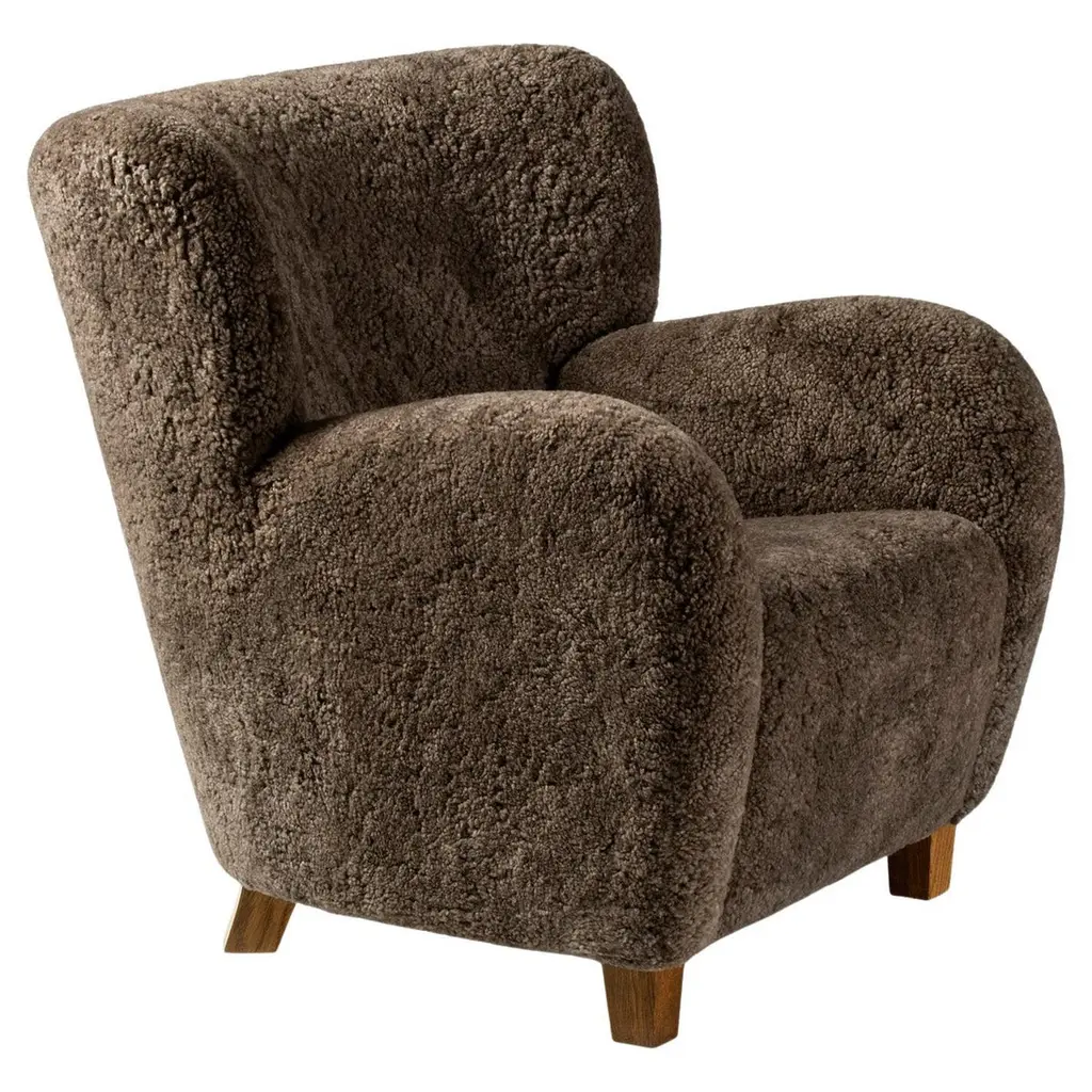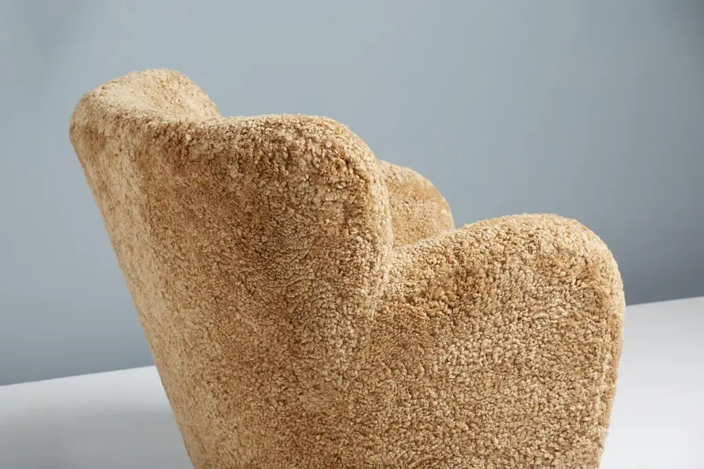 Dagmar design - Karu armchair. A reproduction armchair in the 1940s Danish modern style.The Karu chair is a contemporary update of a classic design first produced in Finland by the HAIMI OY company in the early 1950s. The inviting curved arms and subtle winged back are the epitome of the post-war Nordic aesthetic. Karu offers perfect proportions for a bedroom or living room chair. The chair legs are available in oiled oak, fumed oak, or walnut. The chairs are upholstered in luxurious Australian sheepskin available in a range of colours. Other fabric options are also available by request.Each chair measures:Width 80cm (31.5")Depth 85cm (33.5")Height 84cm (33")Seat Height 42cm (16.5")