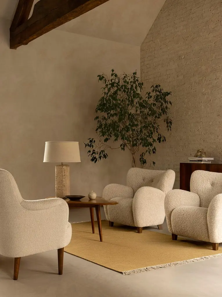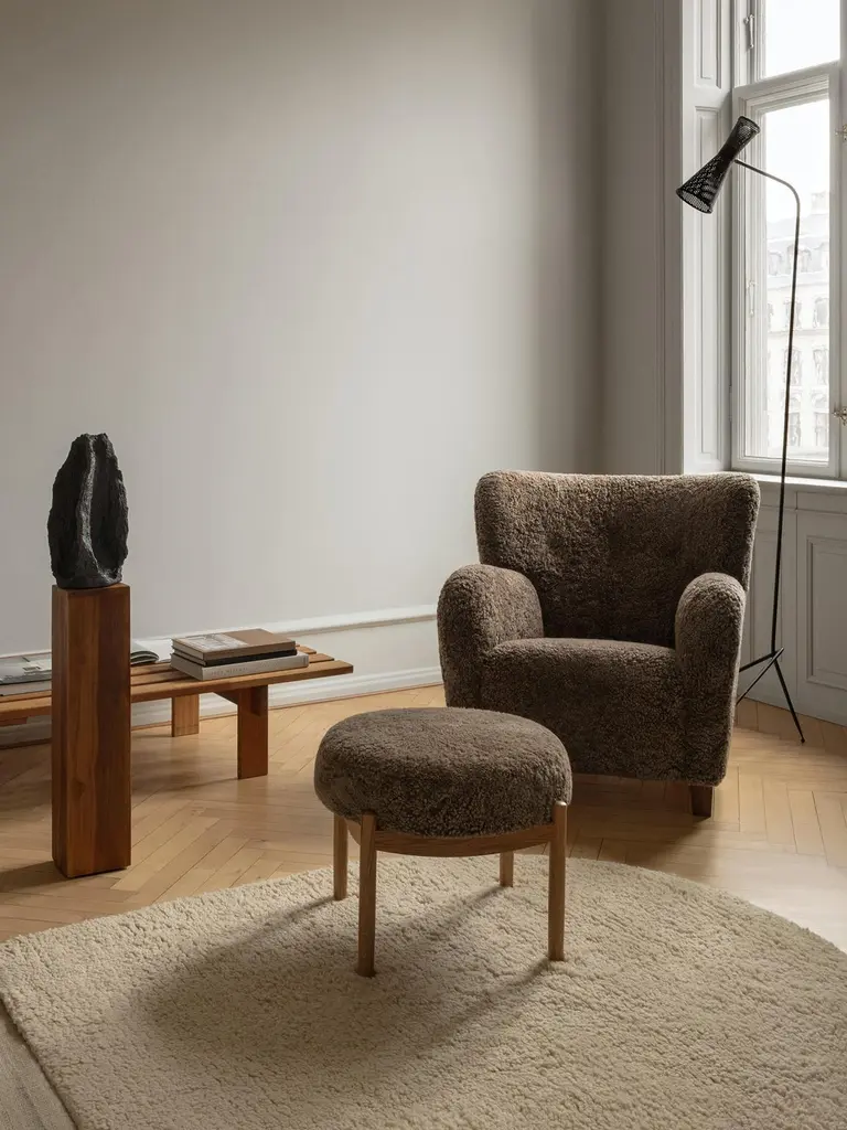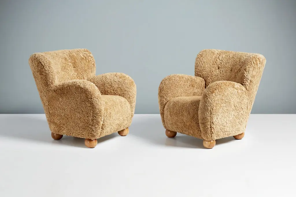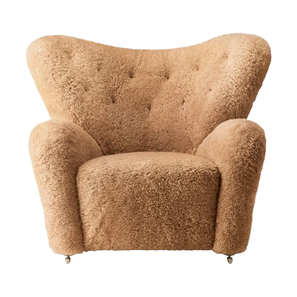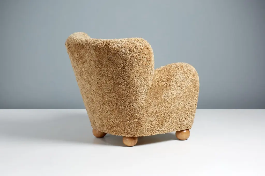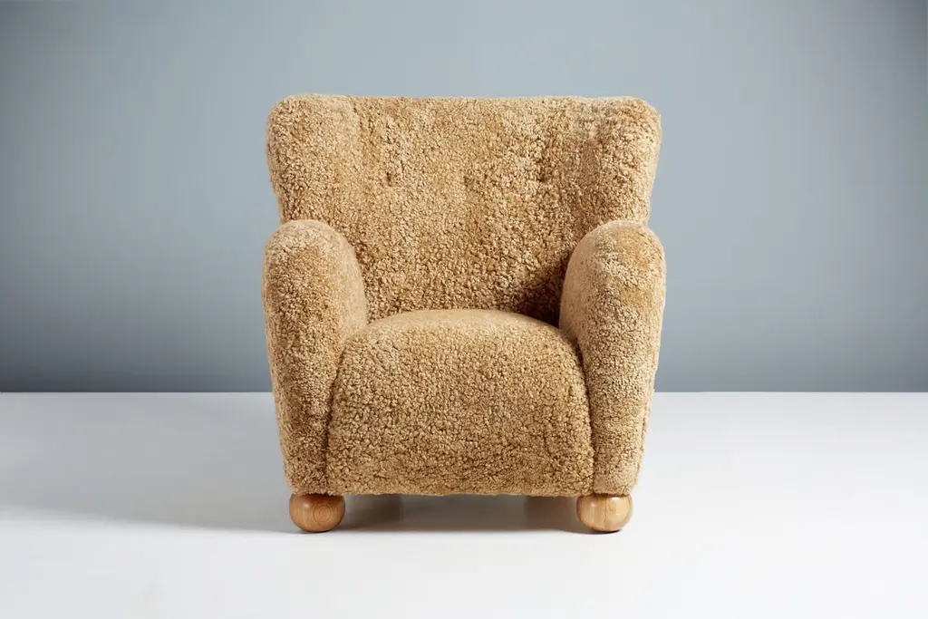 Dagmar design - Karu armchair. A reproduction armchair in the 1940s Danish modern style.The Karu chair is a contemporary update of a classic design first produced in Finland by the HAIMI OY company in the early 1950s. The inviting curved arms and subtle winged back are the epitome of the post-war Nordic aesthetic. Karu offers perfect proportions for a bedroom or living room chair. The chair legs are available in oiled oak, fumed oak, or walnut. The chairs are upholstered in luxurious Australian sheepskin available in a range of colours. Other fabric options are also available by request.Each chair measures:Width 80cm (31.5")Depth 85cm (33.5")Height 84cm (33")Seat Height 42cm (16.5")