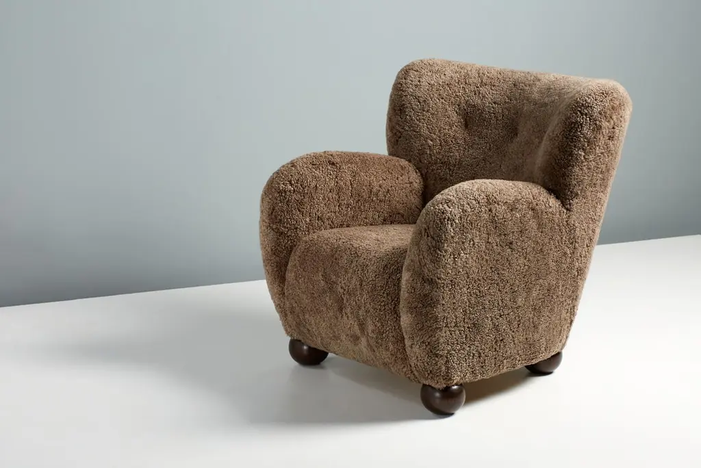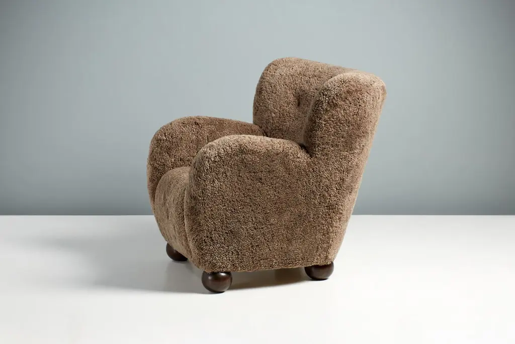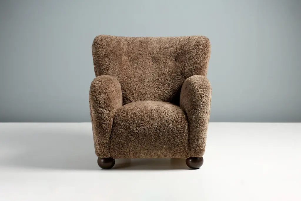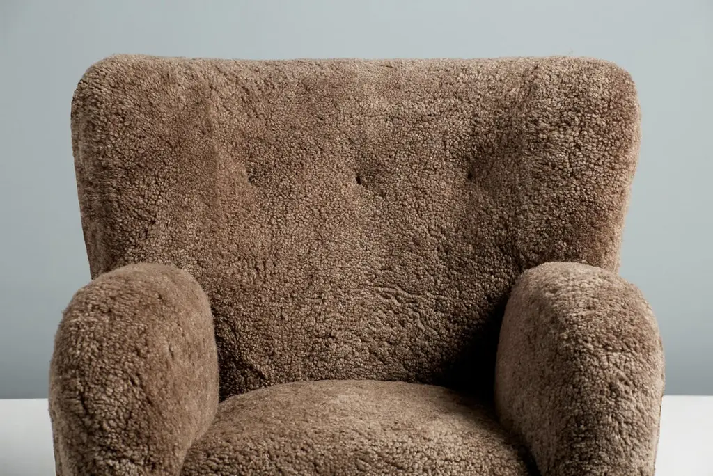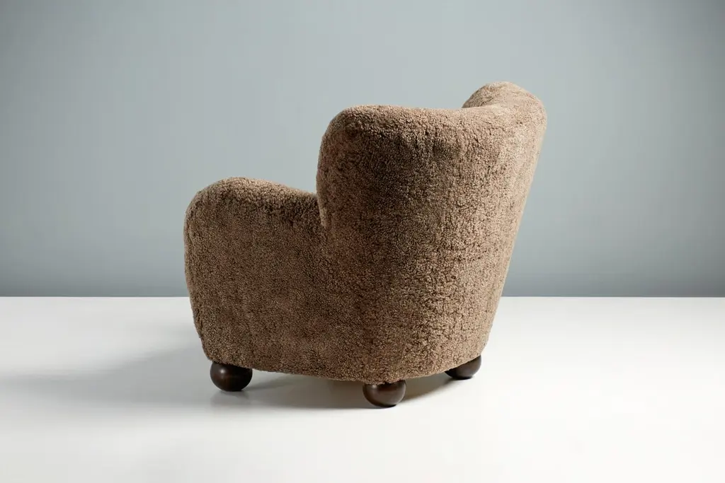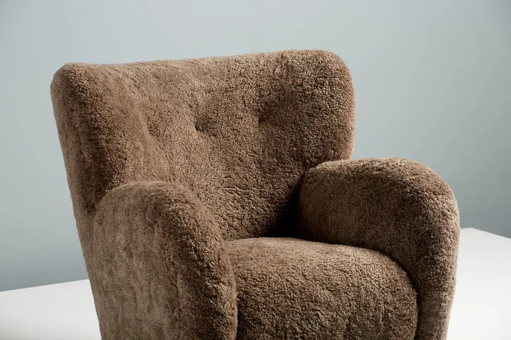 A reproduction armchair in the 1940s Danish modern style.The Karu chair is a contemporary update of a classic design first produced in Finland by the HAIMI OY company in the early 1950s. The inviting curved arms and subtle winged back are the epitome of the post-war Nordic aesthetic. Karu offers perfect proportions for a bedroom or living room chair. The chair legs are available in oiled oak, fumed oak, or walnut. The chairs are upholstered in luxurious Australian sheepskin available in a range of colours. Other fabric options are also available by request.Each chairs measures:Height of back 85 cmWidth at arms 84 cmTotal depth 90 cmSeat height 43cm.