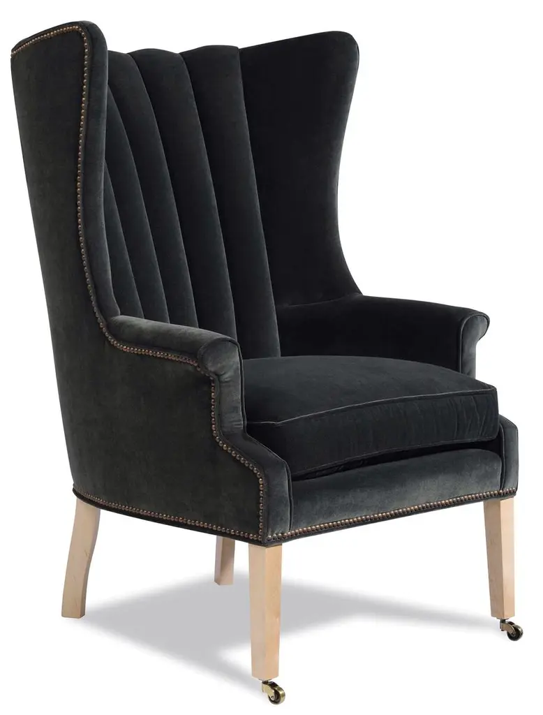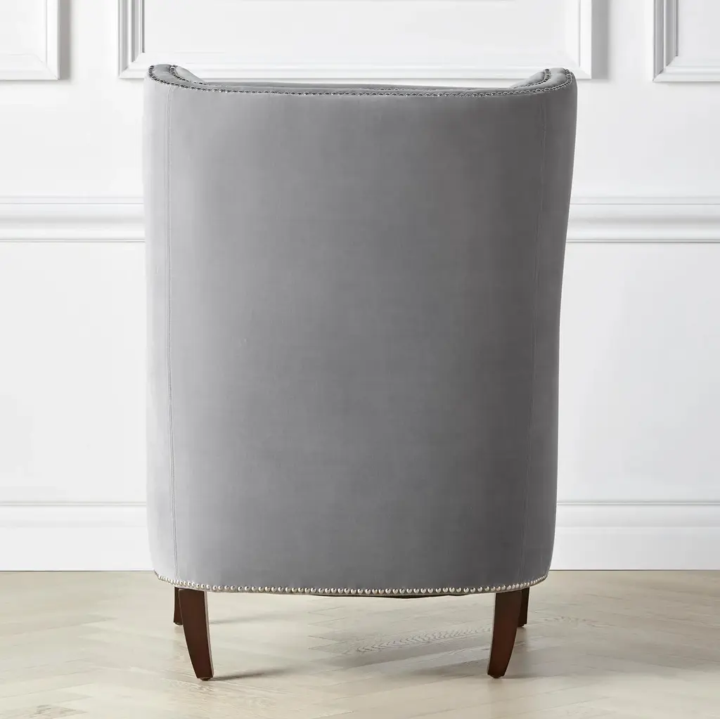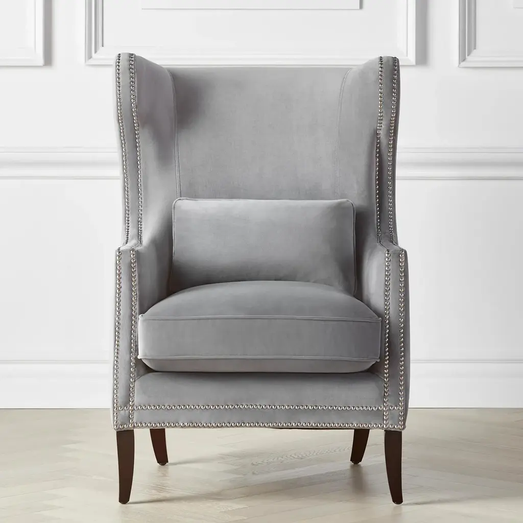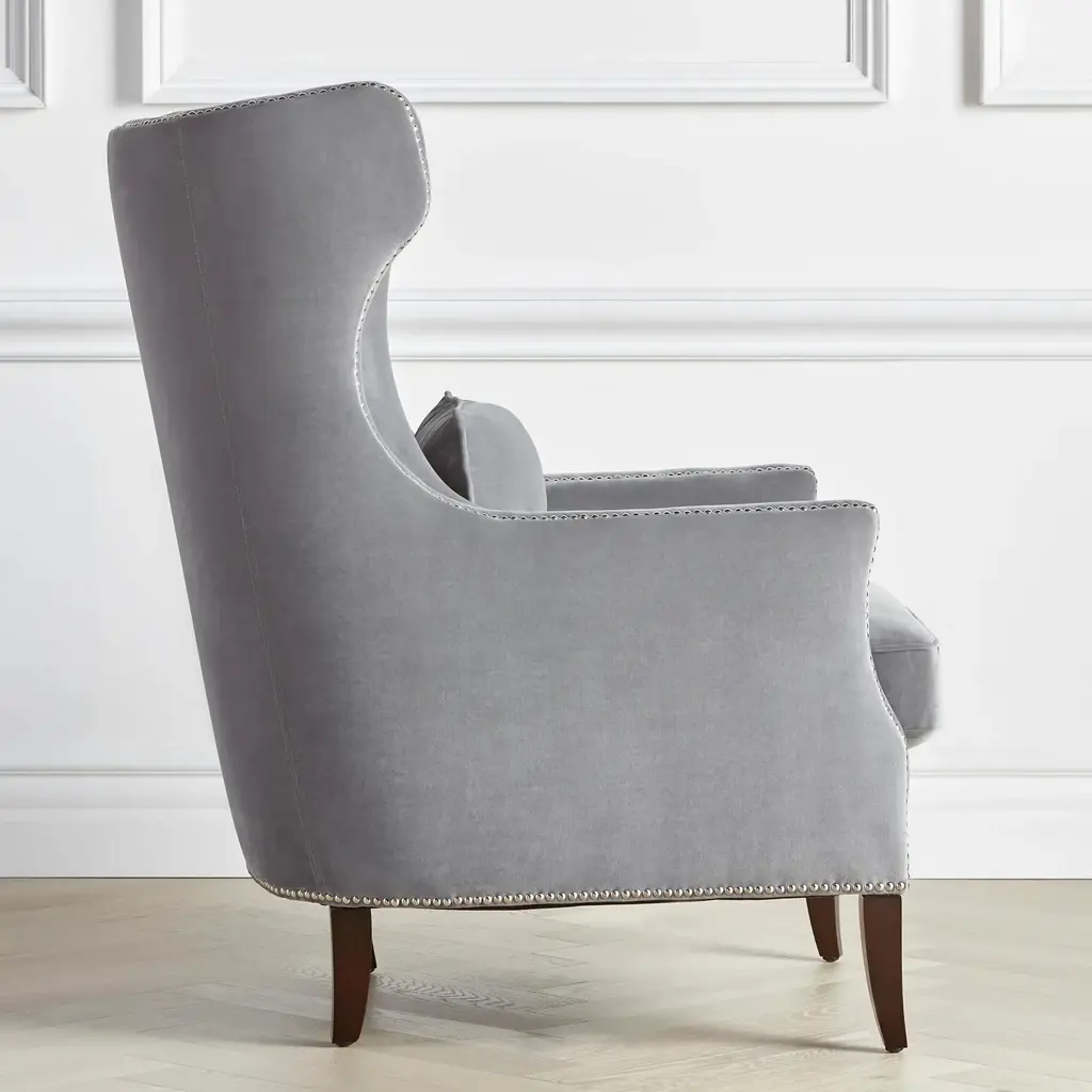 Double rows of hand-applied nailhead trim accentuate the curvy silhouette of our Davis accent chair. Designed with a modern wingback frame and upholstered in plush velvet, its generous proportions, rounded back, and removeable lumbar pillow ensure this piece is as comfortable as it is stylish. Shown in Royale Plush Velvet Ash.Z Gallerie ExclusiveCustom Orders: Custom Furniture is manufactured especially for you, which is why we do not accept cancellations, exchanges, or returns.