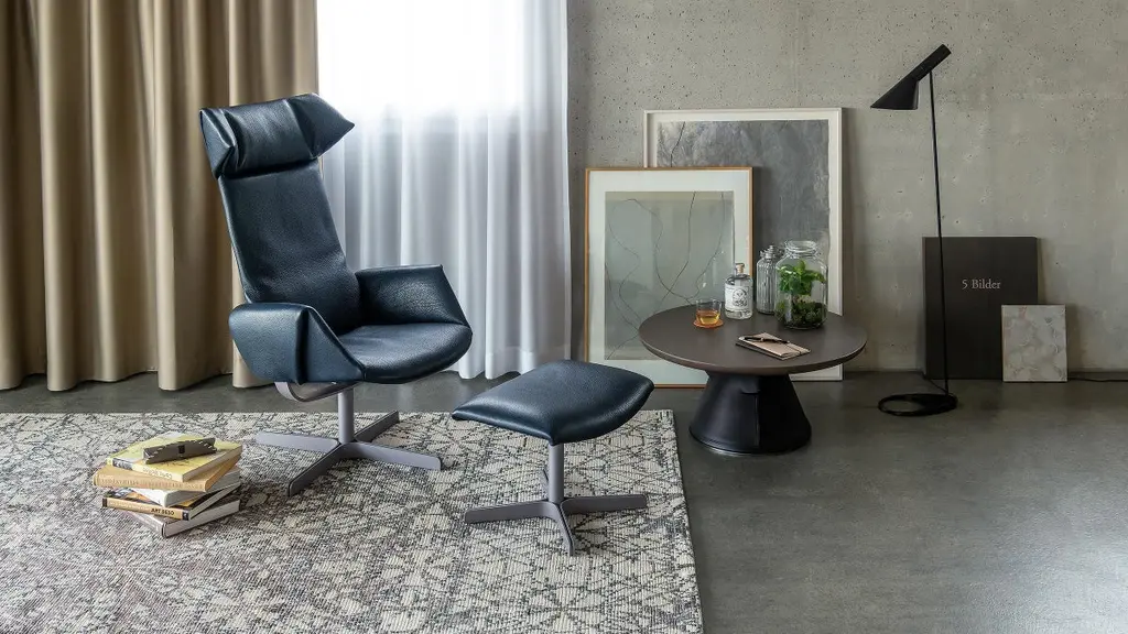 Revolutionary seating concept DS-343 is an armchair that moves when the person seated moves – because the object is constructed not with a classic seating surface that stops at the backrest, but with one that extends to the height of the pelvis. If one leans backwards, the backrest element, from pelvic height on up, automatically moves along with the user – without any mechanical effort, and solely as a result of the change in the posture of the person seated. And the design is equal to this revolutionary seating concept: the silhouette of the wing chair is defined by the skilful folding of the leather. Dimensionally stable Neck leather in thicknesses of up to 5 mm is skilfully processed by hand to ensure that it continuously cascades over the edges.We did not bring a designer on board to develop this wing chair – with all due respect: we are not exactly short on expertise in this area. Still, we found that thinking outside the box helps us better understand the human body, its features and needs. So we looked around in the fields of science, medicine and orthopedics and brought an expert on board. Star physical therapist Bart Van der Heyden drew our attention to the fact that the human body normally maintains a dynamic equilibrium when forces act on it. Yet the pivot point of swaying chairs does not follow our axis of motion. Van der Heyden came up with a brilliant solution to this problem: the seat shell on this armchair is extended to pelvic height to create an ergonomic sitting posture. If you lean backwards, only the upper part of the backrest moves. This provides support to the spine, and the chest opens. In addition to the backrest, the seat shell tilts backwards to achieve an even better lying and relaxing position. This new movement mechanism is patented – so you can enjoy our seating revolution to the fullest.Additional information:Material: LeatherCategory: Neck - Schiefer Type: Natural Nappa leatherThickness: up to 5 mmCharacteristics: An innate natural quality with an incomparably distinctive, even rustic, aura; it is a true eye-catcher – simply incomparable. A cover made from Neck requires an entire section of hide for each back, side and seating element. When joined, it creates a so-called optical stitch seam: a piece of art from De Sede craftspeople that requires unsurpassed skill.Dimensions: 70 W x 100 D x 120 H cmSeat height: 42 cmArmrest height: 58 cm.