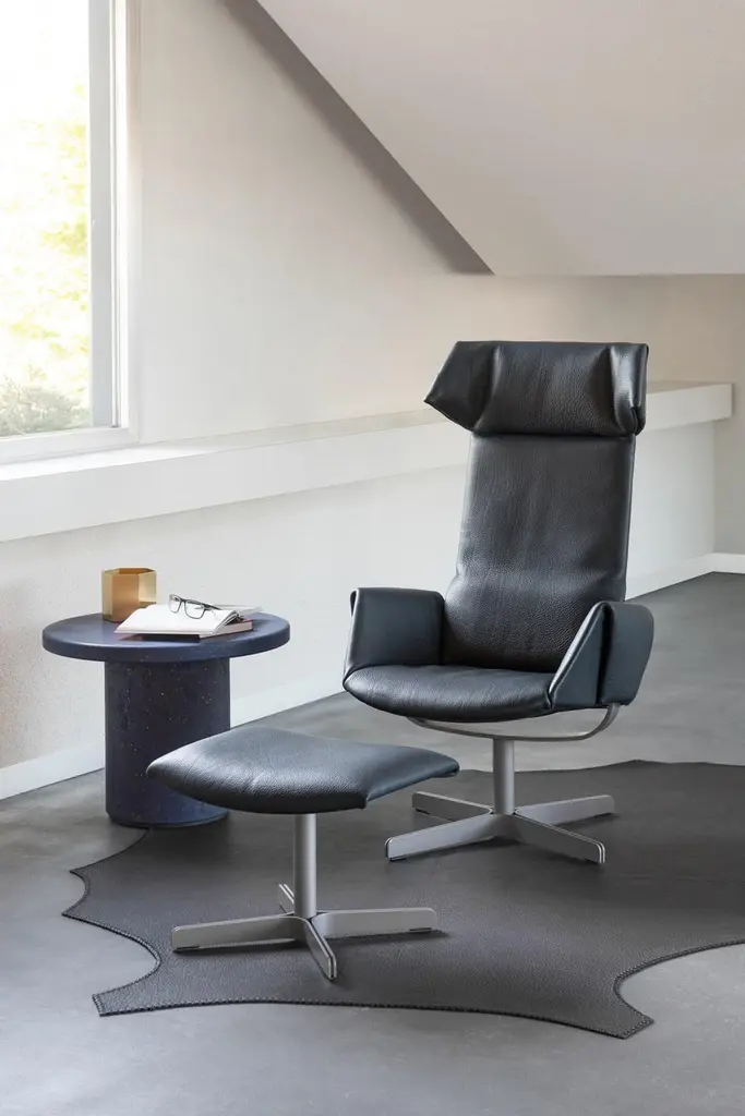 Revolutionary seating concept DS-343 is an armchair that moves when the person seated moves – because the object is constructed not with a classic seating surface that stops at the backrest, but with one that extends to the height of the pelvis. If one leans backwards, the backrest element, from pelvic height on up, automatically moves along with the user – without any mechanical effort, and solely as a result of the change in the posture of the person seated. And the design is equal to this revolutionary seating concept: the silhouette of the wing chair is defined by the skilful folding of the leather. Dimensionally stable Neck leather in thicknesses of up to 5 mm is skilfully processed by hand to ensure that it continuously cascades over the edges.We did not bring a designer on board to develop this wing chair – with all due respect: we are not exactly short on expertise in this area. Still, we found that thinking outside the box helps us better understand the human body, its features and needs. So we looked around in the fields of science, medicine and orthopedics and brought an expert on board. Star physical therapist Bart Van der Heyden drew our attention to the fact that the human body normally maintains a dynamic equilibrium when forces act on it. Yet the pivot point of swaying chairs does not follow our axis of motion. Van der Heyden came up with a brilliant solution to this problem: the seat shell on this armchair is extended to pelvic height to create an ergonomic sitting posture. If you lean backwards, only the upper part of the backrest moves. This provides support to the spine, and the chest opens. In addition to the backrest, the seat shell tilts backwards to achieve an even better lying and relaxing position. This new movement mechanism is patented – so you can enjoy our seating revolution to the fullest.Additional information:Material: LeatherCategory: Neck - Schiefer Type: Natural Nappa leatherThickness: up to 5 mmCharacteristics: An innate natural quality with an incomparably distinctive, even rustic, aura; it is a true eye-catcher – simply incomparable. A cover made from Neck requires an entire section of hide for each back, side and seating element. When joined, it creates a so-called optical stitch seam: a piece of art from De Sede craftspeople that requires unsurpassed skill.Dimensions: 70 W x 100 D x 120 H cmSeat height: 42 cmArmrest height: 58 cm.