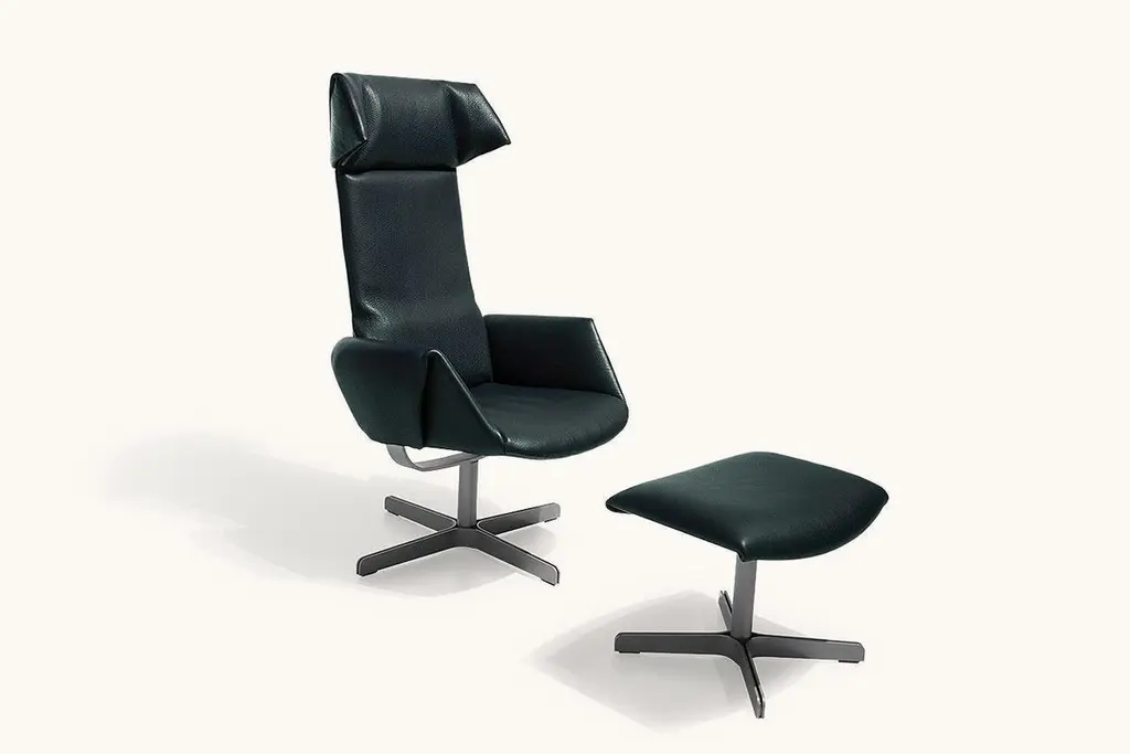 Revolutionary seating concept DS-343 is an armchair that moves when the person seated moves – because the object is constructed not with a classic seating surface that stops at the backrest, but with one that extends to the height of the pelvis. If one leans backwards, the backrest element, from pelvic height on up, automatically moves along with the user – without any mechanical effort, and solely as a result of the change in the posture of the person seated. And the design is equal to this revolutionary seating concept: the silhouette of the wing chair is defined by the skilful folding of the leather. Dimensionally stable Neck leather in thicknesses of up to 5 mm is skilfully processed by hand to ensure that it continuously cascades over the edges.We did not bring a designer on board to develop this wing chair – with all due respect: we are not exactly short on expertise in this area. Still, we found that thinking outside the box helps us better understand the human body, its features and needs. So we looked around in the fields of science, medicine and orthopedics and brought an expert on board. Star physical therapist Bart Van der Heyden drew our attention to the fact that the human body normally maintains a dynamic equilibrium when forces act on it. Yet the pivot point of swaying chairs does not follow our axis of motion. Van der Heyden came up with a brilliant solution to this problem: the seat shell on this armchair is extended to pelvic height to create an ergonomic sitting posture. If you lean backwards, only the upper part of the backrest moves. This provides support to the spine, and the chest opens. In addition to the backrest, the seat shell tilts backwards to achieve an even better lying and relaxing position. This new movement mechanism is patented – so you can enjoy our seating revolution to the fullest.Additional information:Material: LeatherCategory: Neck - Schiefer Type: Natural Nappa leatherThickness: up to 5 mmCharacteristics: An innate natural quality with an incomparably distinctive, even rustic, aura; it is a true eye-catcher – simply incomparable. A cover made from Neck requires an entire section of hide for each back, side and seating element. When joined, it creates a so-called optical stitch seam: a piece of art from De Sede craftspeople that requires unsurpassed skill.Dimensions: 70 W x 100 D x 120 H cmSeat height: 42 cmArmrest height: 58 cm.