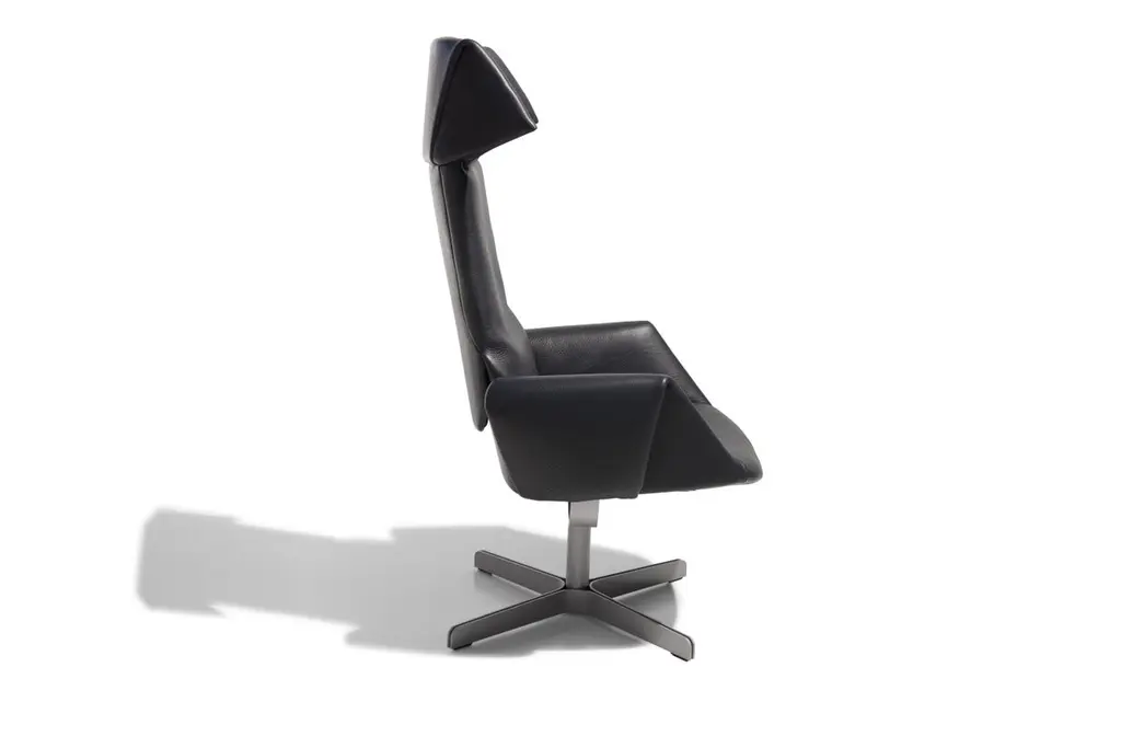 DS-343 armchair by De SedeDimensions: D 46 x W 70 x H 120 cm, with extension W 100Materials: steel, leatherPrices may change according to the chosen materials and size. Revolutionary seating conceptDS-343 is an armchair that moves when the person seated moves – because the object is constructed not with a classic seating surface that stops at the backrest, but with one that extends to the height of the pelvis. If one leans backwards, the backrest element, from pelvic height on up, automatically moves along with the user – without any mechanical effort, and solely as a result of the change in the posture of the person seated. And the design is equal to this revolutionary seating concept: the silhouette of the wing chair is defined by the skillful folding of the leather. Dimensionally stable Neck leather in thicknesses of up to 5 mm is skillfully processed by hand to ensure that it continuously cascades over the edges.De Sede has its origins in a small but skilled saddler's workshop in Klingnau, Switzerland. The craftsmen there committed themselves to transforming the best possible leather into seating furniture. Their years of experience and diligence enabled them to create handcrafted leather furniture of singular quality.In 1965, the family-run business became a joint-stock company called De Sede AG, but remained faithful to their original guiding principles.The company developed rapidly from this moment onwards: top designers of international caliber were brought on board to create seating furniture, additional manufacturing facilities were opened, and an international distribution network was established. Sophisticated designs that skillfully integrate traditional and precise Swiss workmanship swiftly gained the brand an international reputation.Today, De Sede AG presents itself as a leading manufacturer of exclusive leather furniture. Out of the original small workshop, a company has emerged that employs over 110 people and distributes furniture in more than 69 countries, including the United States and Russia, the GCC countries, and even emerging markets such as China and Brazil.