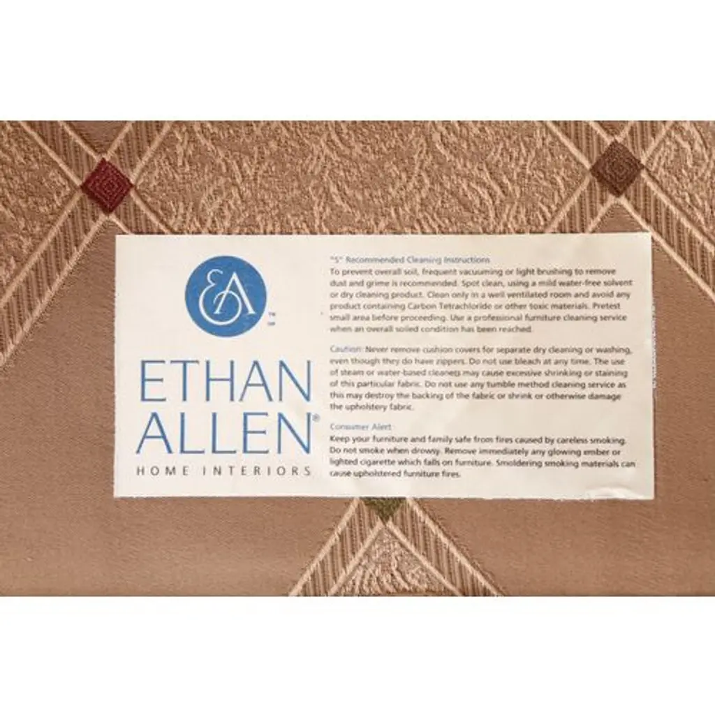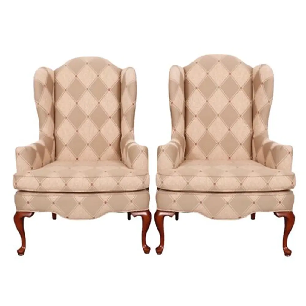 A pair of Queen Anne style wingback chairs made by Ethan Allan. Elegantly curved wings flow into outward rolled, button topped arms, which frame a trapezoid shaped seat. Upholstered throughout in a diamond embossed taupe brocade detailed with brown, sage and wine colored squares. Restrained cabriole legs in front finish in pad feet. Dimensions per chair. Seat height 20", arm height 24.75".
