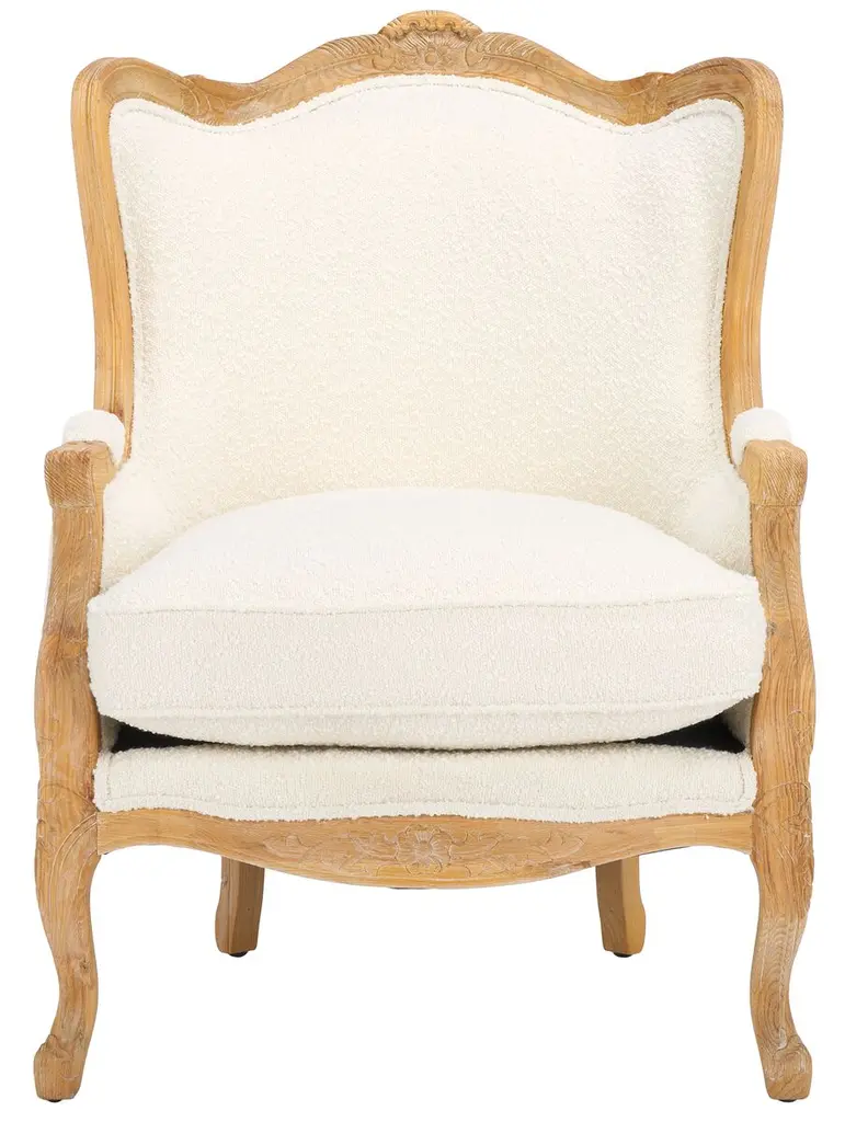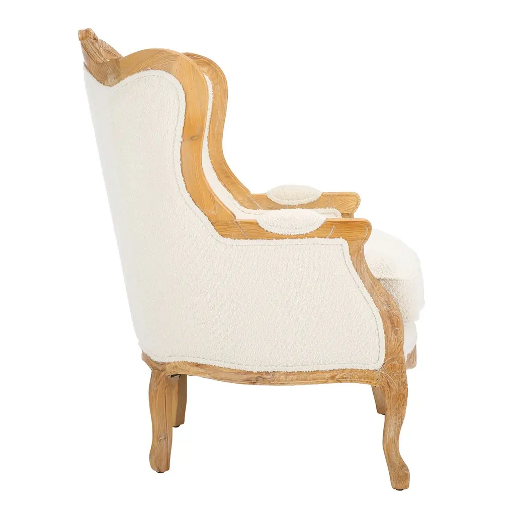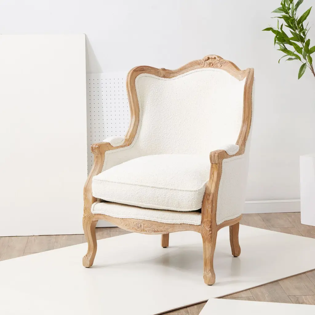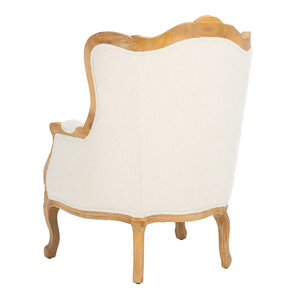 Replete with detailed carving, exposed wood frame, and a traditional camelback shape with wing arms, the Fallon Wing Boucle Chair is a romantic classic. Inspired by the 18th century bergère, this chair conjures images of wonderful French chateaux and the refined noble lifestyle the period represented.