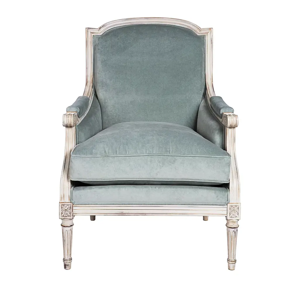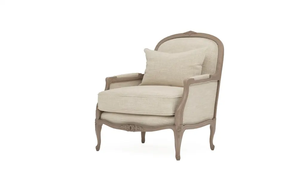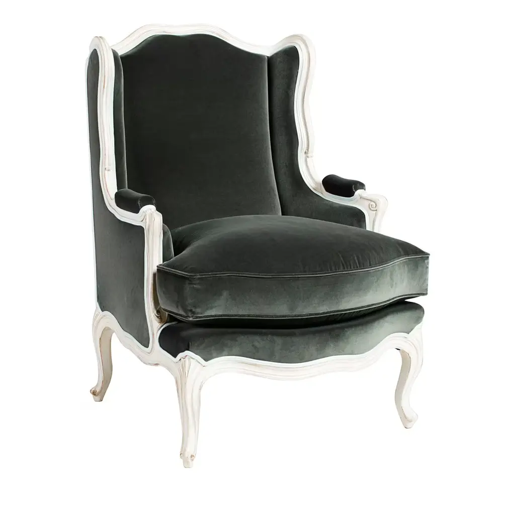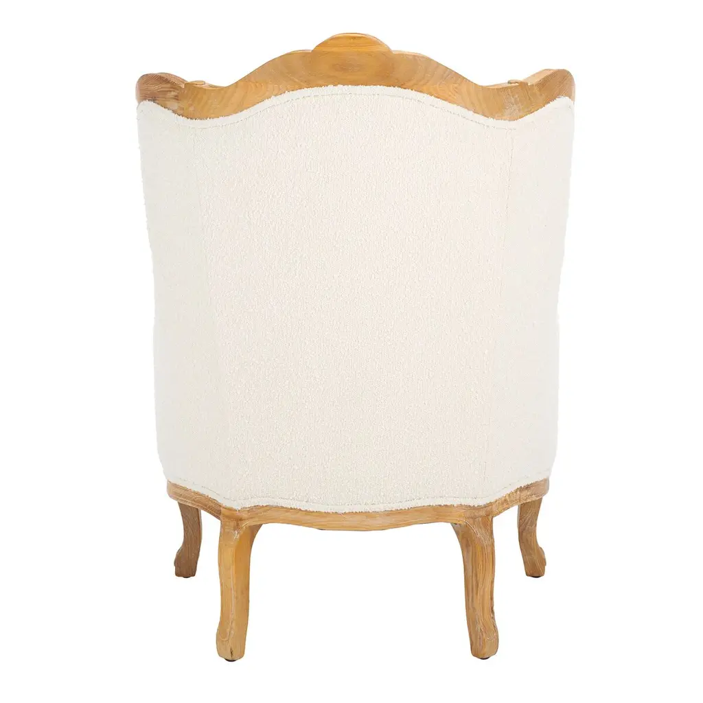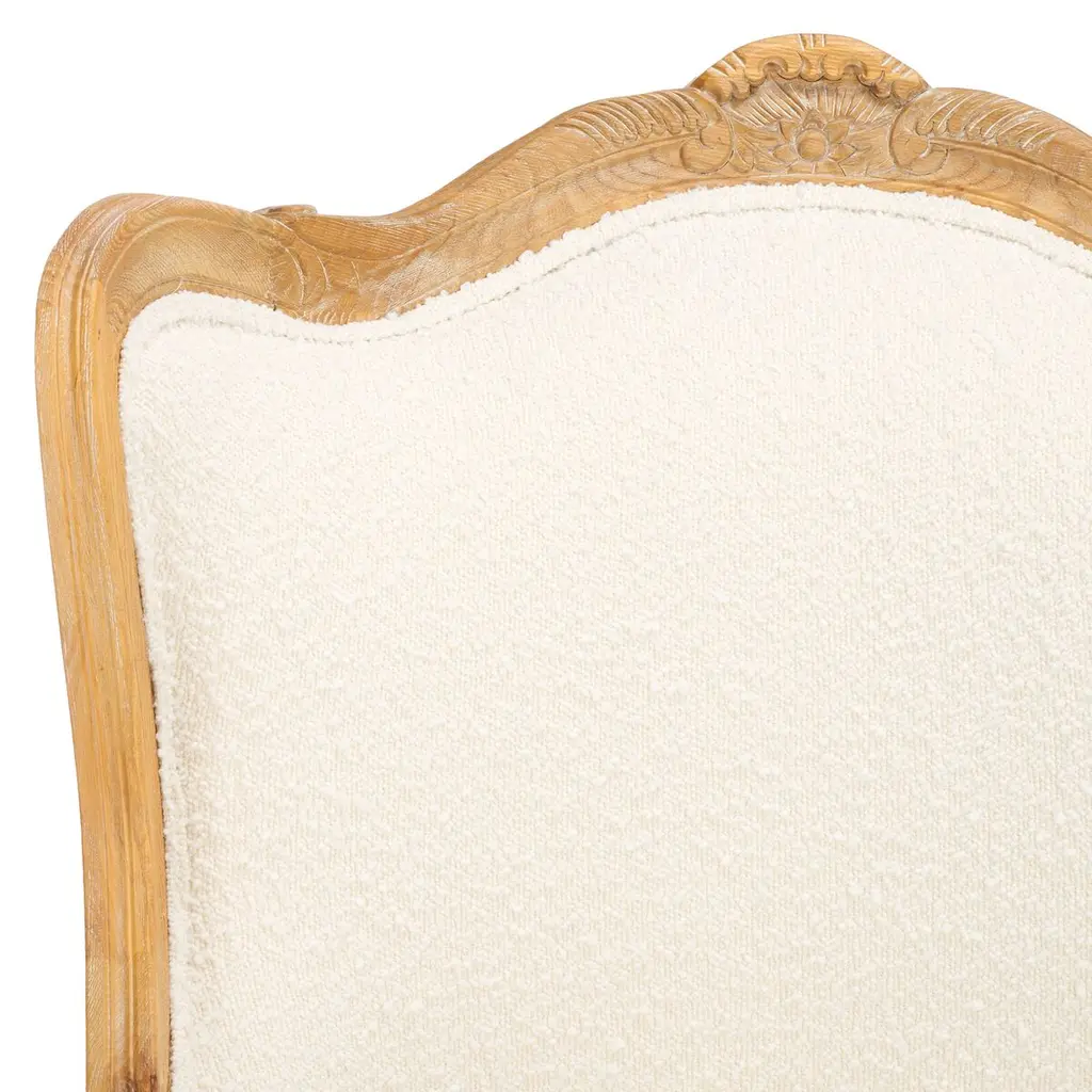 Replete with detailed carving, exposed wood frame, and a traditional camelback shape with wing arms, the Fallon Wing Boucle Chair is a romantic classic. Inspired by the 18th century bergère, this chair conjures images of wonderful French chateaux and the refined noble lifestyle the period represented.