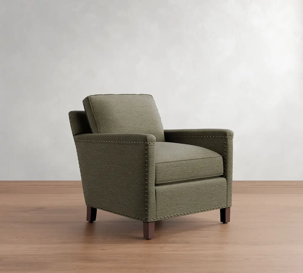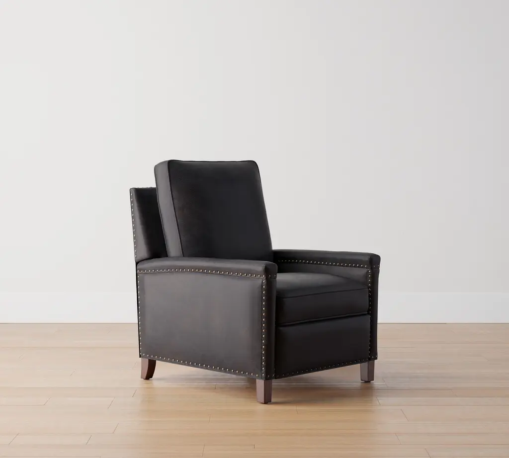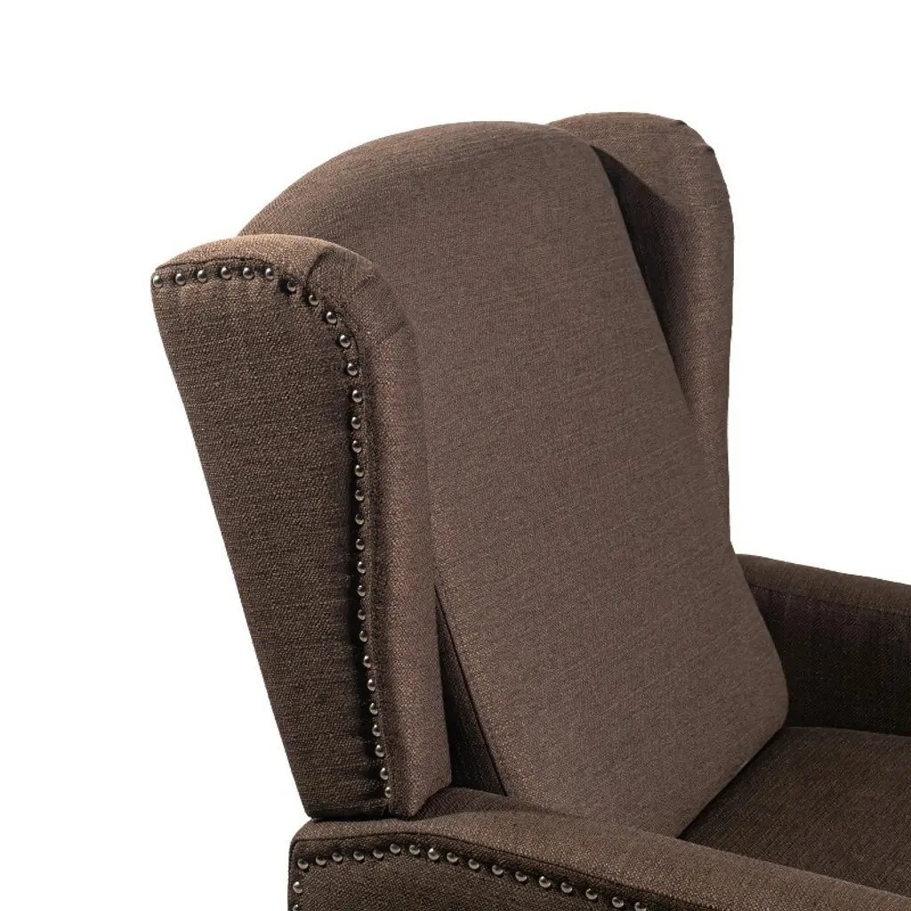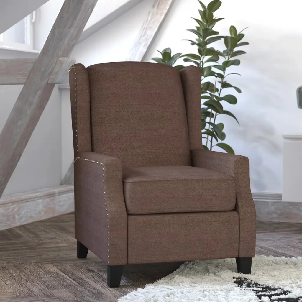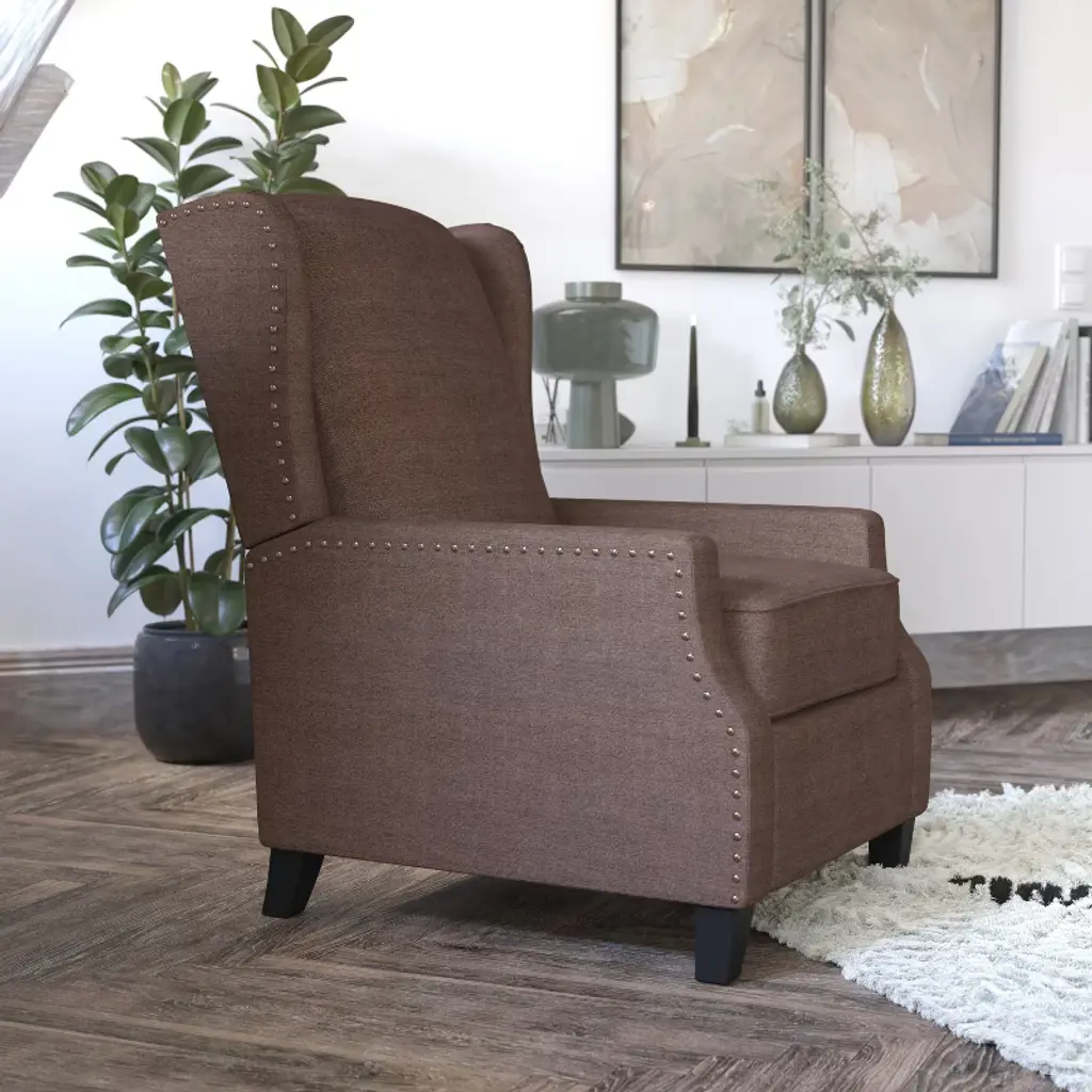 Old school tradition meets modern sophistication in this newly designed slim silhouette push back recliner. Featuring brown polyester fabric upholstery, straight arms, and accent nailhead trim, this living room recliner is just right for refreshing your space or furnishing a new home. High legs in a wood grain finish complete the look of this wingback chair and make floor cleaning easier. Beauty may be only skin deep but this reclining chair is more than a pretty face. A solid plywood core and steel frame with metal screw reinforcements hold up to 275 lbs. static weight to ensure a worry-free seating experience while the generously padded pocket spring seat provides comfort. Simply place your hands on the arms and push backwards letting your weight recline the back and raise the footrest. Assembly of your new recliner requires no tools and takes less than 10 minutes with the included illustrated assembly instructions. Spot clean with water and a neutral detergent to maintain the chairs appearance. Fixed plastic floor glides will prevent damage to your hard flooring surfaces if you bump the chair or choose to move it.