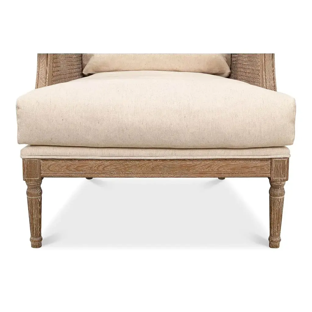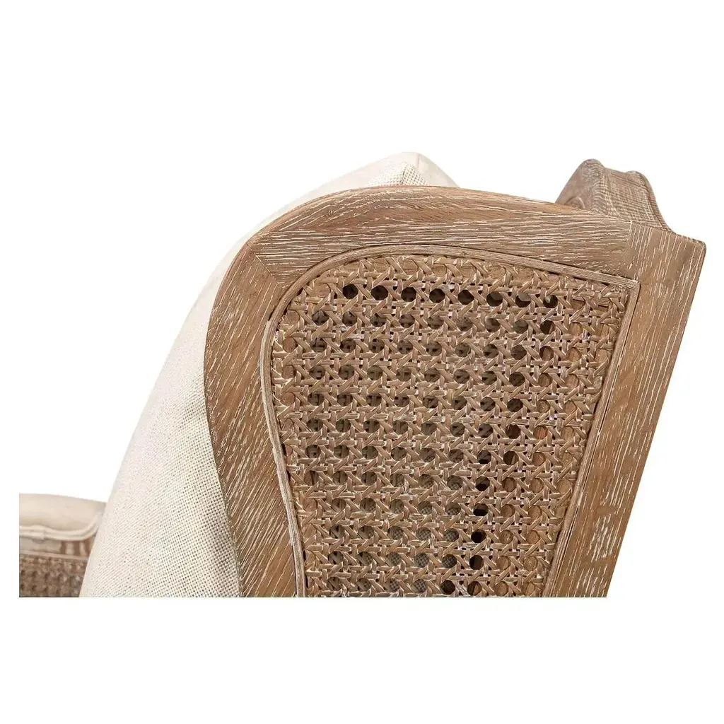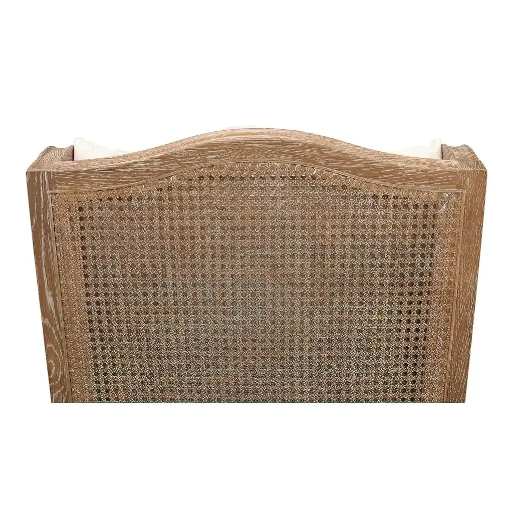 Louis XVI style whitewashed wingback armchair with cane back and sides. This beautiful chair has an ivory linen upholstered seat and back cushion. It is crafted from whitewashed oak and given a beige transitional finish. Dimensions: 29" W x 35" D x 38" H Seat - 25" W x 21" D x 18" H Arm - 25" H